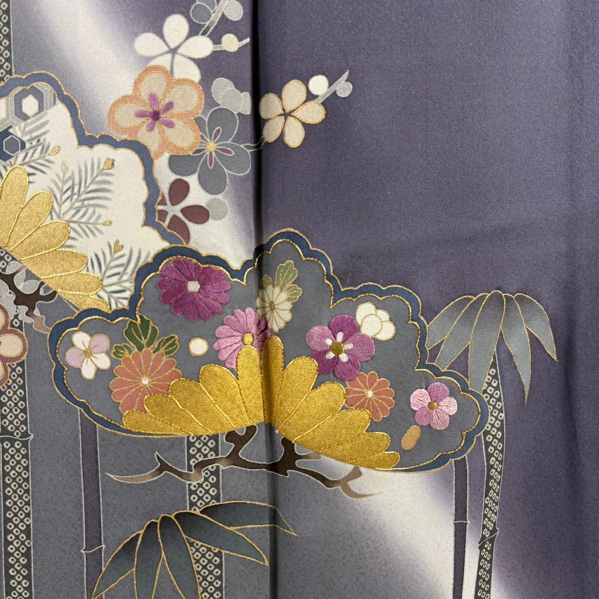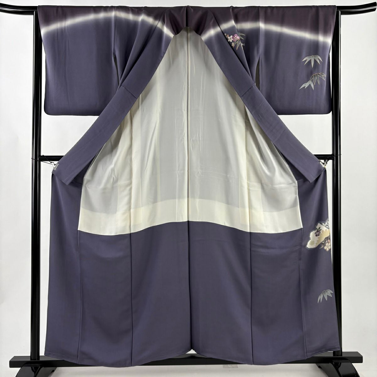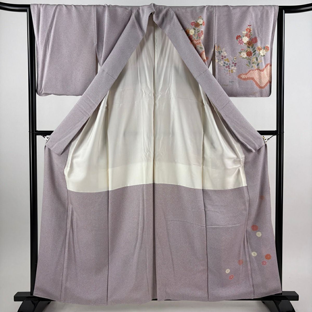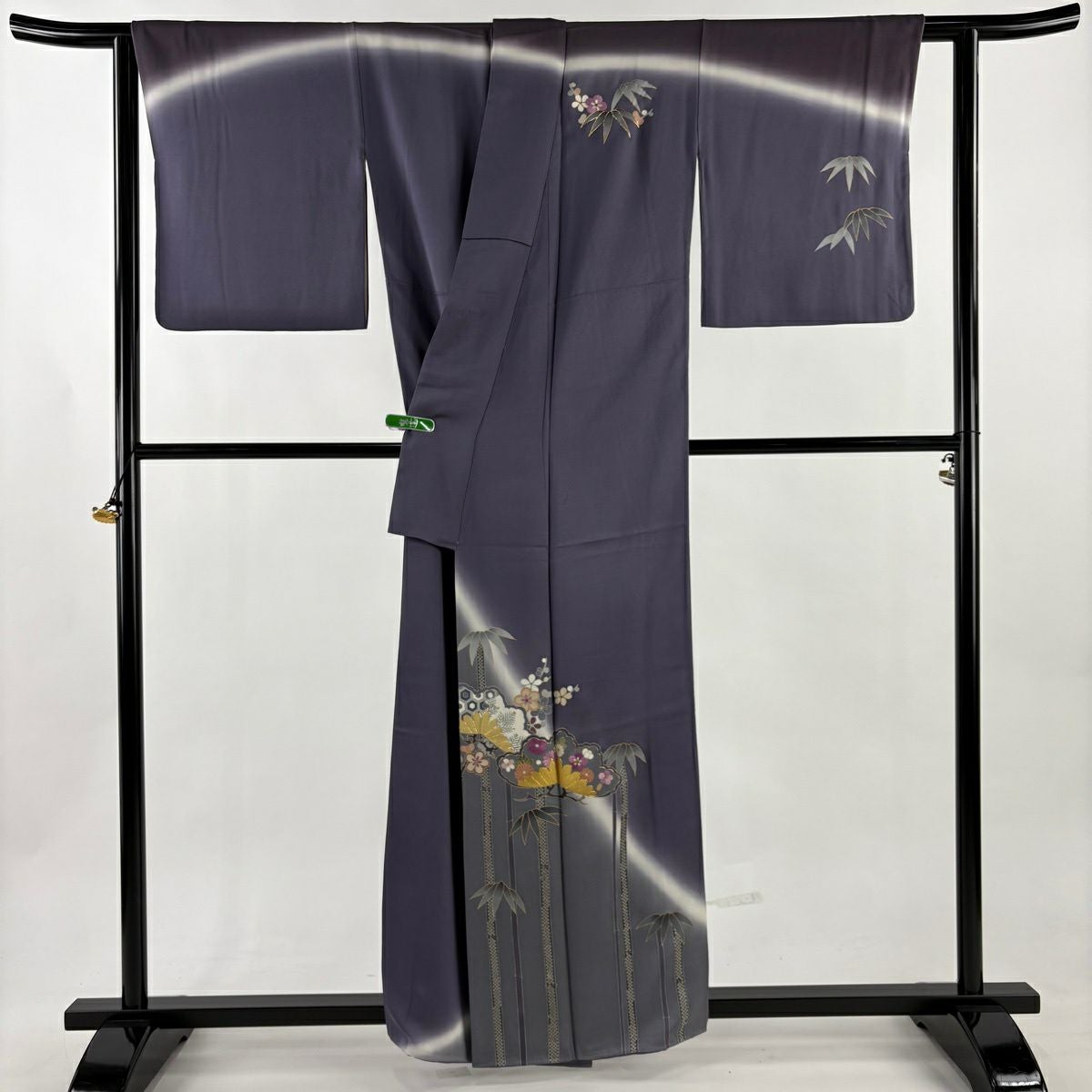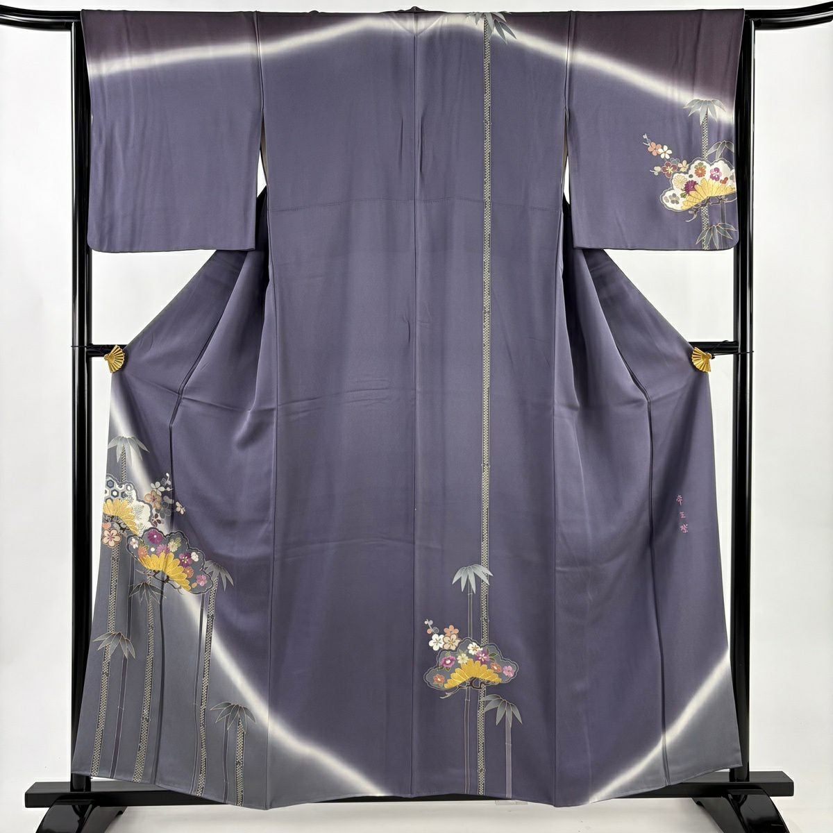 付下げ 身丈158cm 裄丈65.5cm M 袷 帝王紫 落款あり 松竹梅 菊 刺繍 金彩 灰紫 正絹 逸品