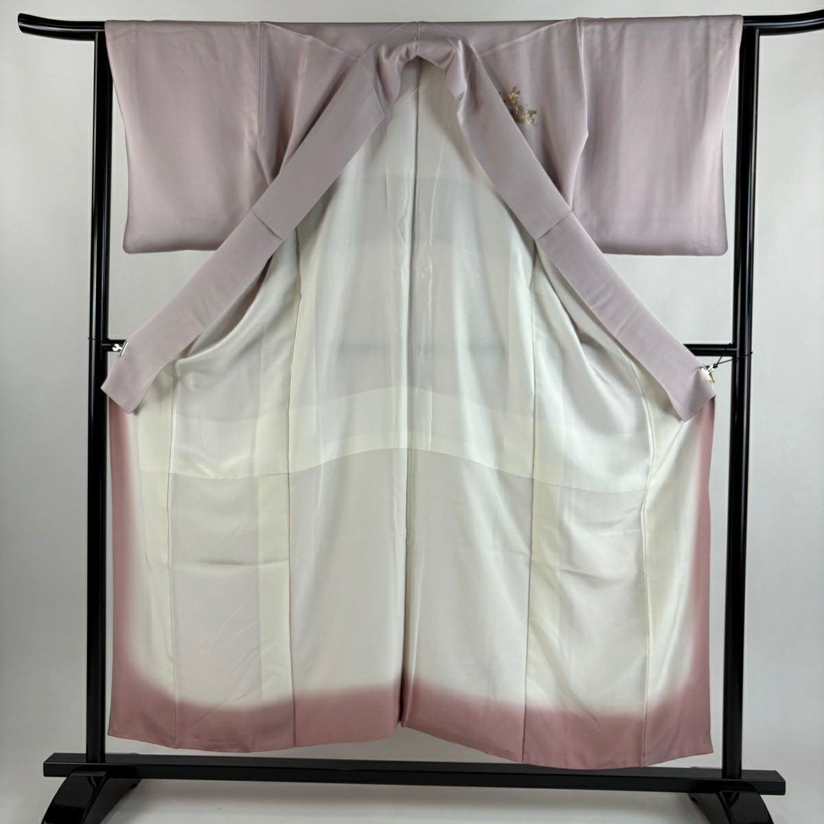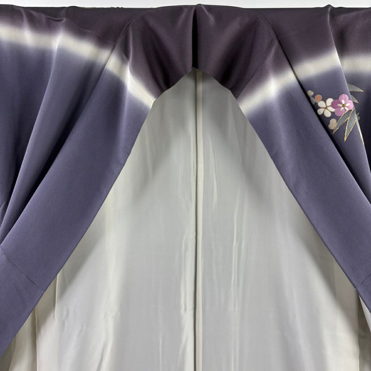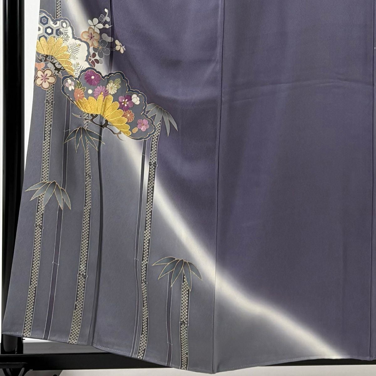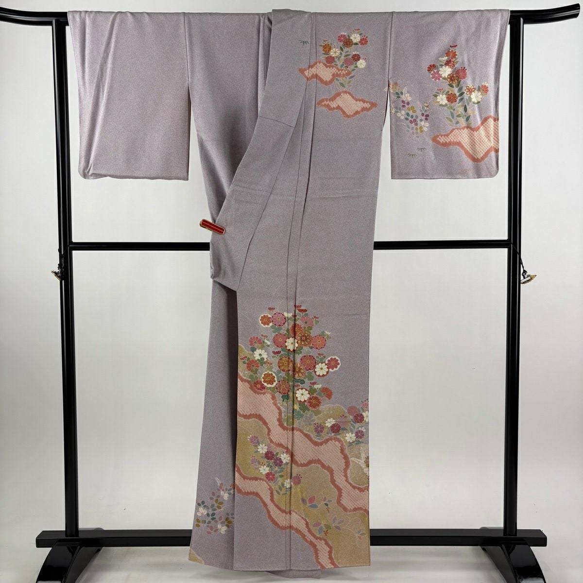 付下げ 身丈158cm 裄丈65.5cm M 袷 帝王紫 落款あり 松竹梅 菊 刺繍 金彩 灰紫 正絹 逸品