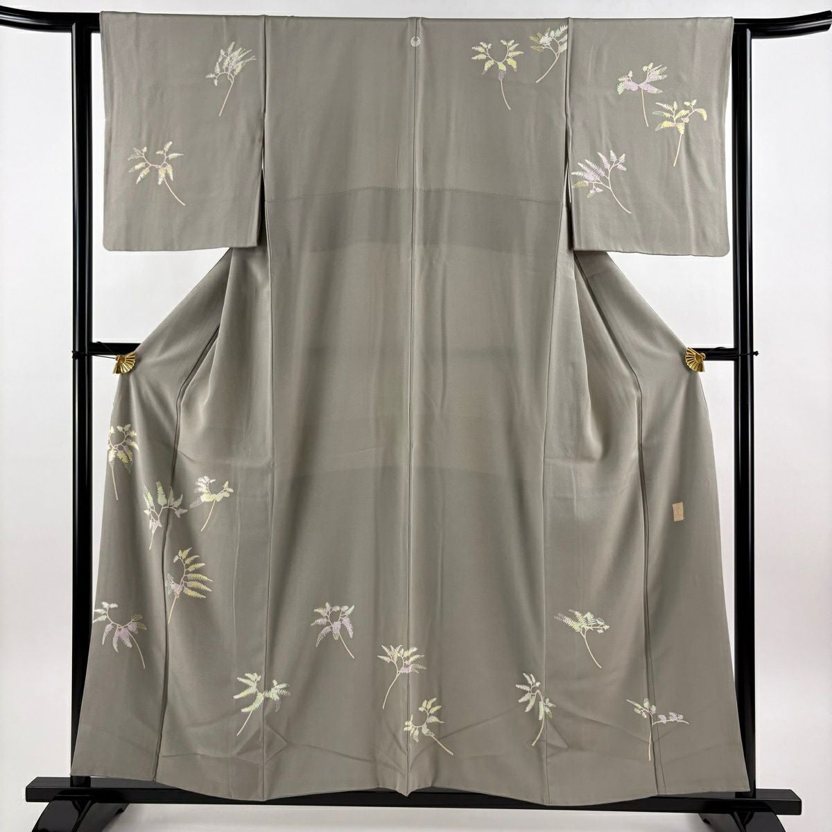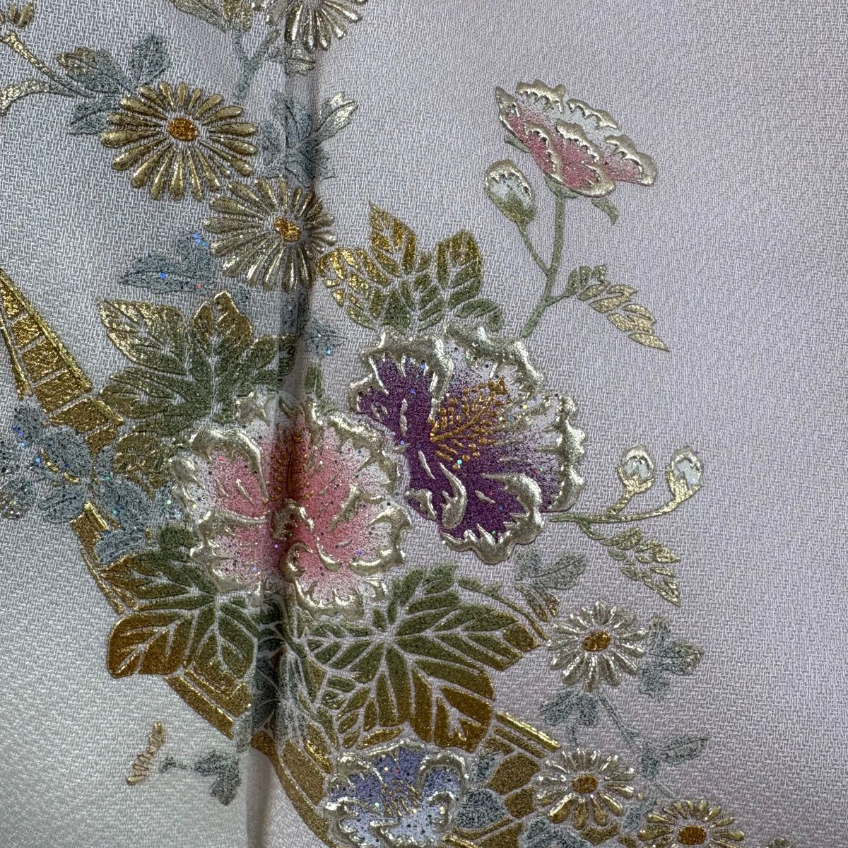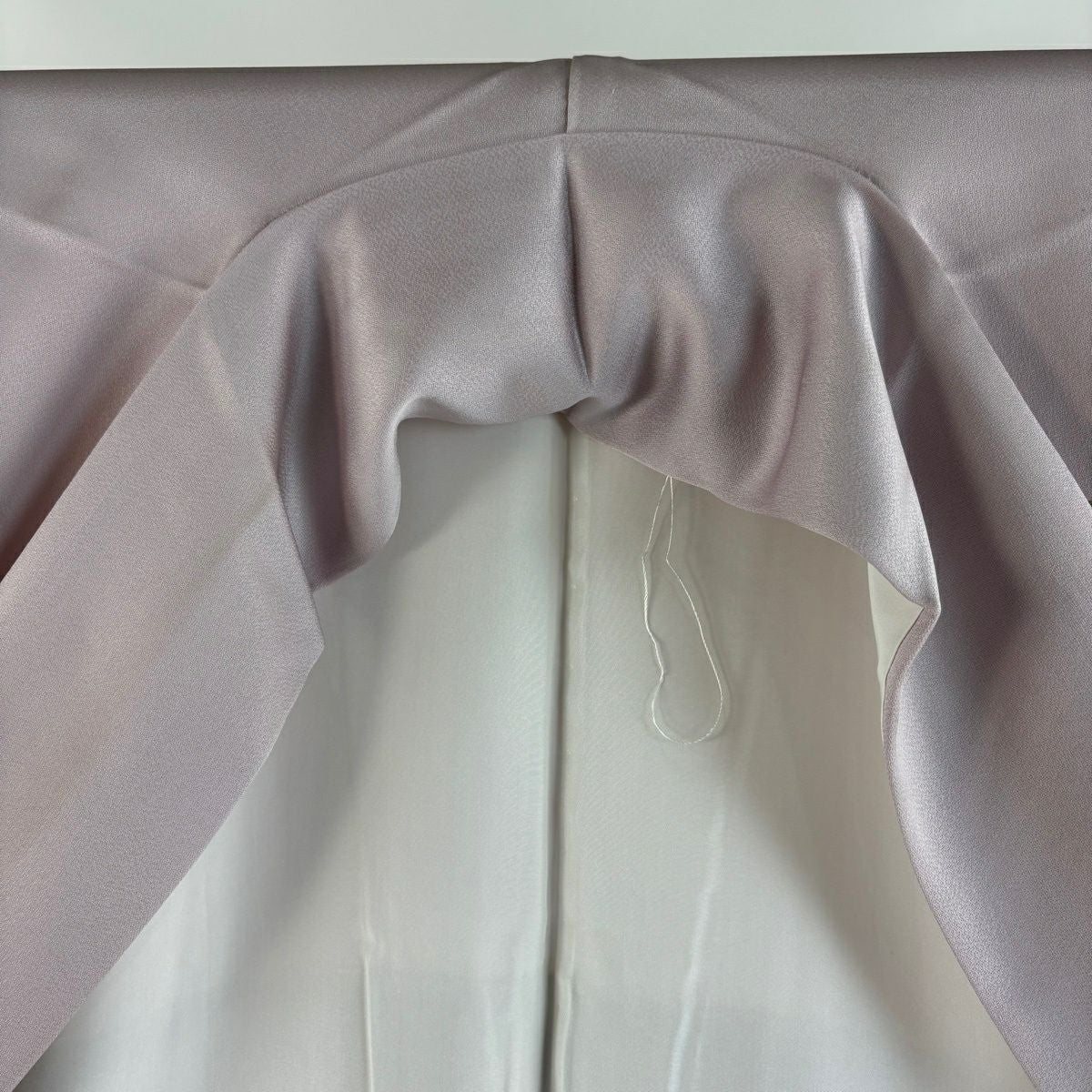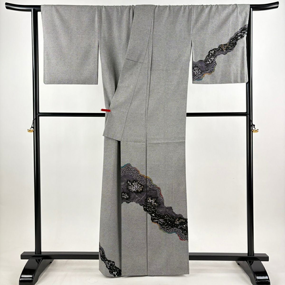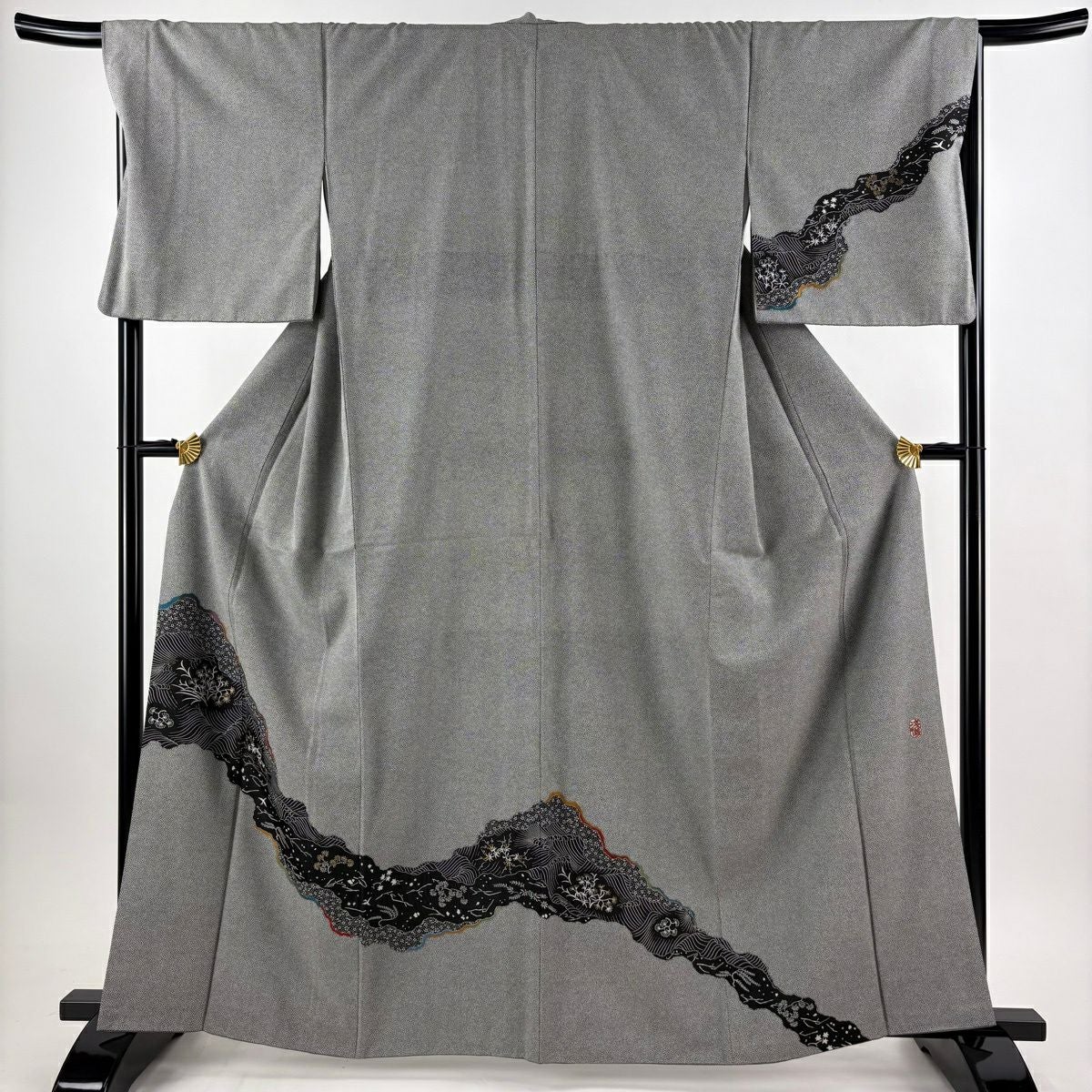 付下げ 身丈158cm 裄丈65.5cm M 袷 帝王紫 落款あり 松竹梅 菊 刺繍 金彩 灰紫 正絹 逸品