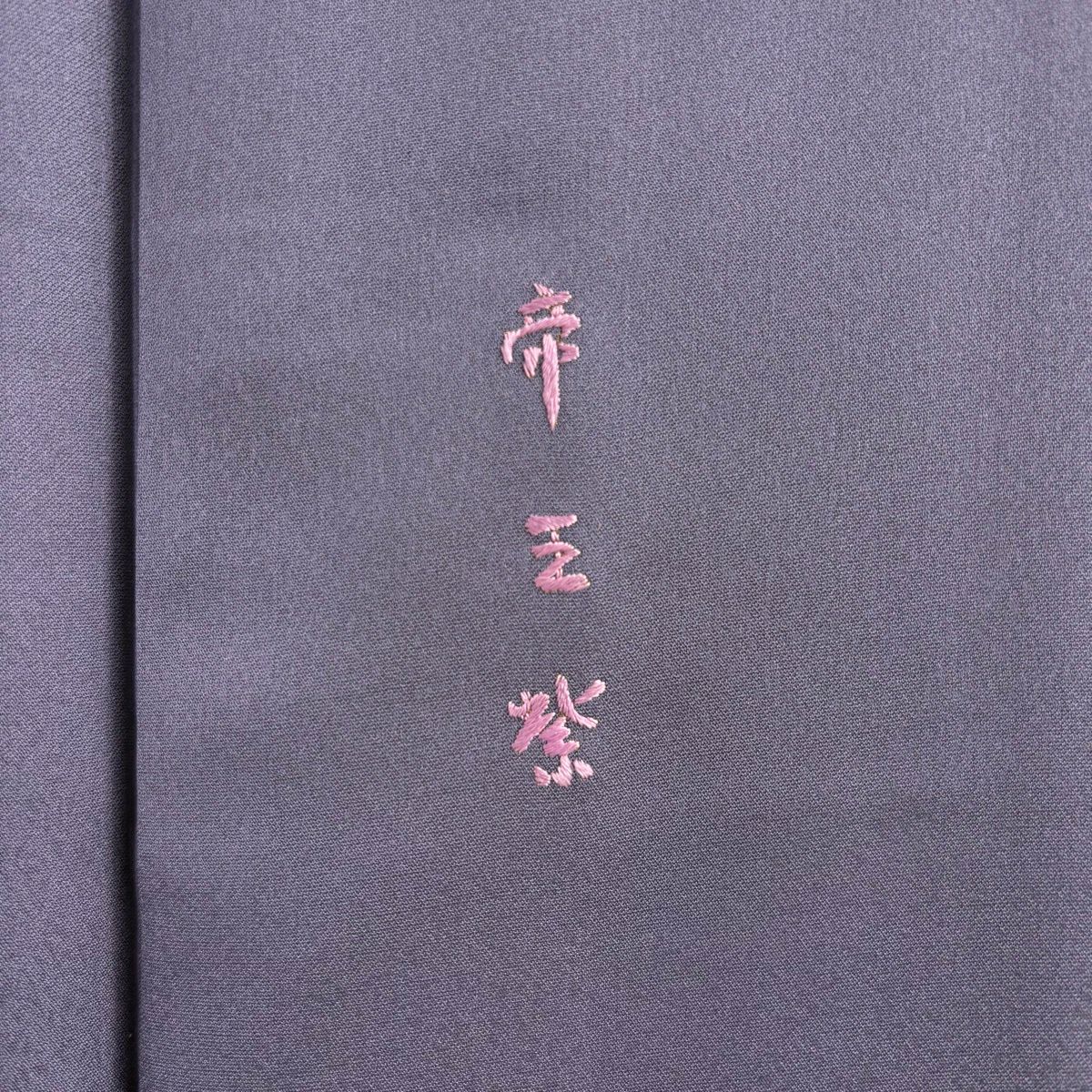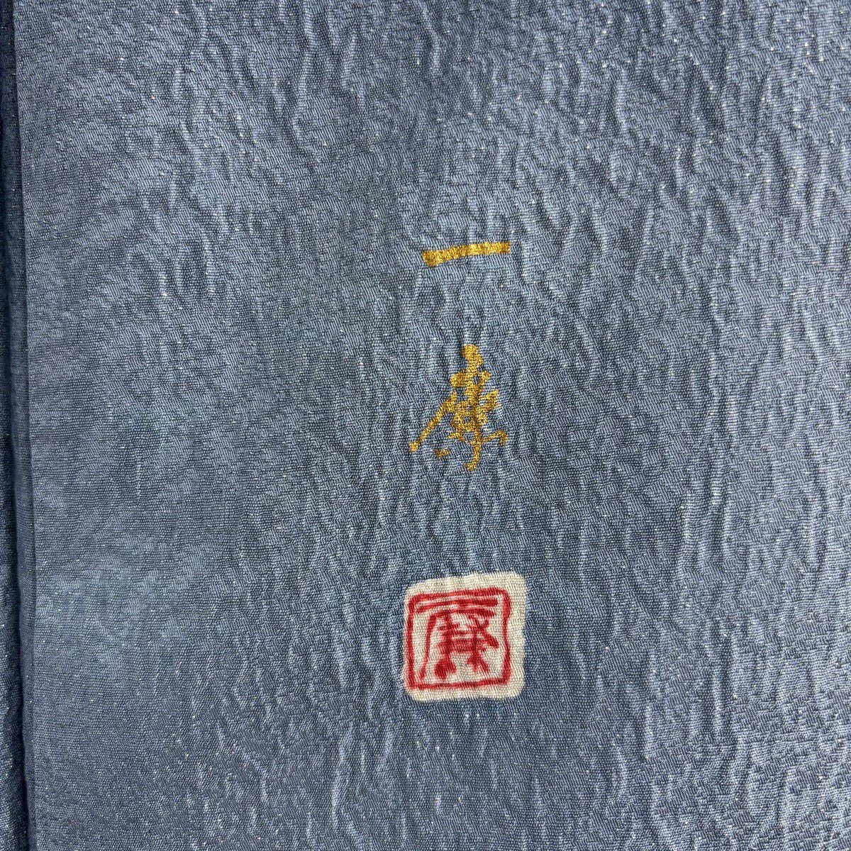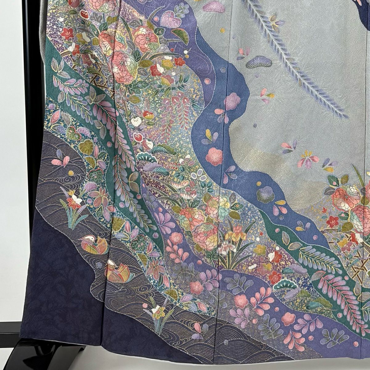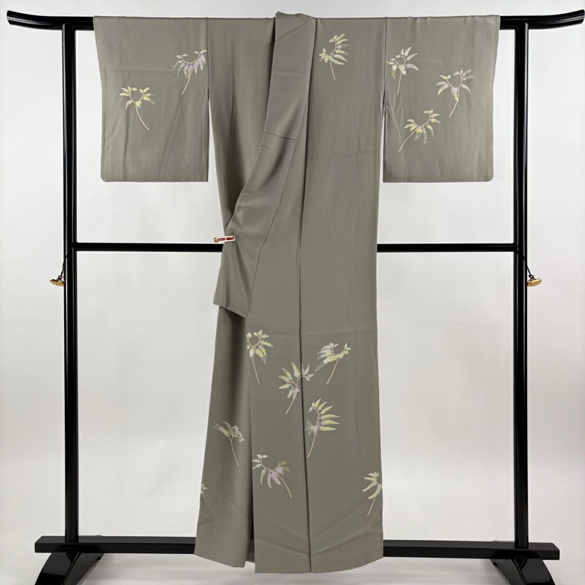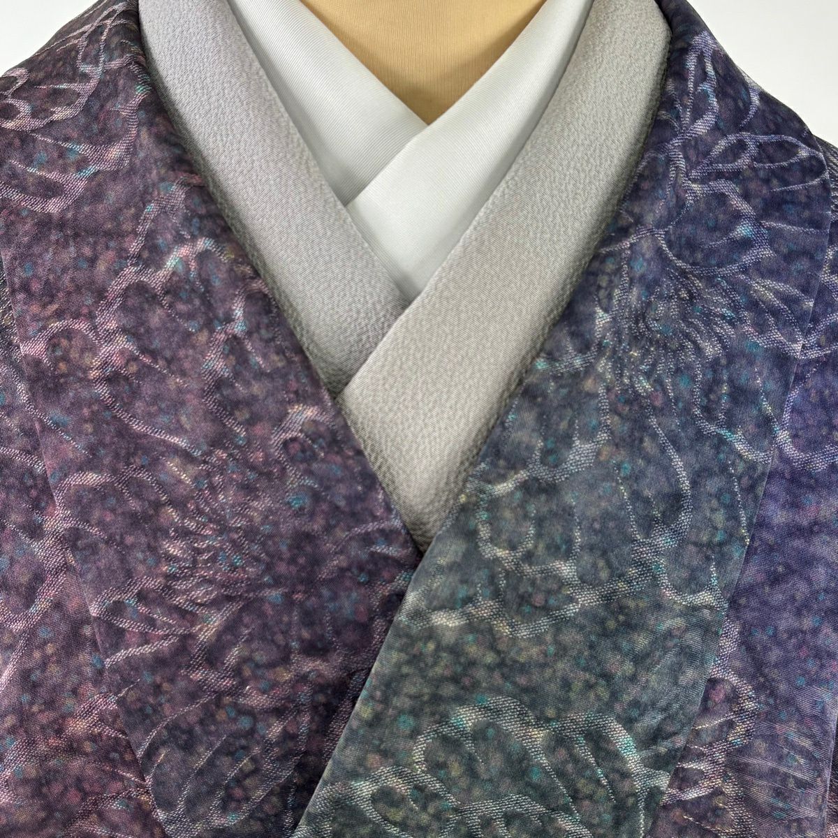 付下げ 身丈158cm 裄丈65.5cm M 袷 帝王紫 落款あり 松竹梅 菊 刺繍 金彩 灰紫 正絹 逸品