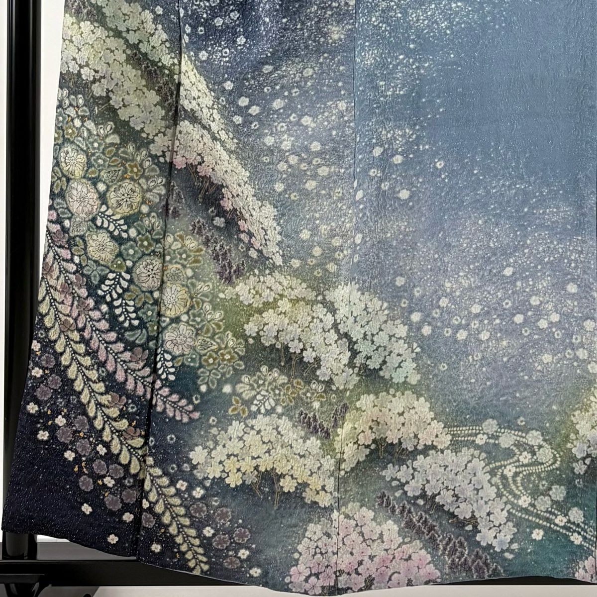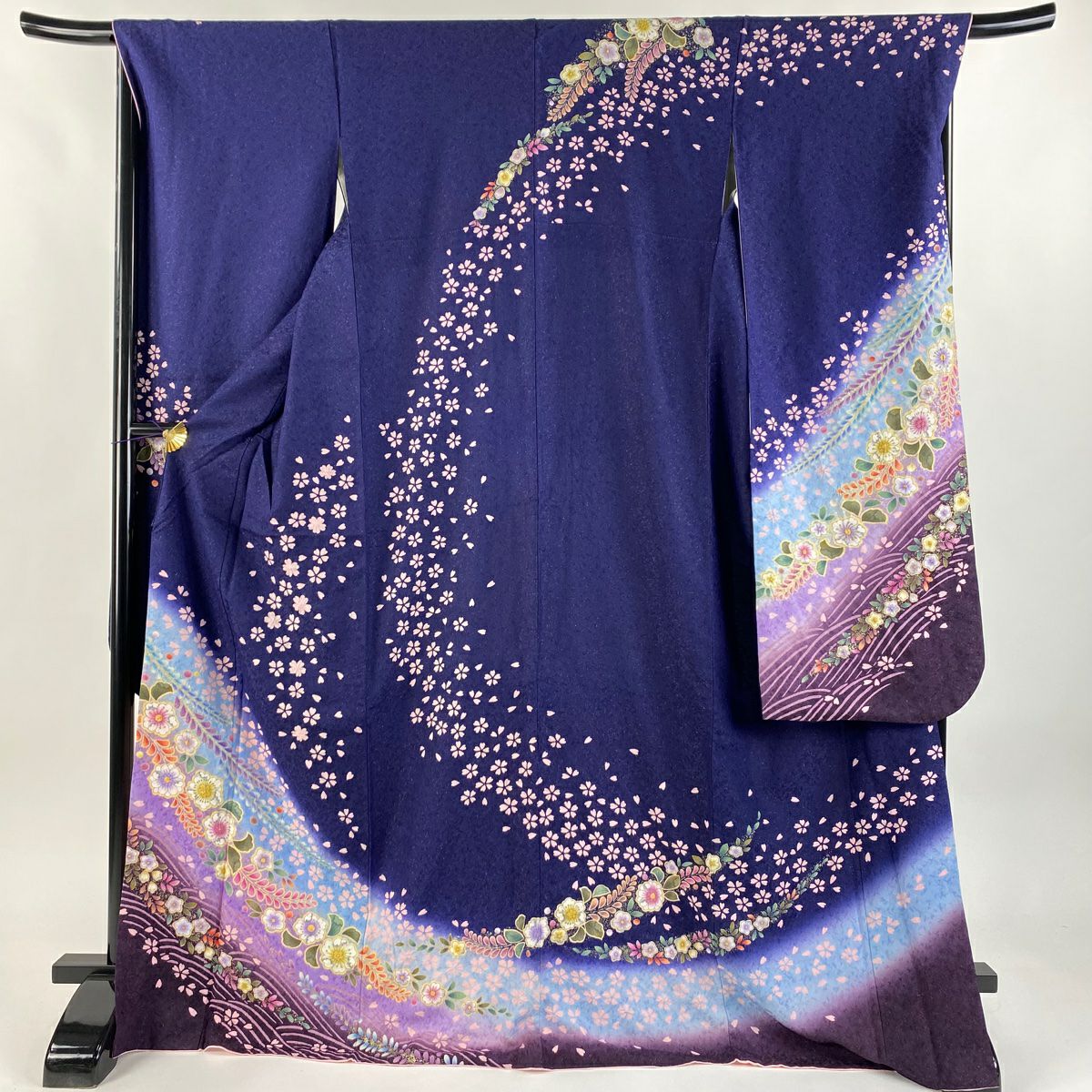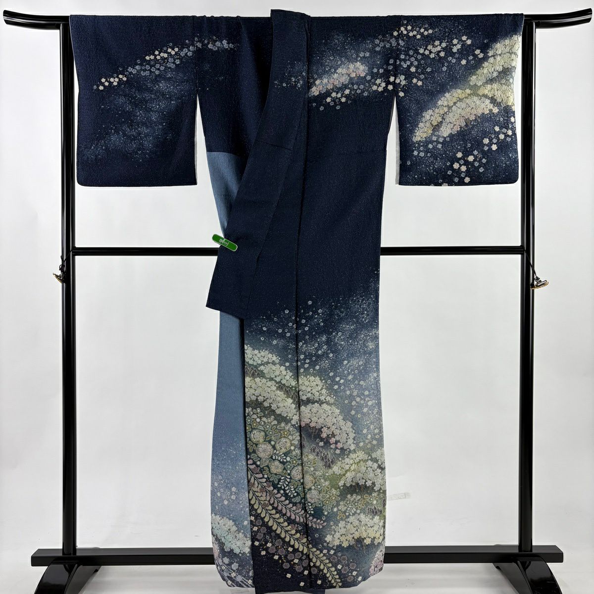 訪問着 身丈160cm 裄丈69cm L 袷 吉乃一廉 落款あり 辻が花 桜 銀通し 金彩 紺色 正絹 逸品