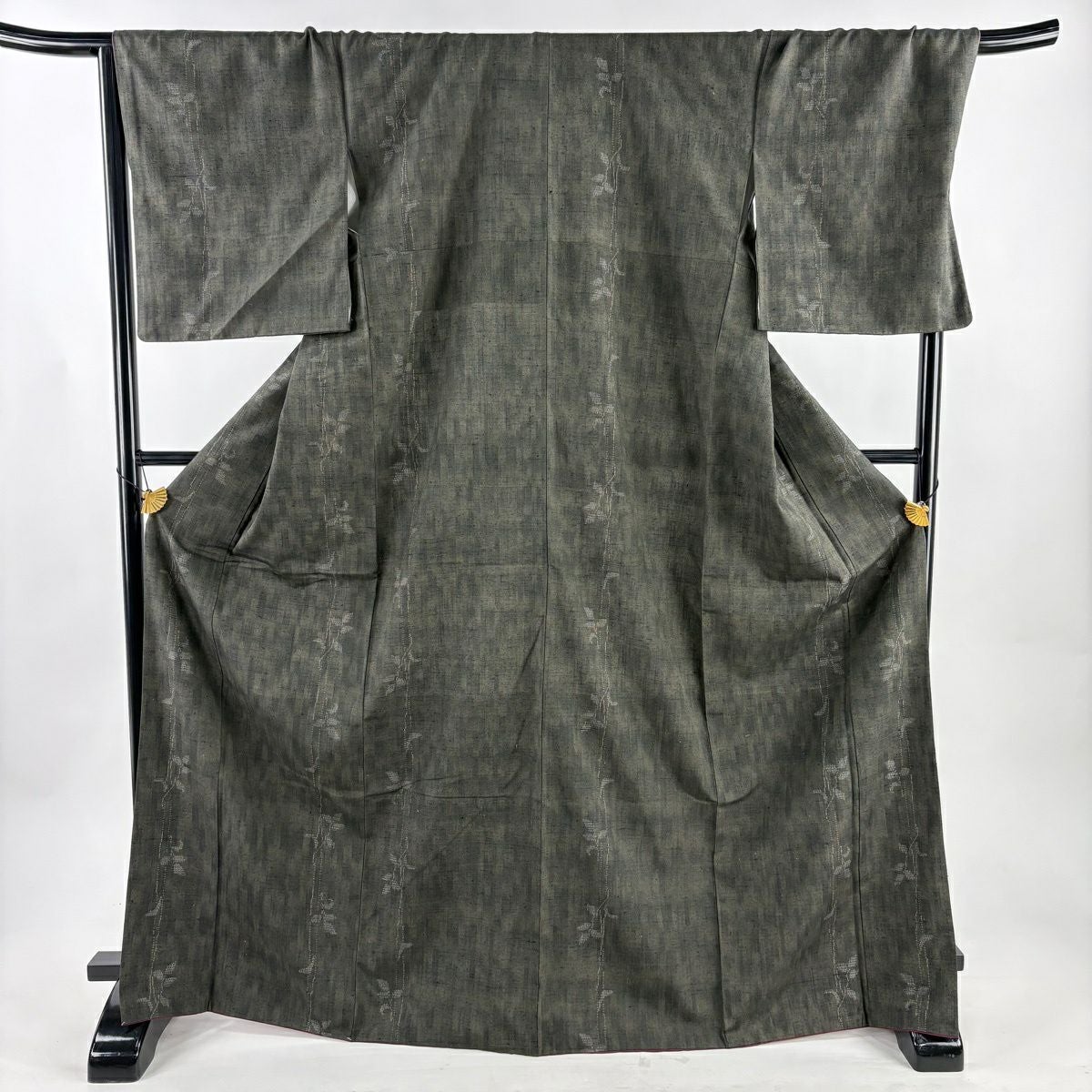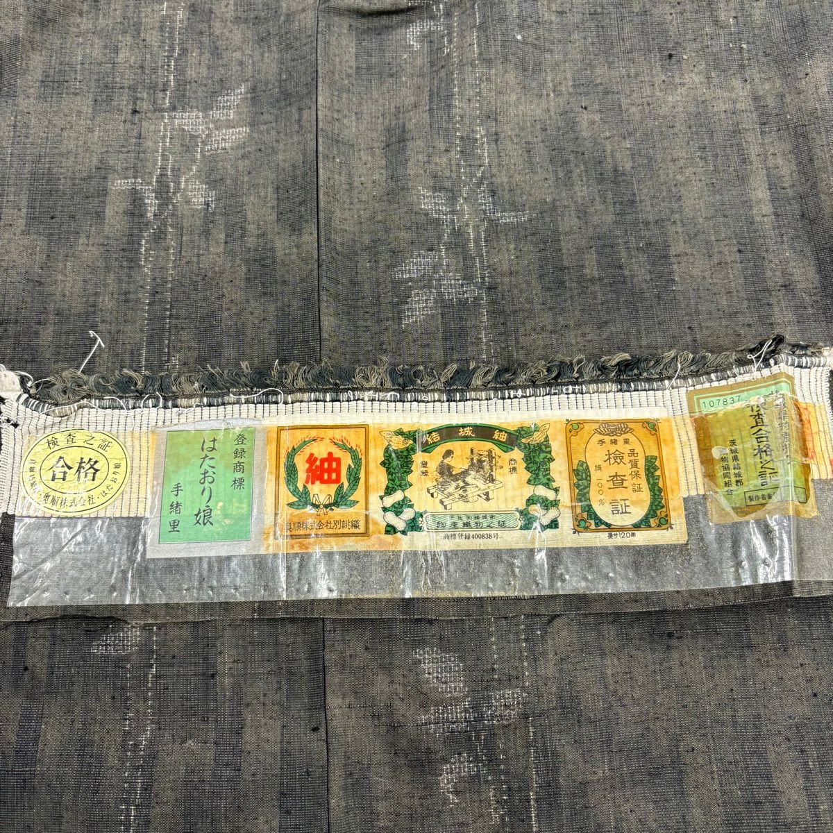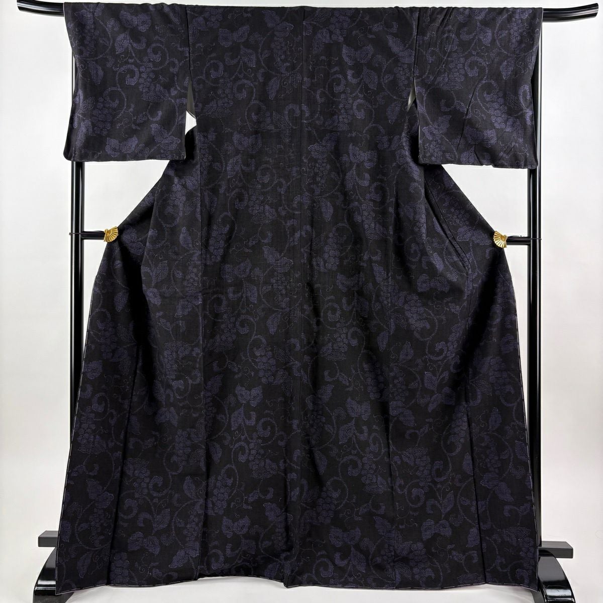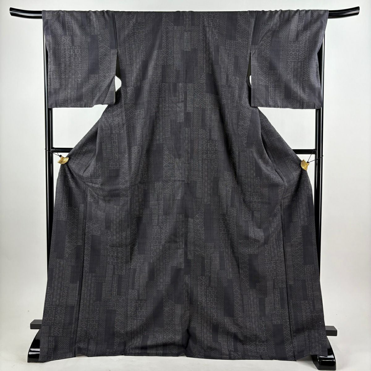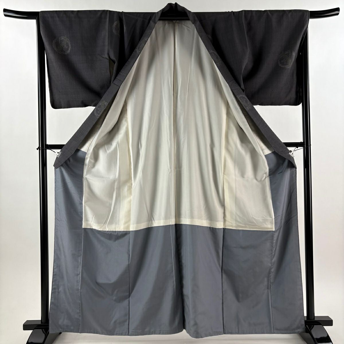 結城紬 身丈162.5cm 裄丈67cm M 袷 本場結城紬 バチ衿 証紙あり 草花 亀甲絣 黒灰 正絹 逸品