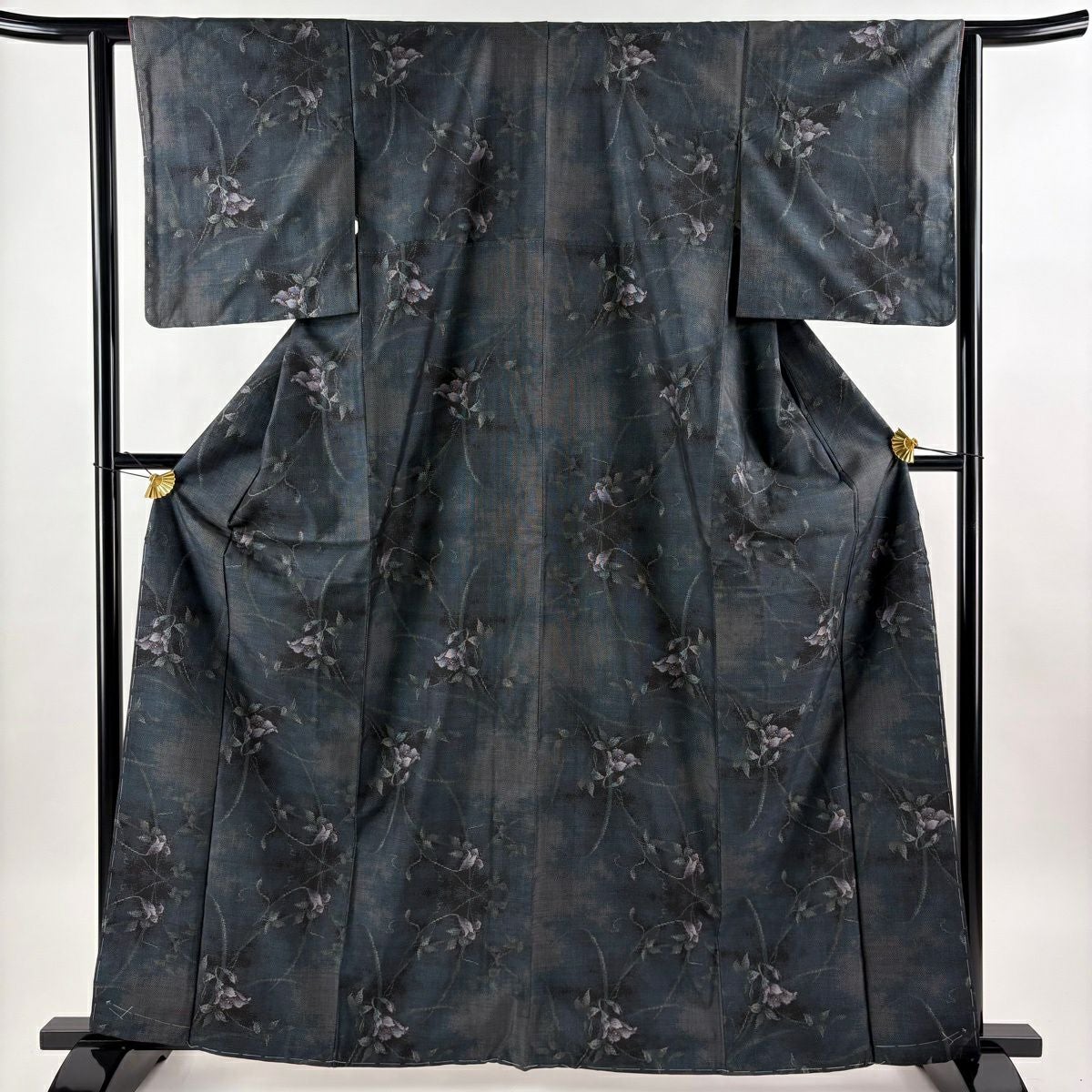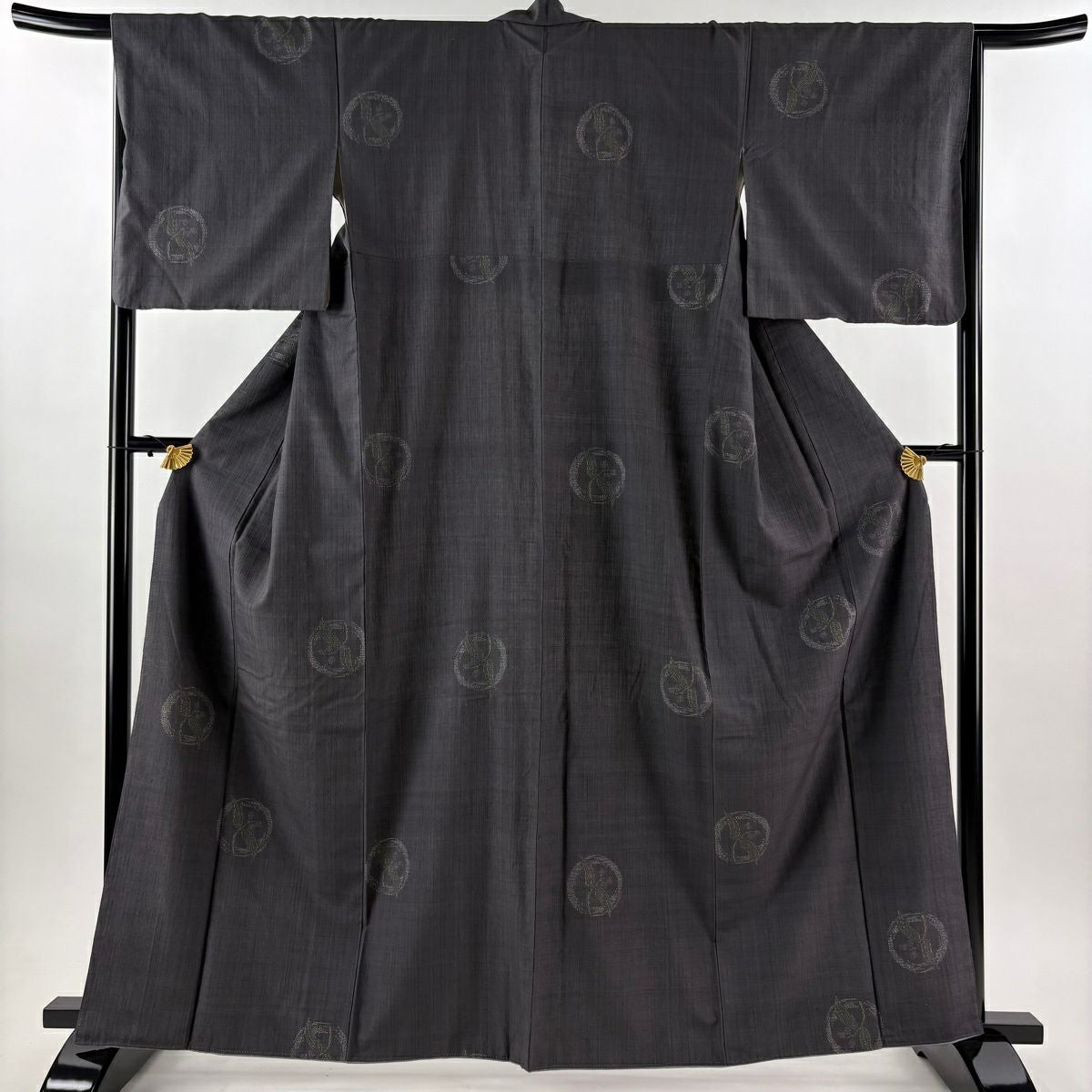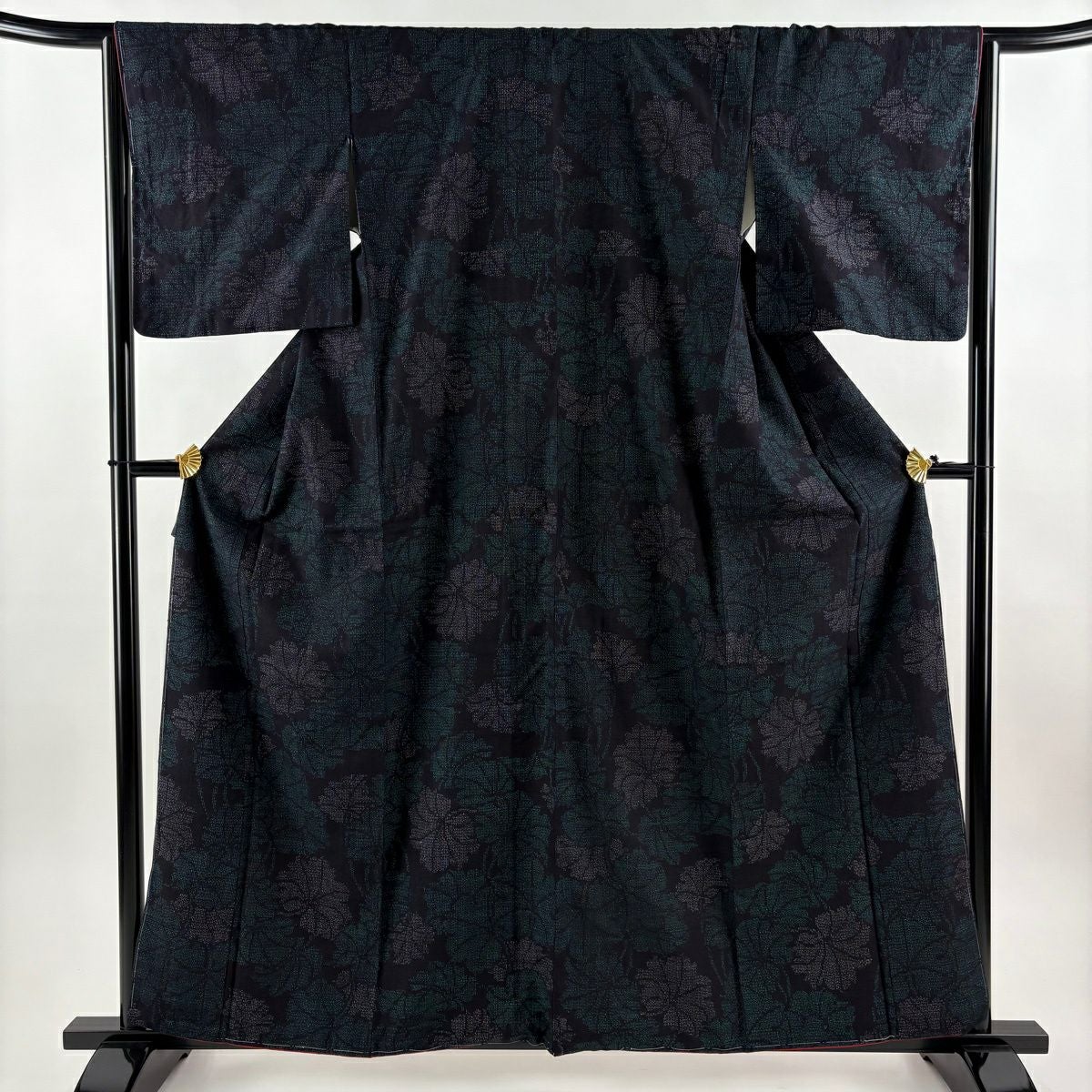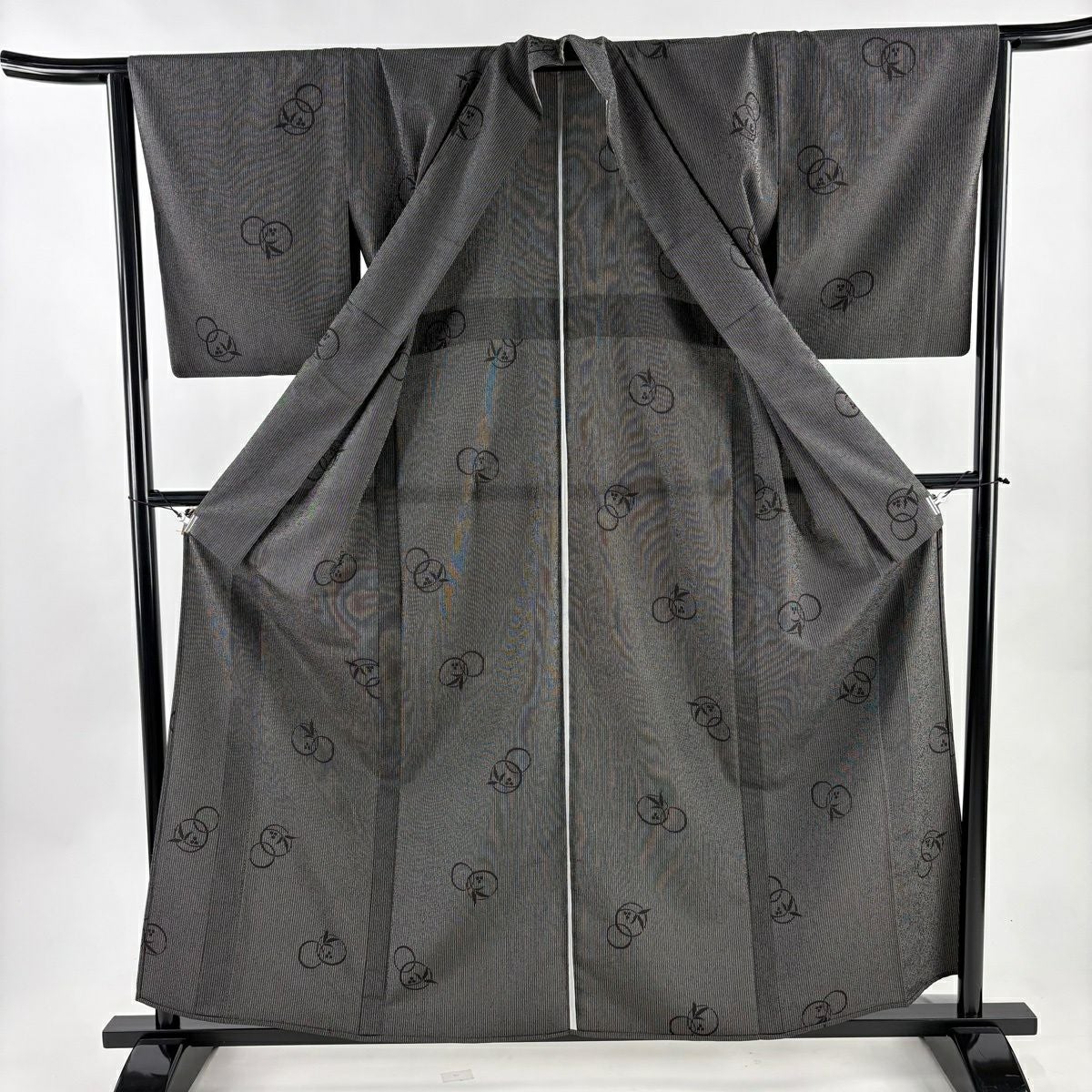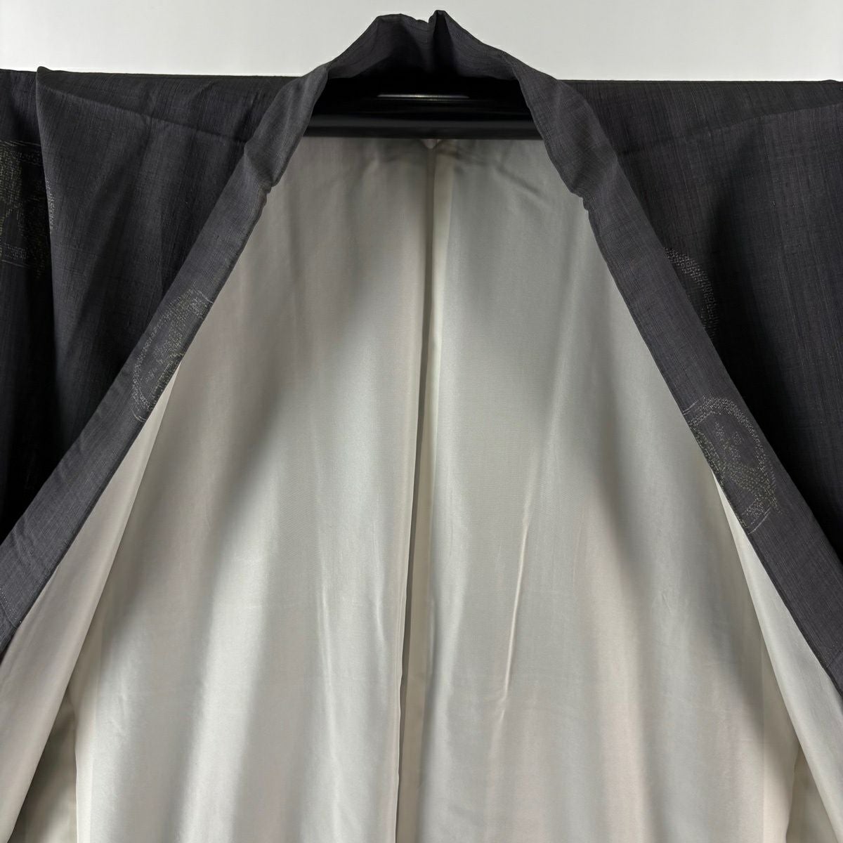 結城紬 身丈162.5cm 裄丈67cm M 袷 本場結城紬 バチ衿 証紙あり 草花 亀甲絣 黒灰 正絹 逸品