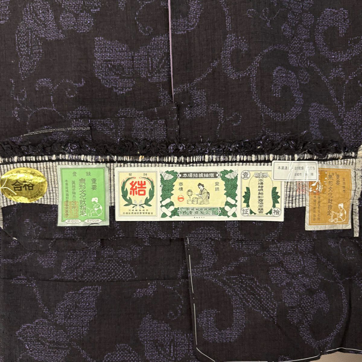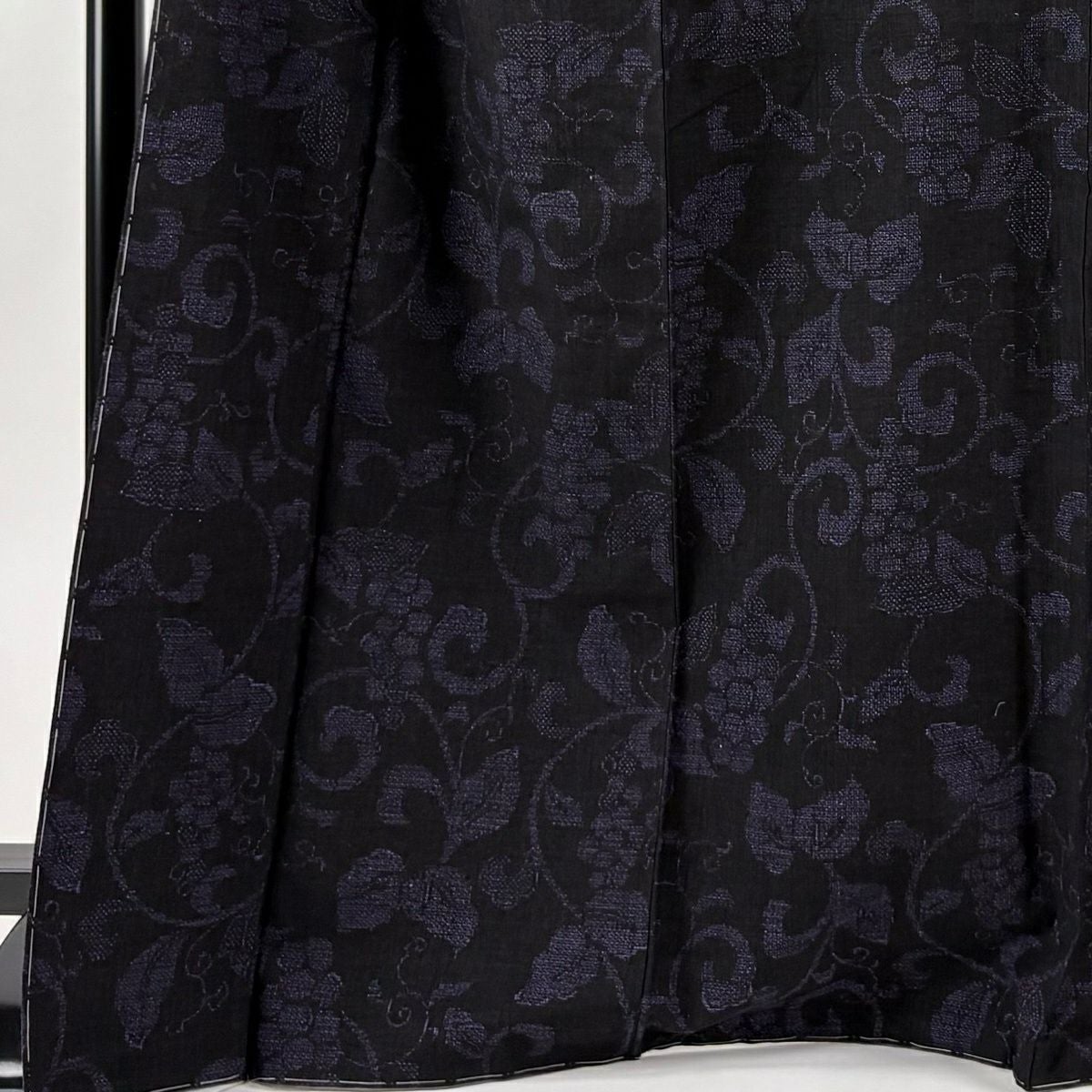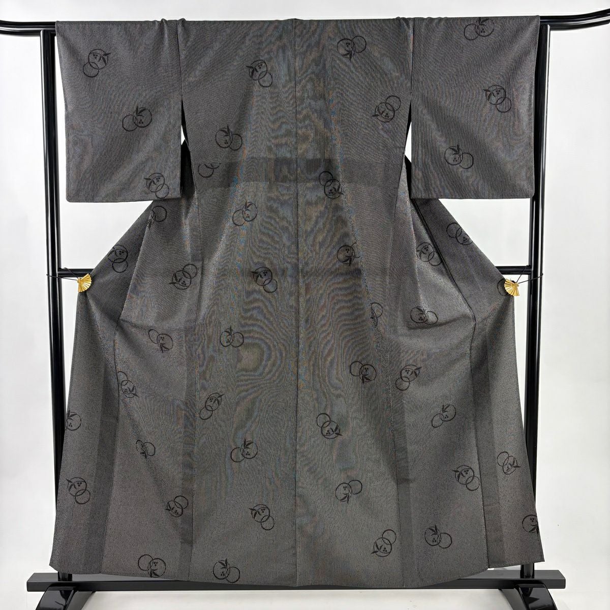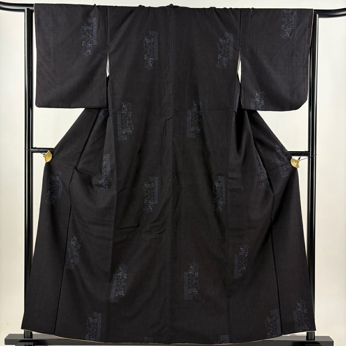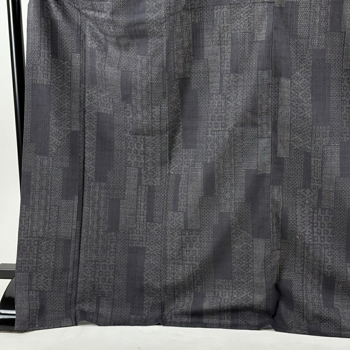 結城紬 身丈162.5cm 裄丈67cm M 袷 本場結城紬 バチ衿 証紙あり 草花 亀甲絣 黒灰 正絹 逸品