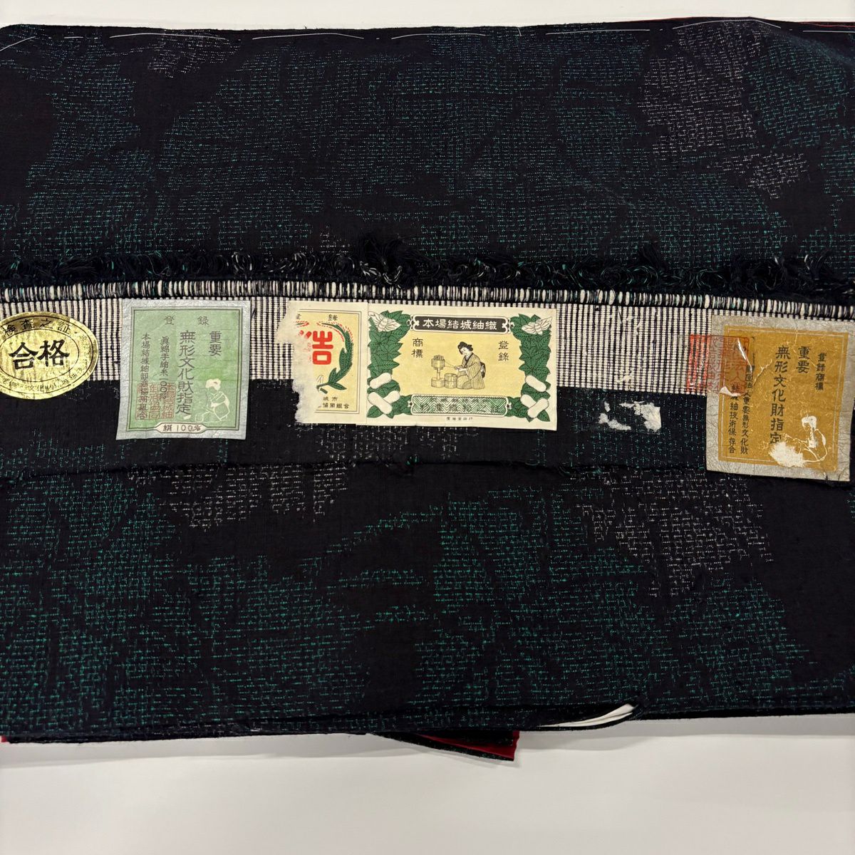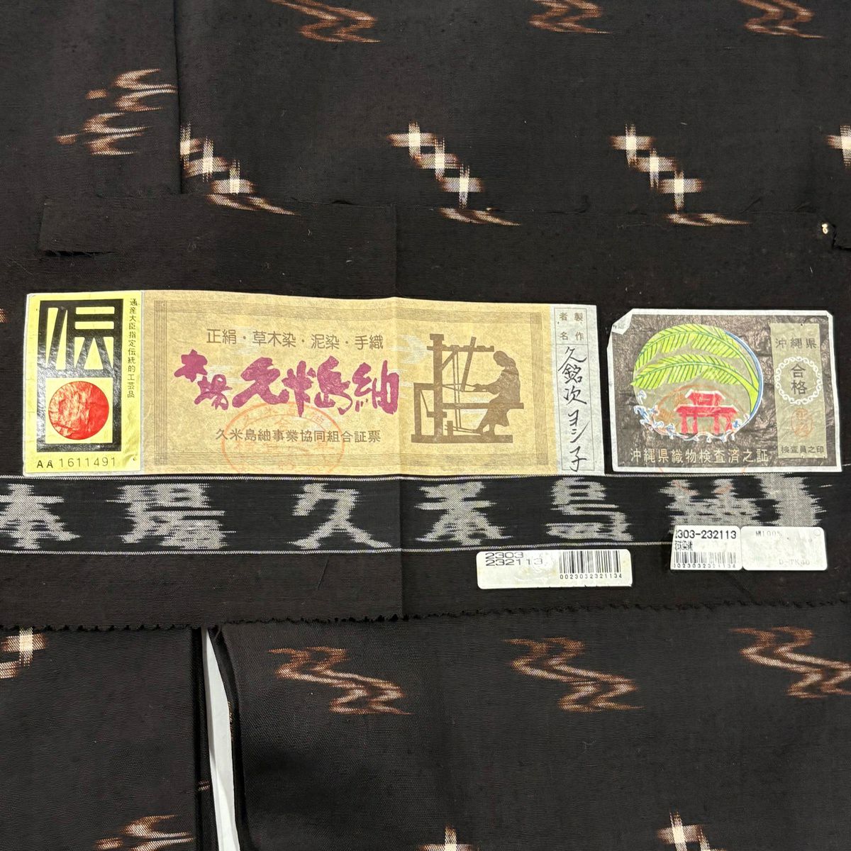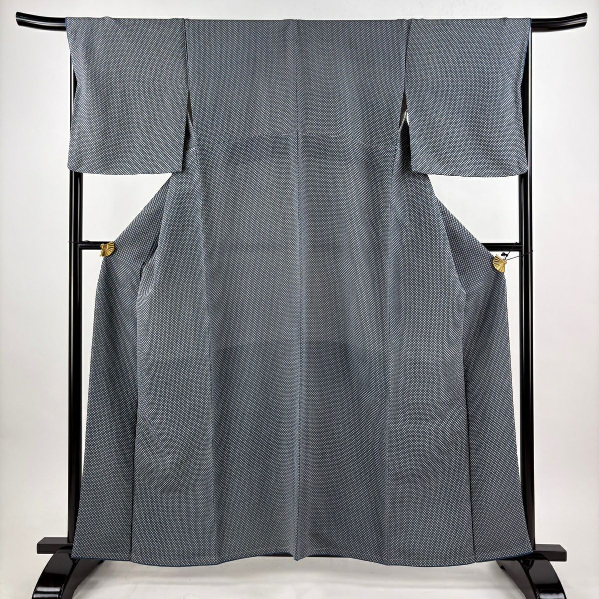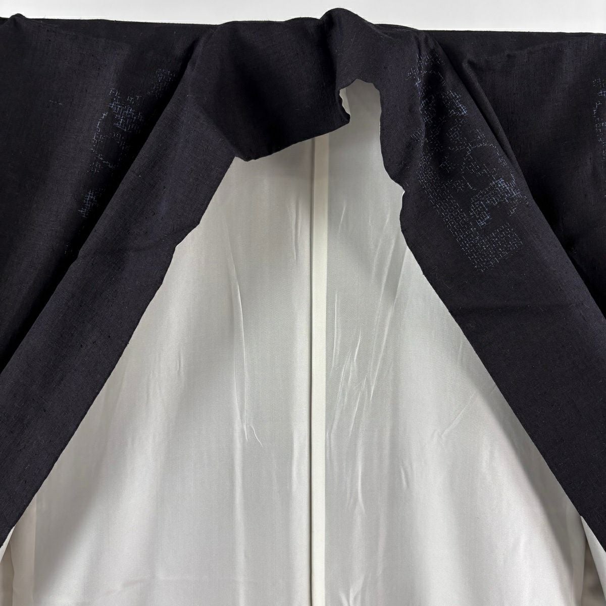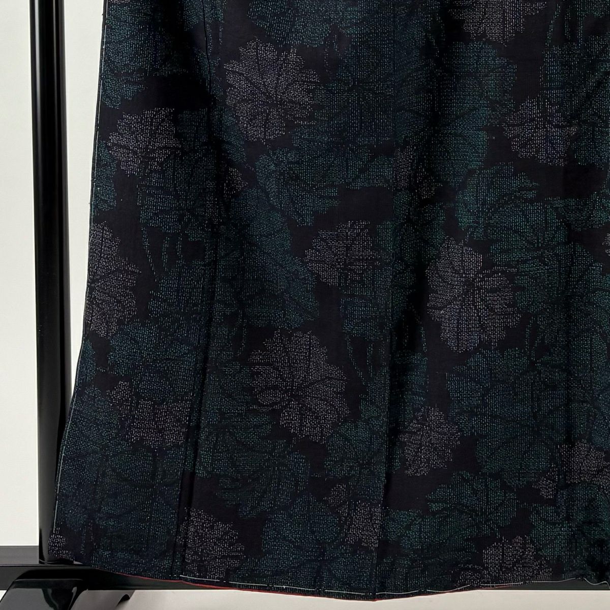 結城紬 身丈162.5cm 裄丈67cm M 袷 本場結城紬 バチ衿 証紙あり 草花 亀甲絣 黒灰 正絹 逸品