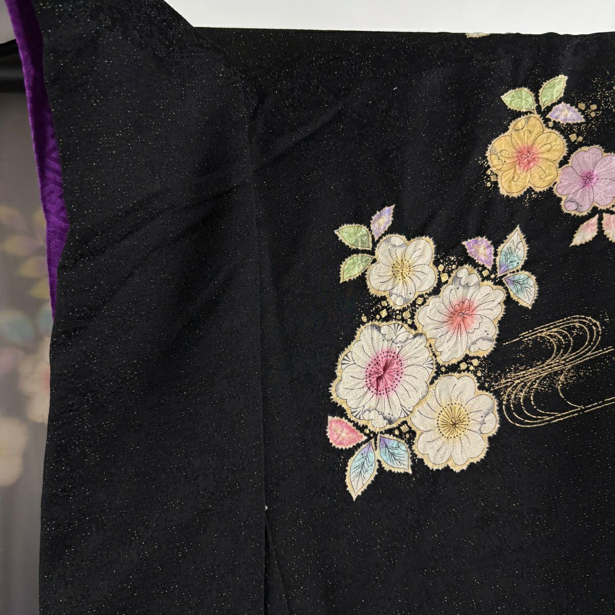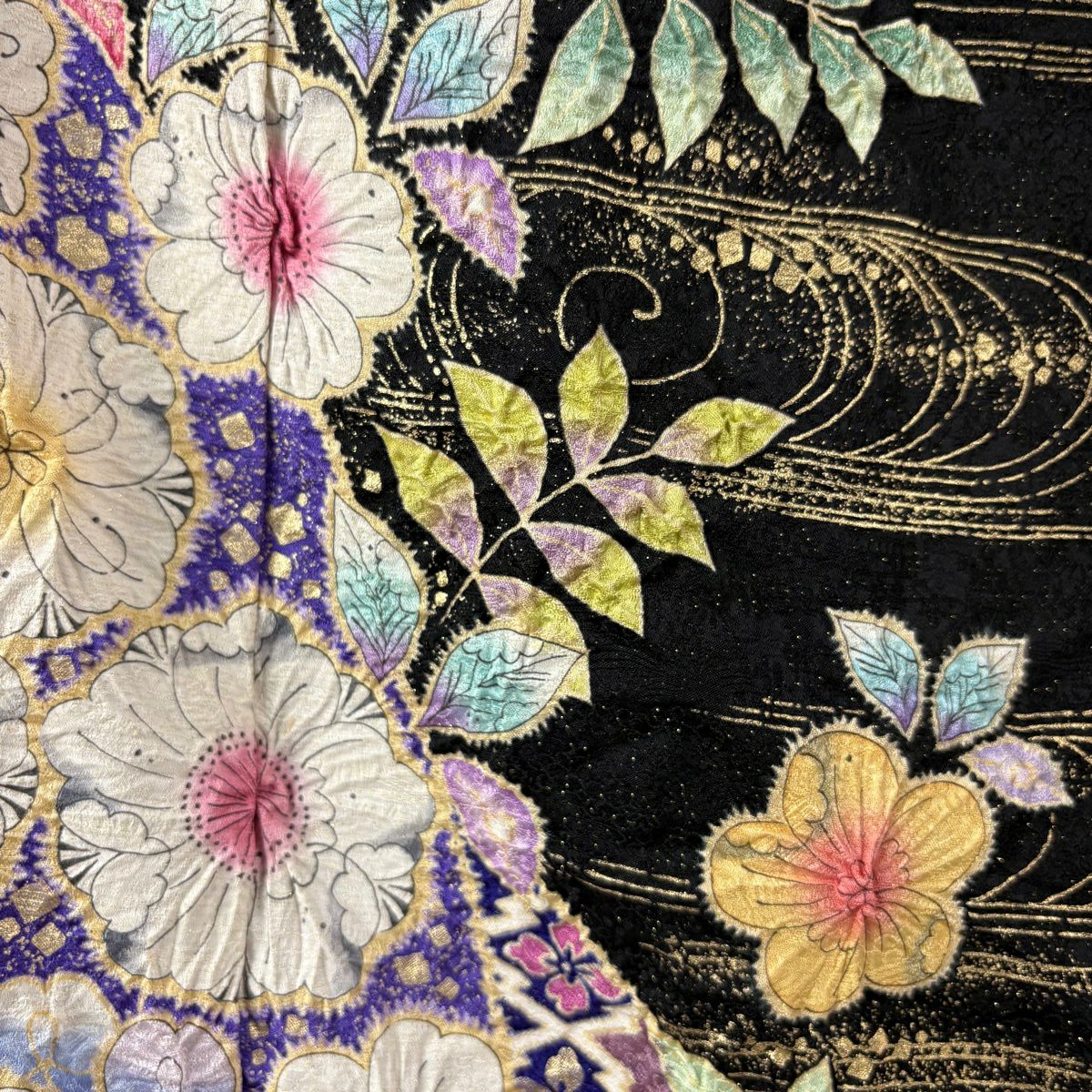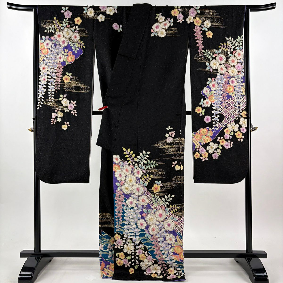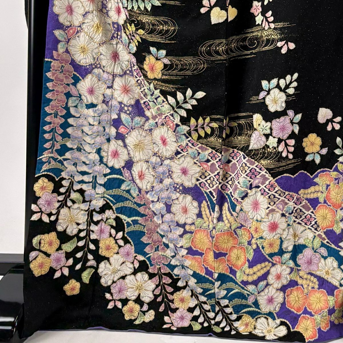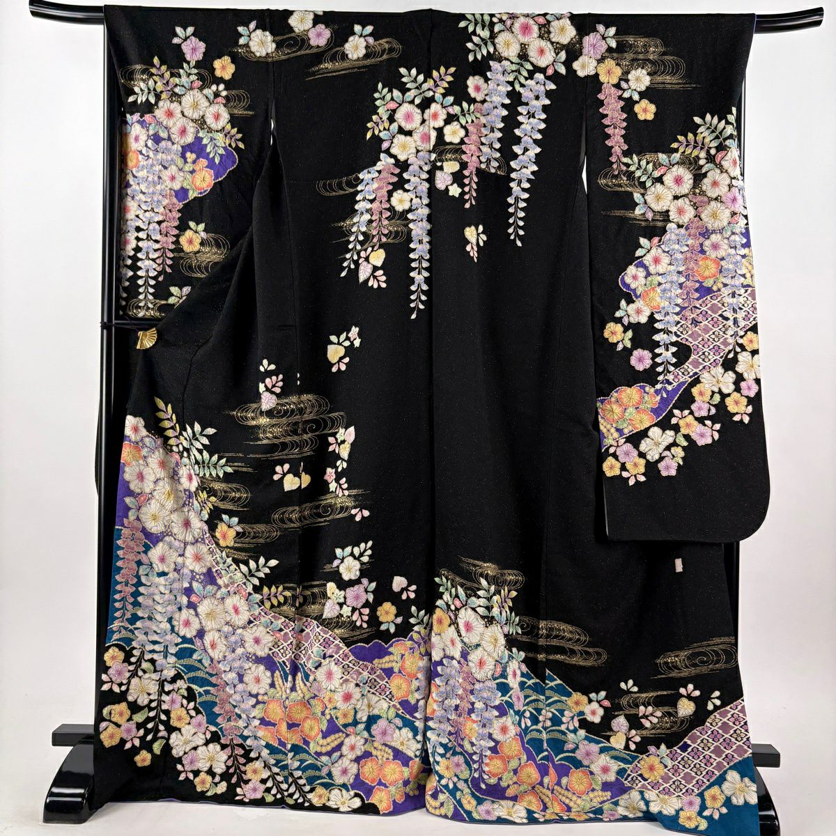 振袖 身丈171.5cm 裄丈68cm L 袷 徳永憲峯 落款あり 辻が花 流水 金通し 金彩 黒 正絹 逸品