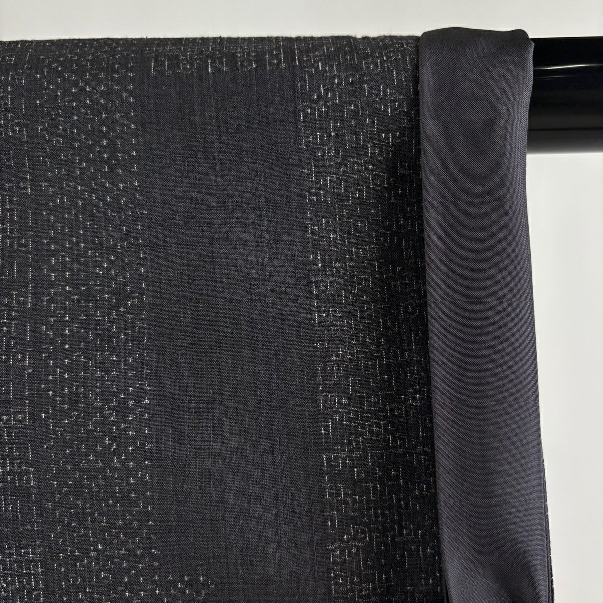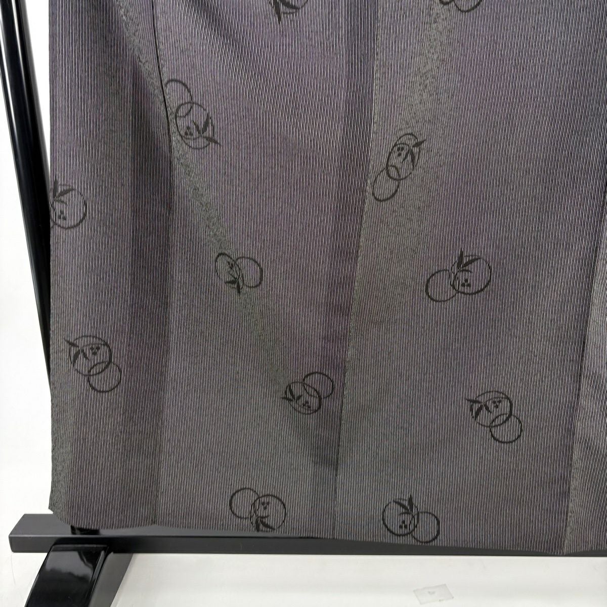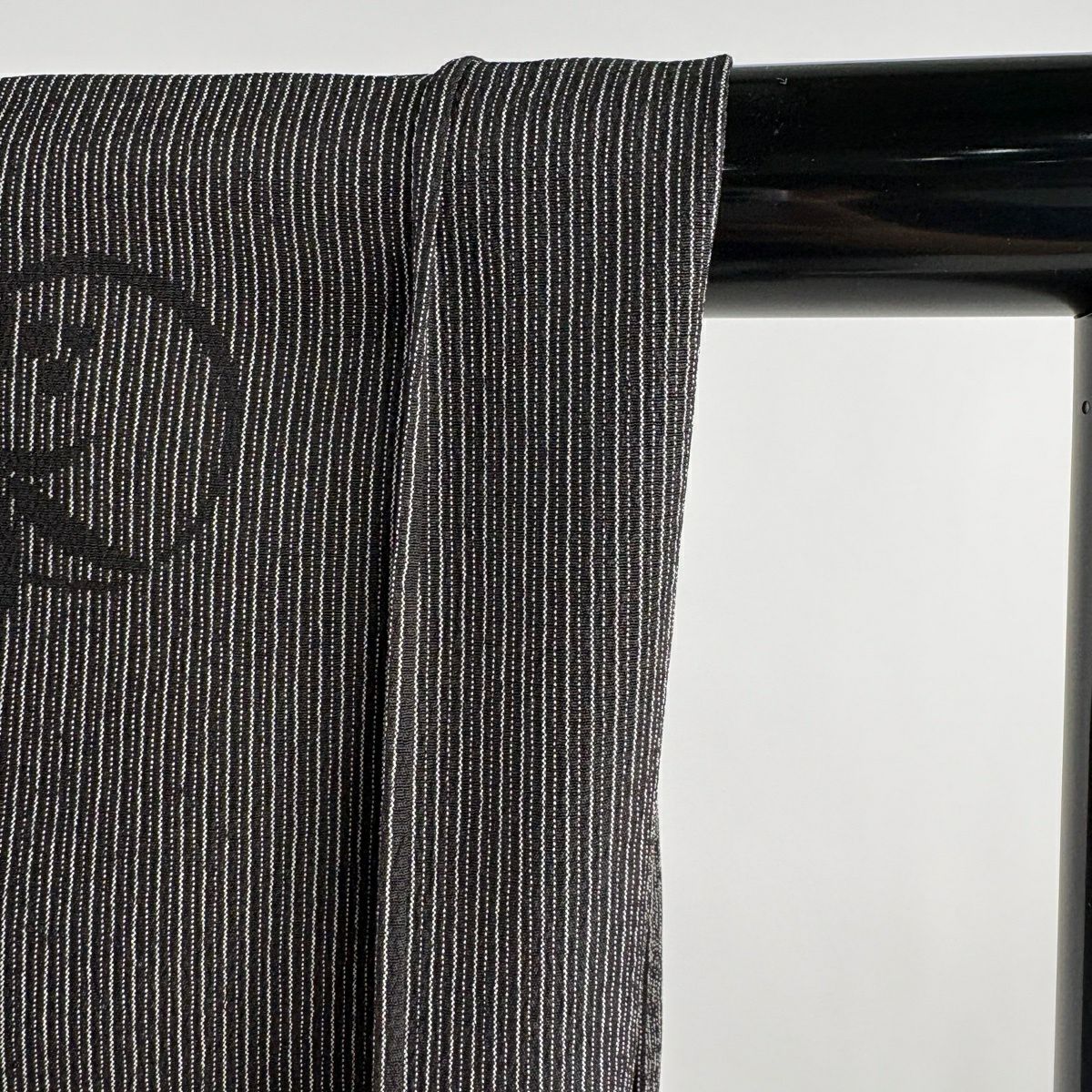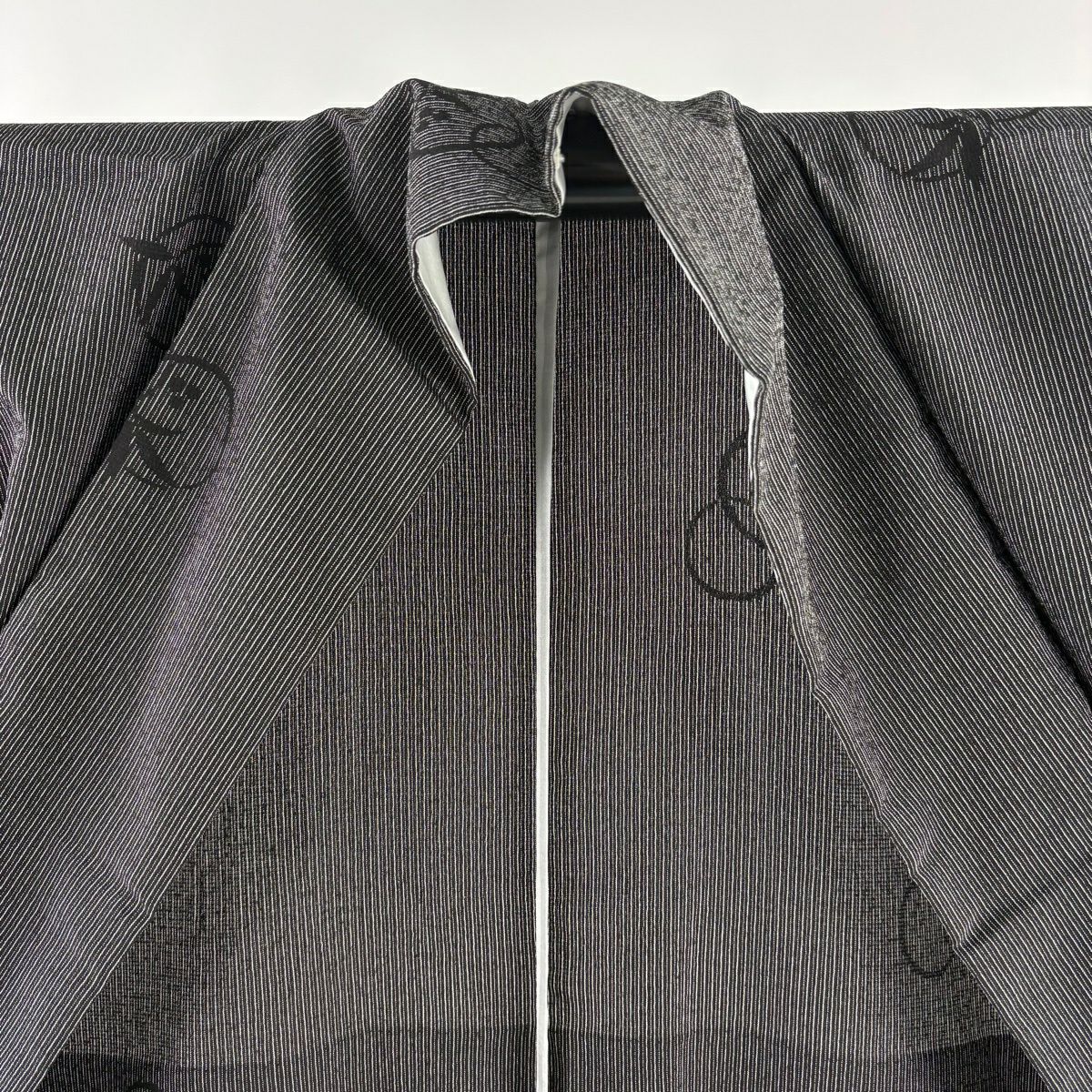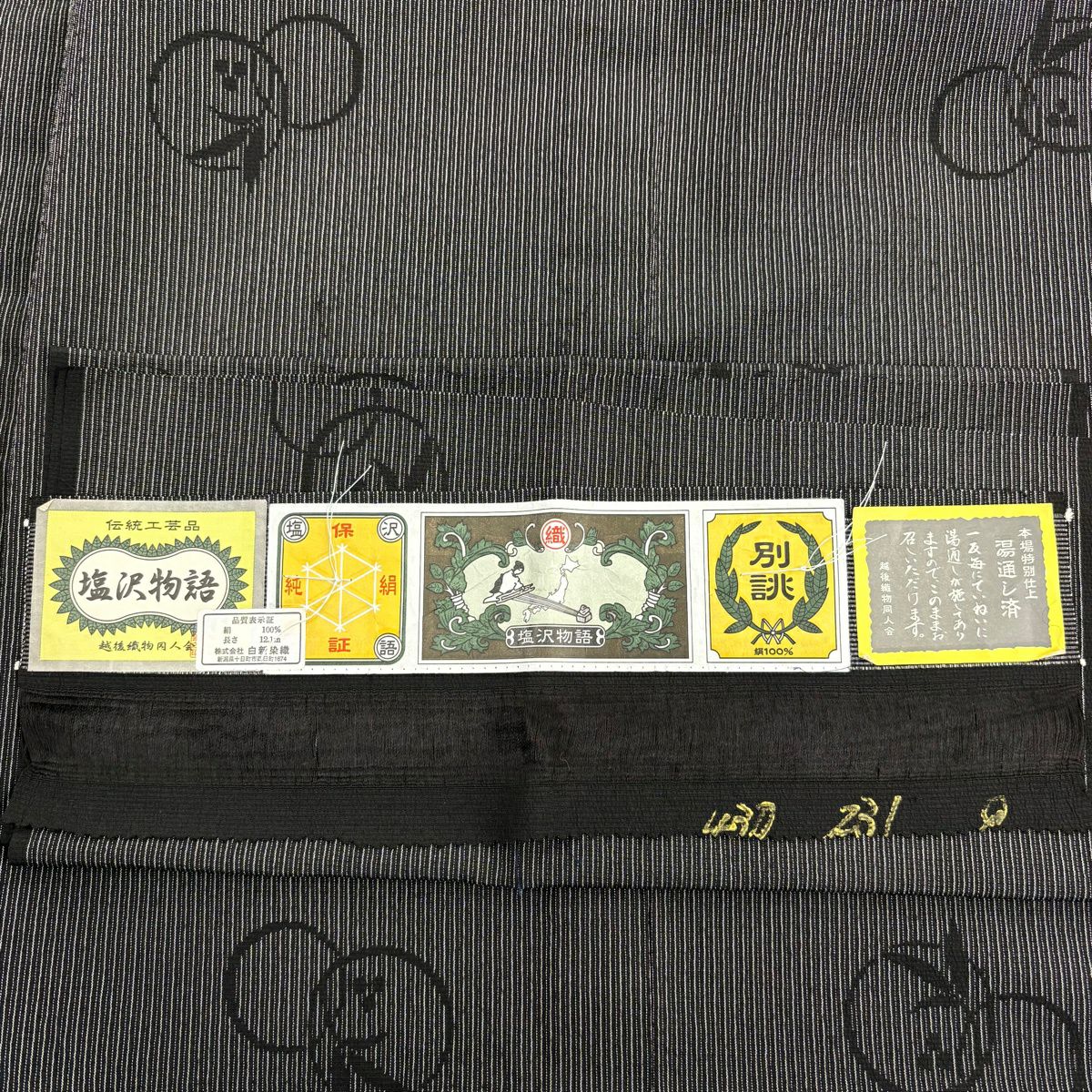 【美品】 塩沢紬 身丈159.5cm 裄丈64.5cm M 単衣 塩沢紬 塩沢物語 証紙あり 葉と実 縦縞 黒灰 正絹 逸品