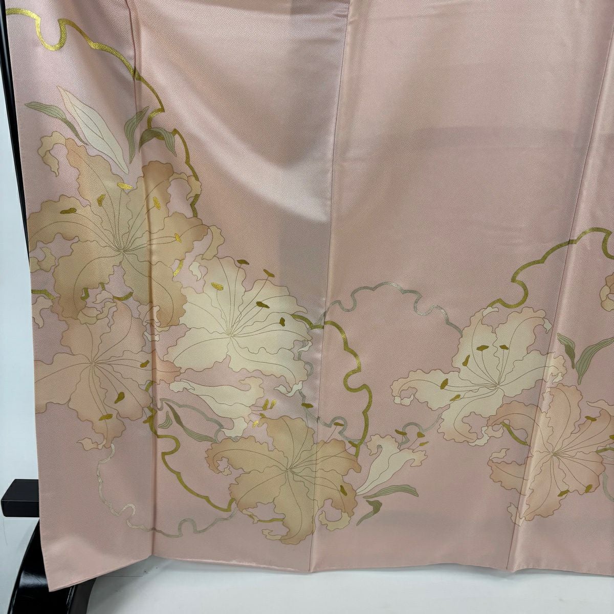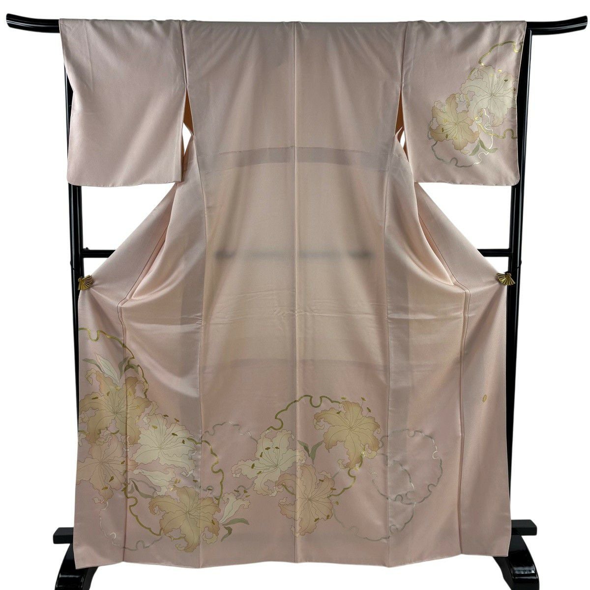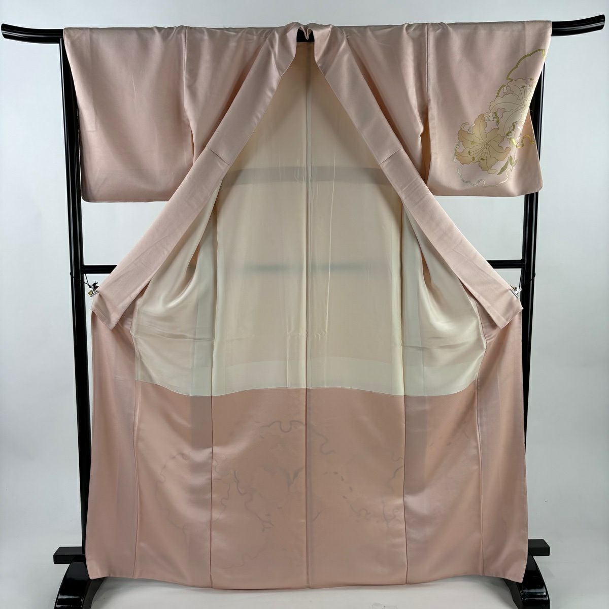 付下げ 身丈169cm 裄丈67cm M 袷 渡辺雪三郎 落款あり 百合 雪輪 金彩 薄ピンク 正絹 逸品