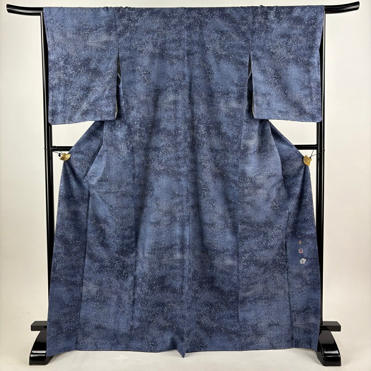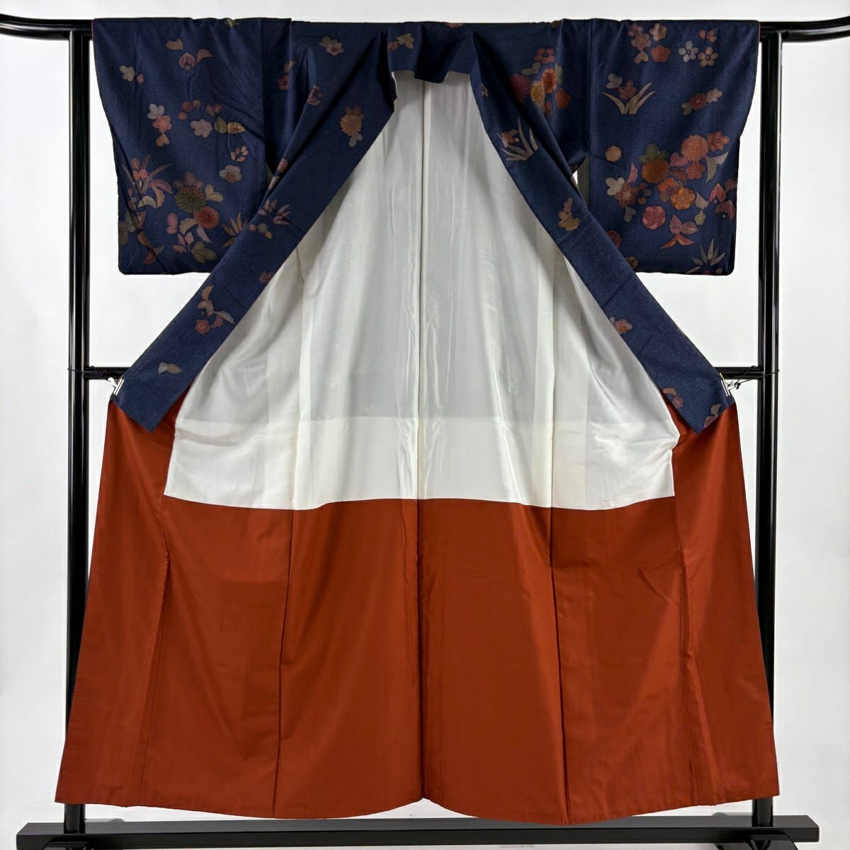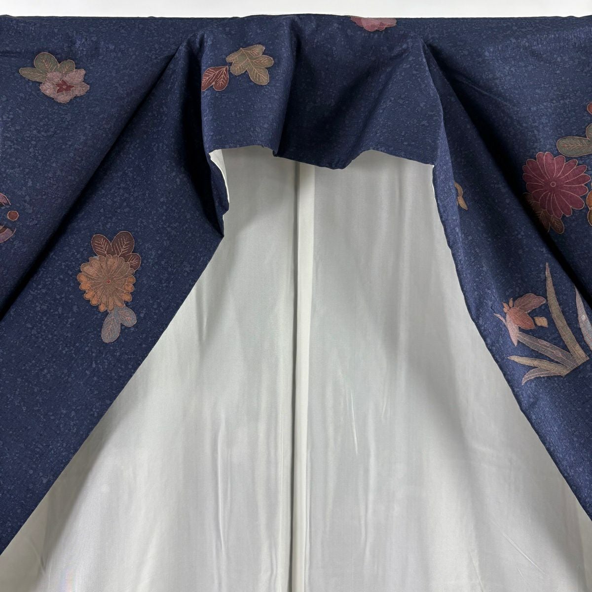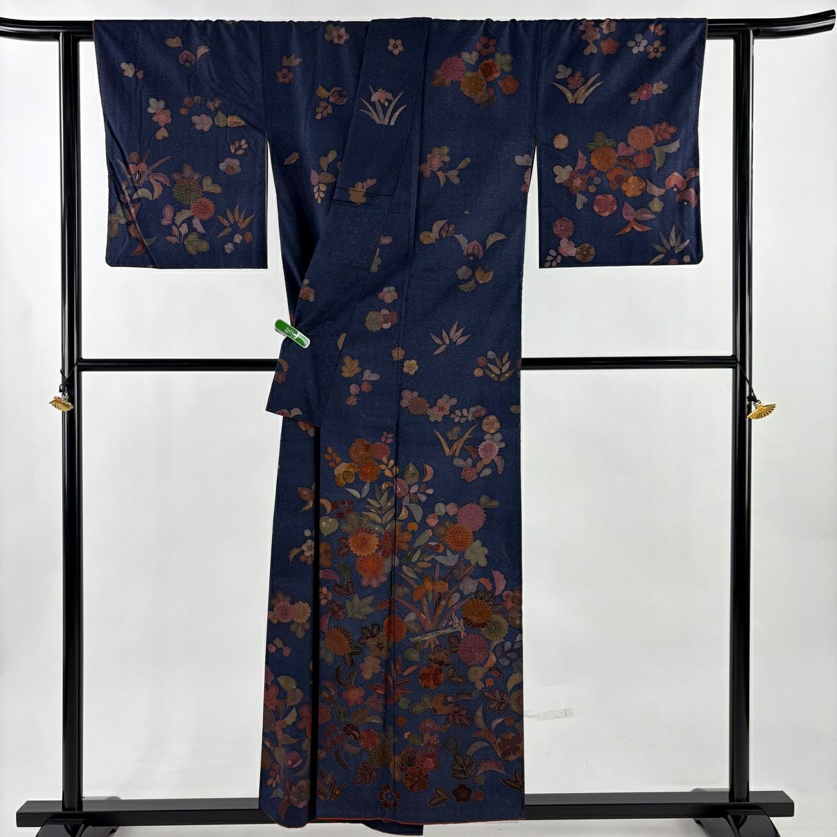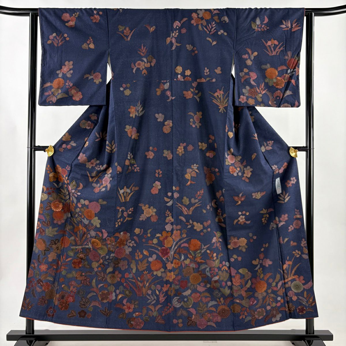 訪問着 身丈155.5cm 裄丈63.5cm S 袷 京屋林蔵 紬地 落款あり 草花 菊 刺繍 紺色 正絹 逸品