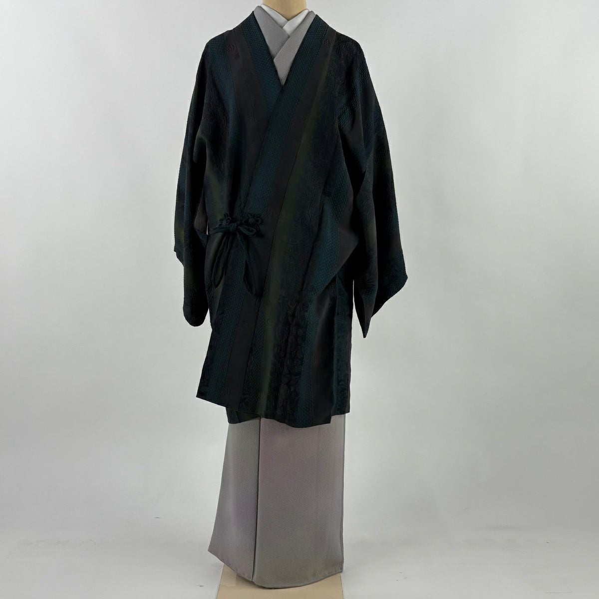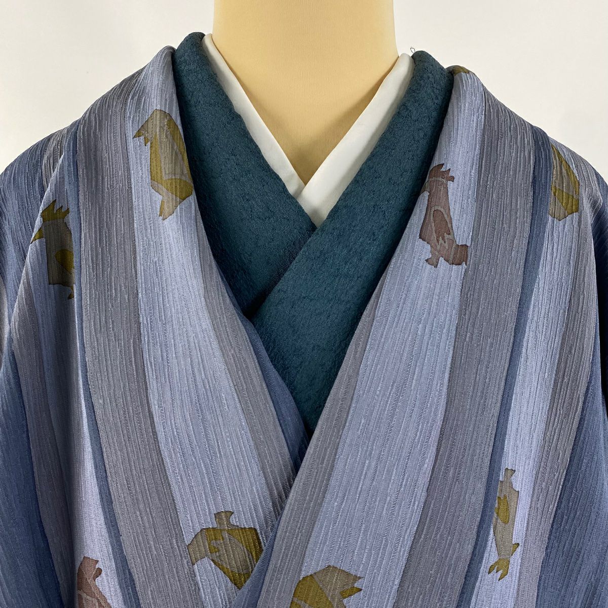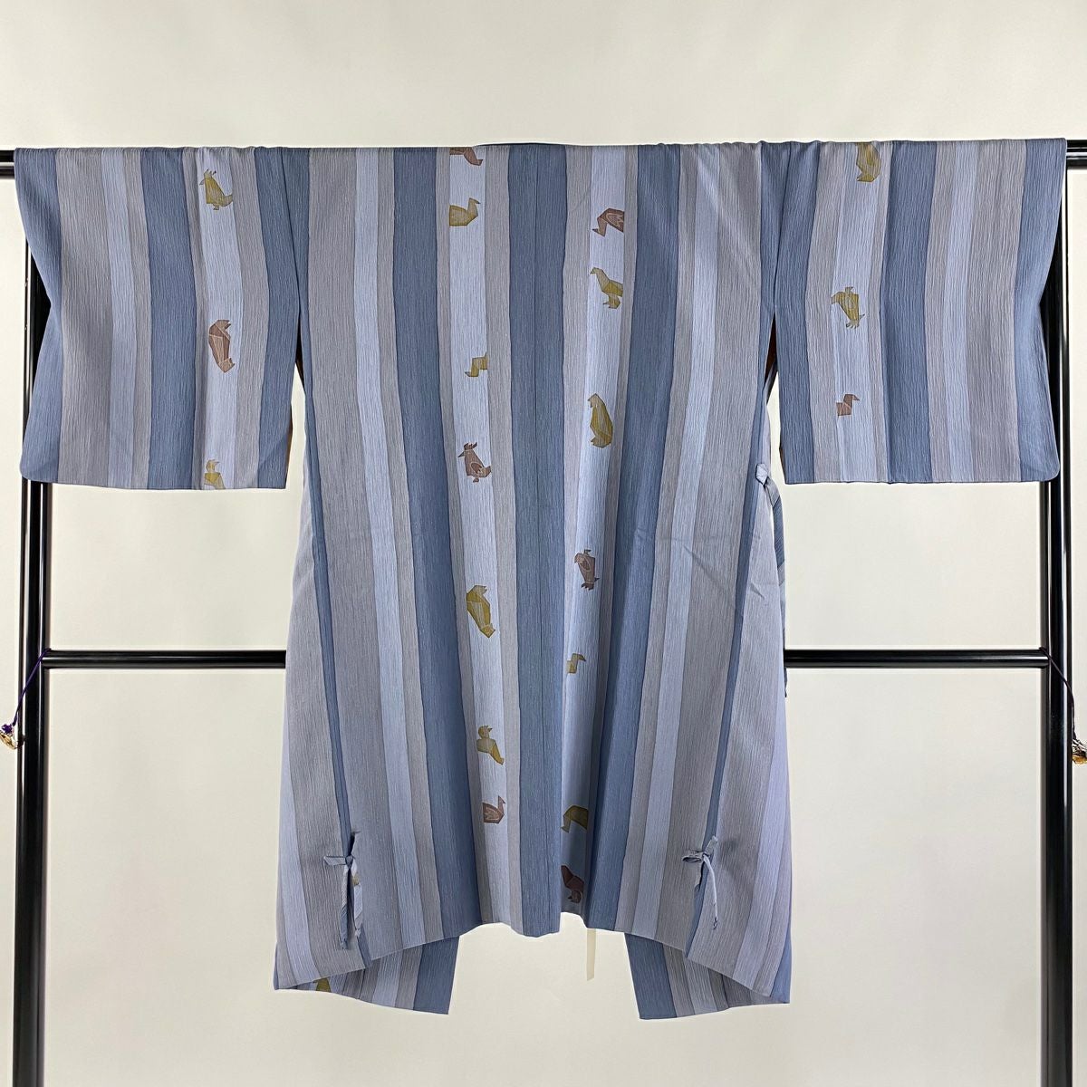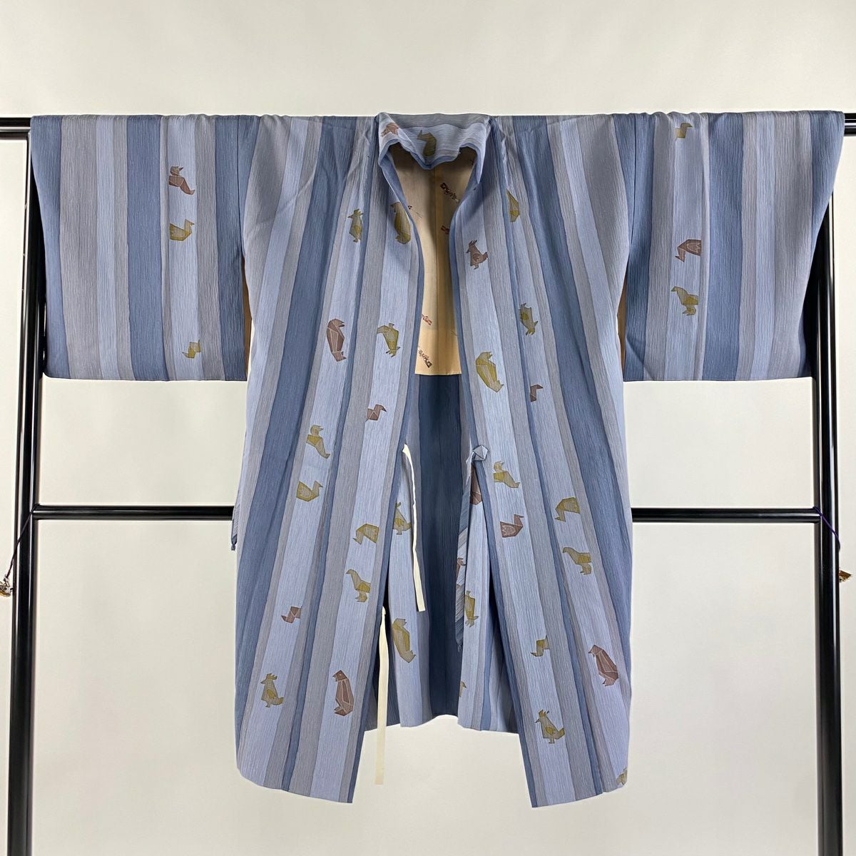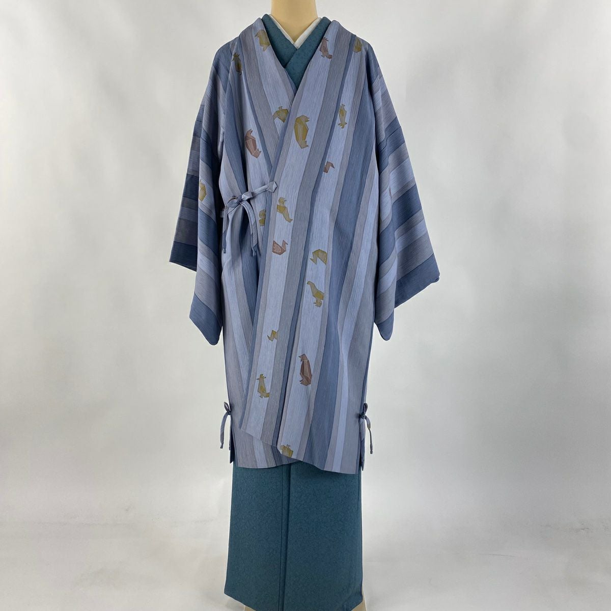 【在庫一掃】 【美品】 道中着 身丈101.5cm 裄丈68cm L 和装コート 鳥 縦縞 青灰色 正絹 逸品