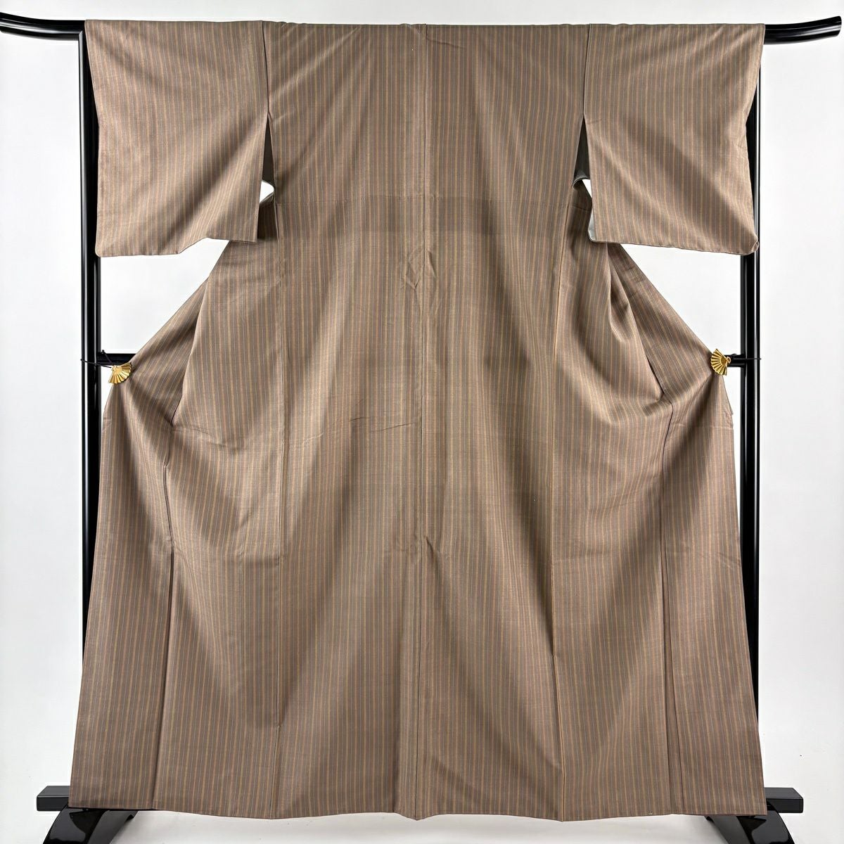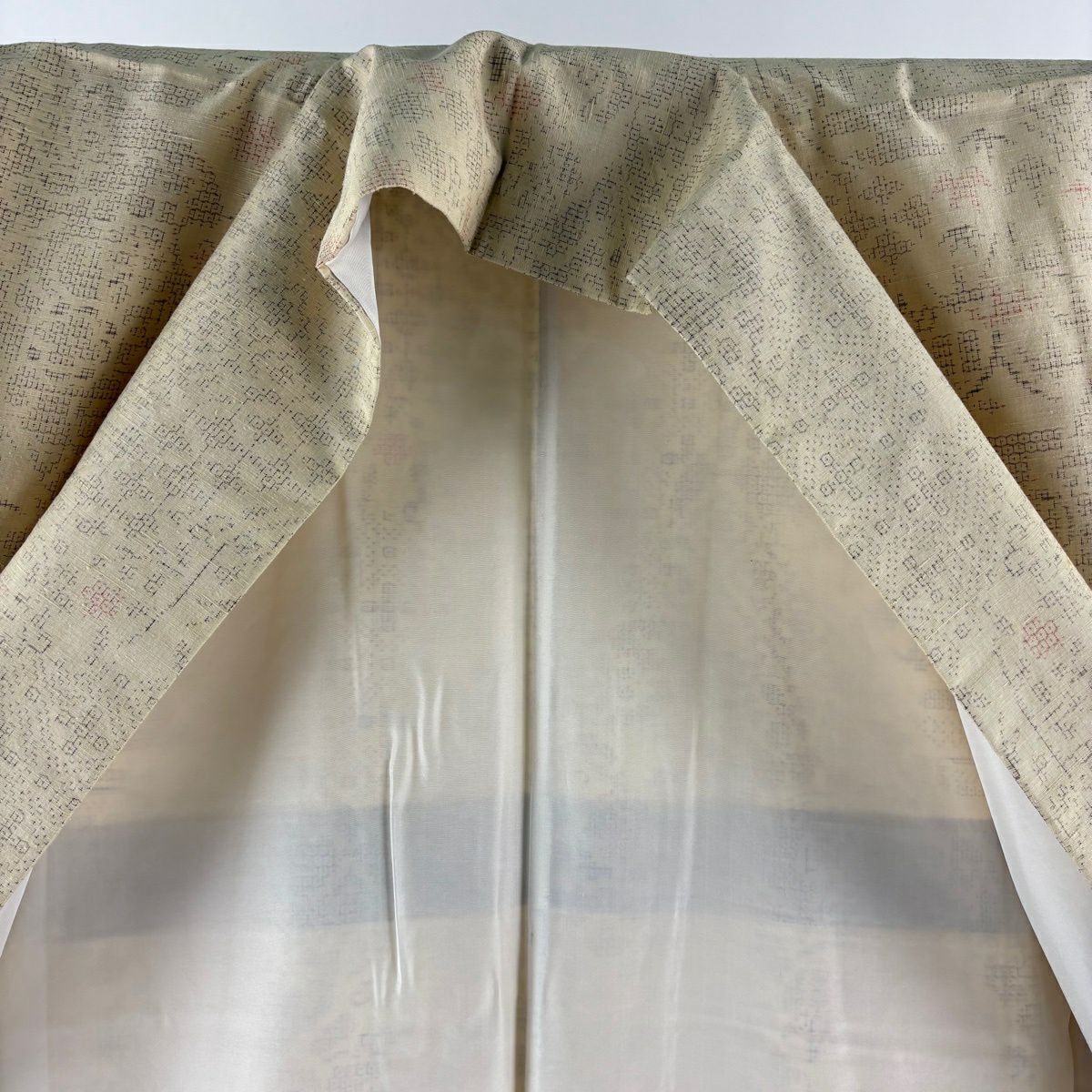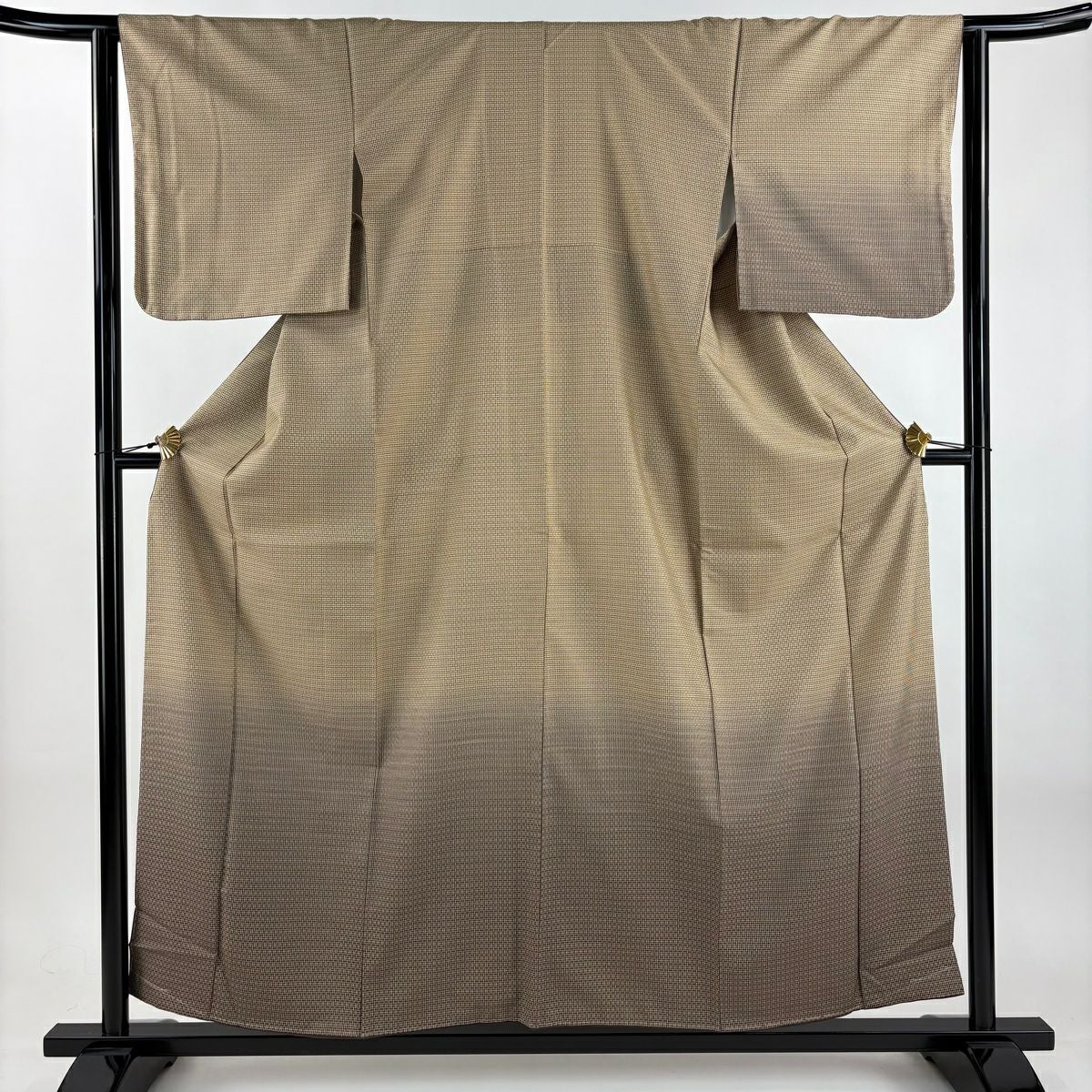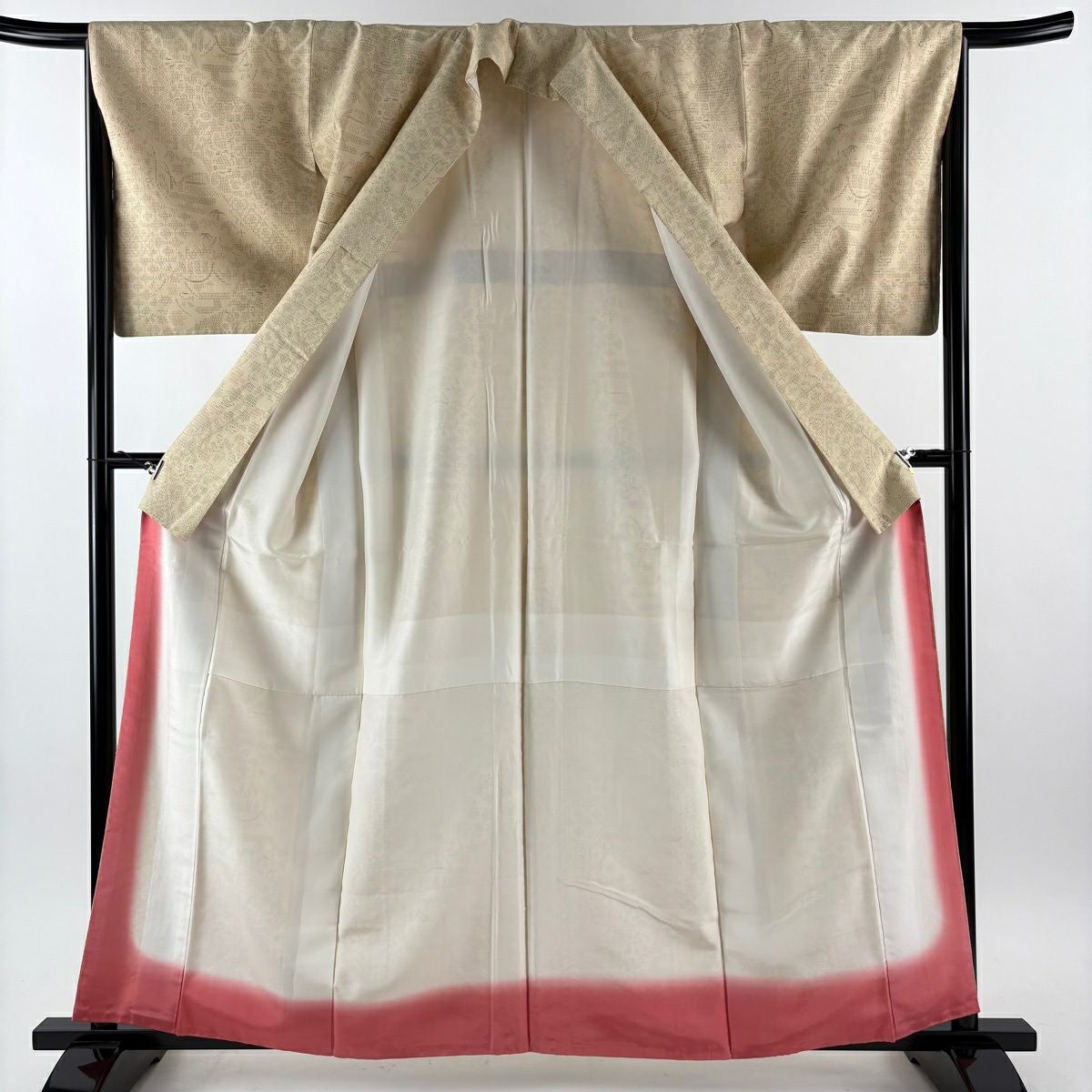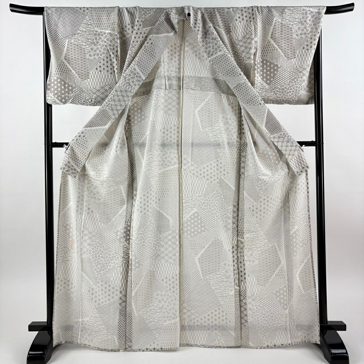 【在庫一掃】 【美品】 お召 身丈156cm 裄丈62.5cm S 袷 縦縞 麻の葉 ベージュ 正絹 逸品