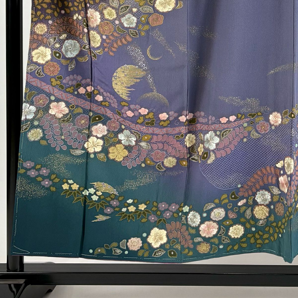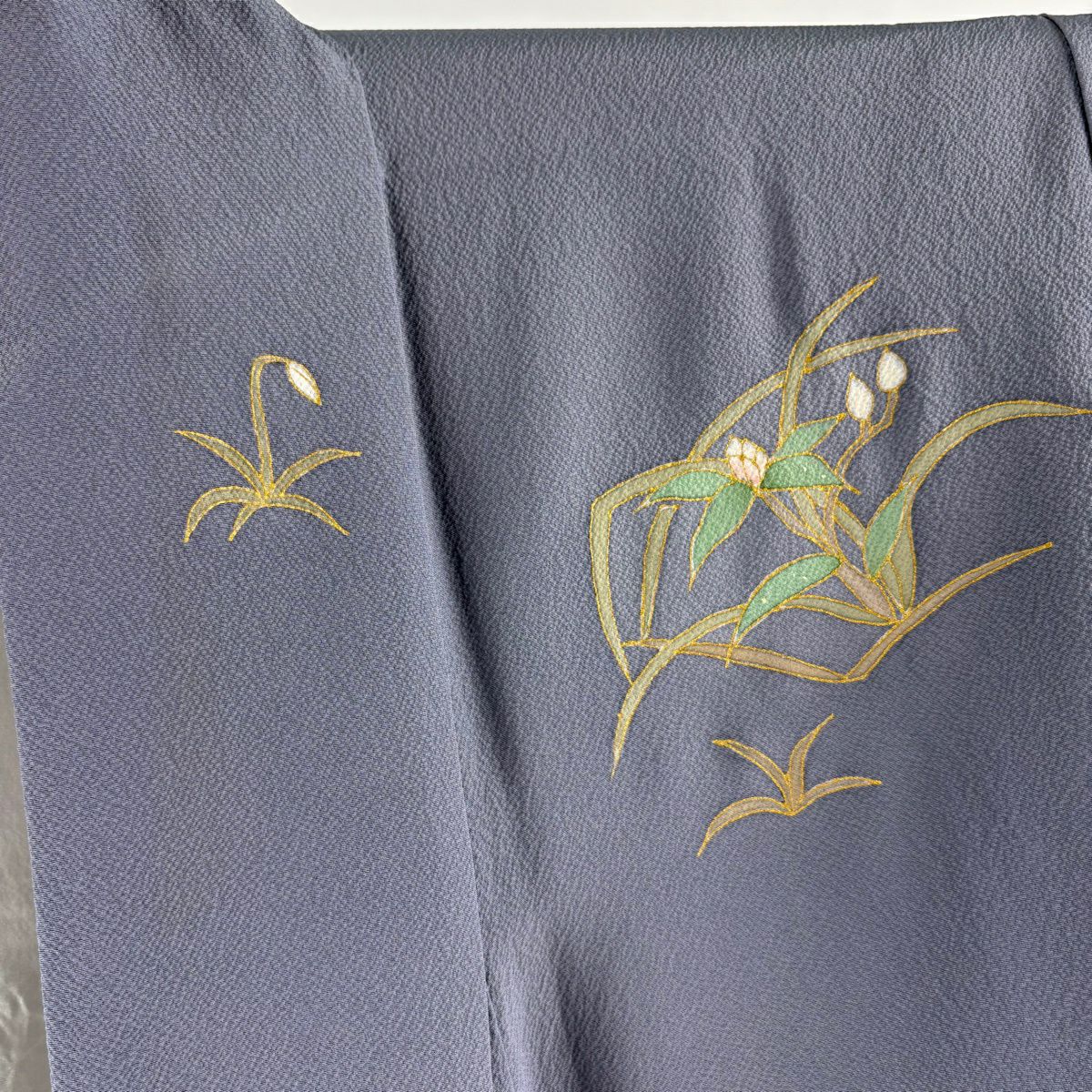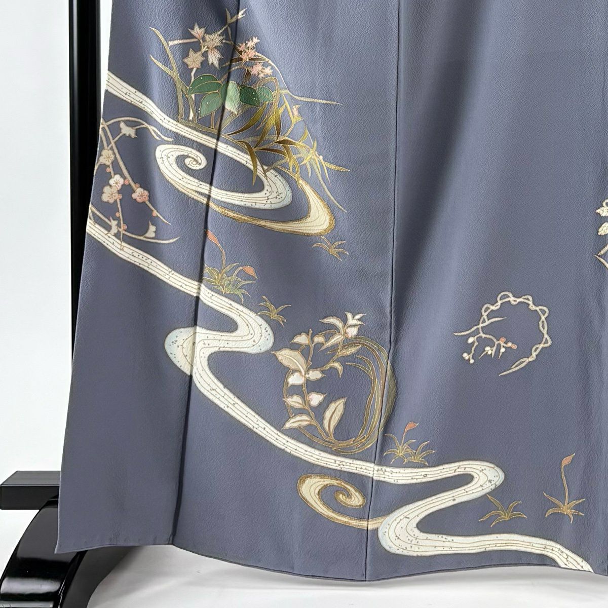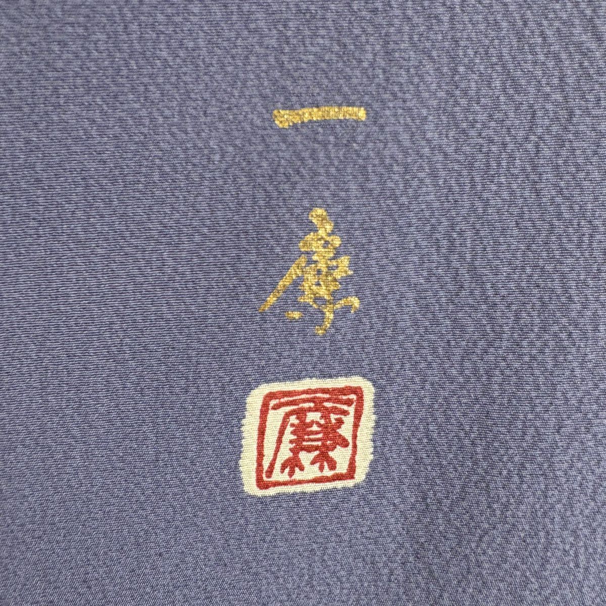訪問着 身丈174cm 裄丈67.5cm L 袷 帝王紫 落款あり 華文 和楽器 金糸 金彩 青灰色 正絹 逸品