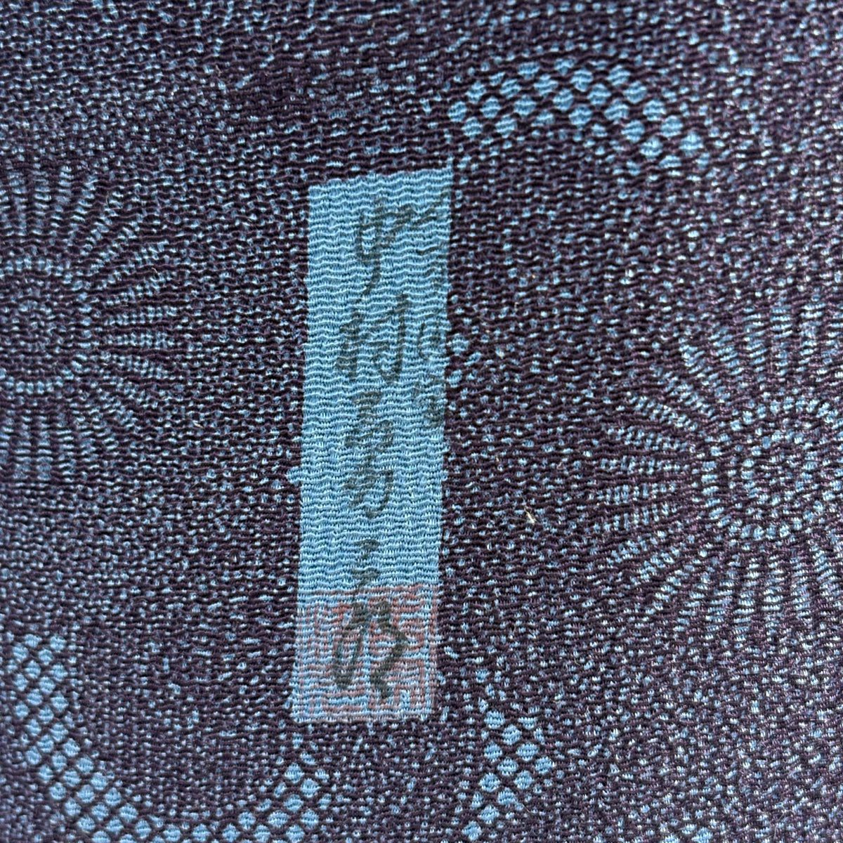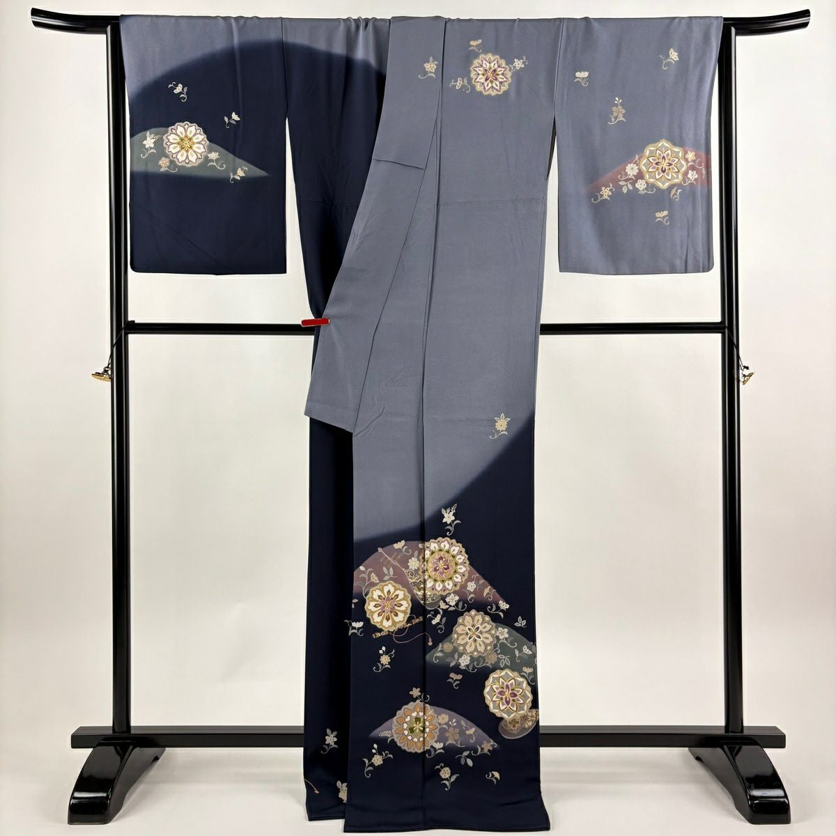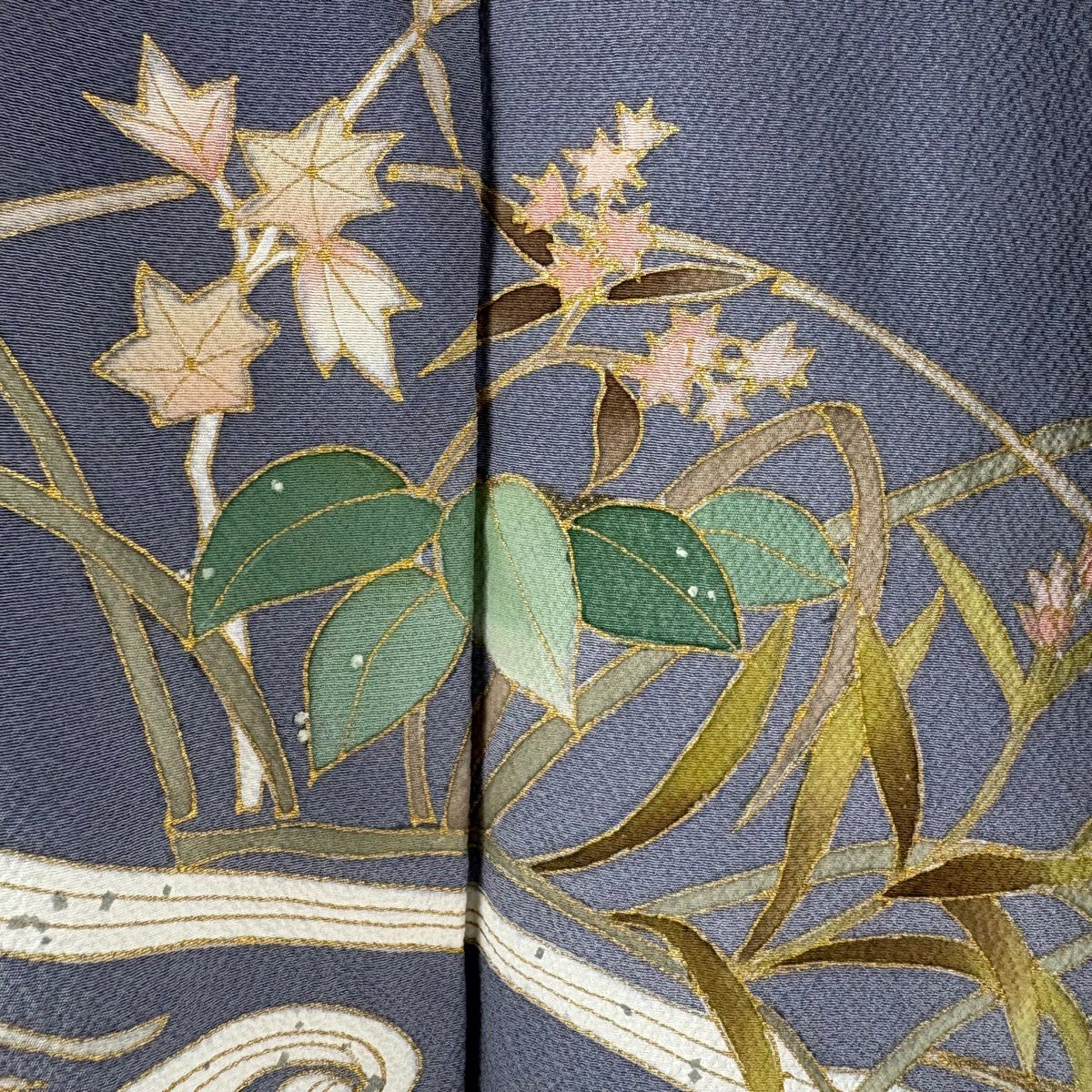 訪問着 身丈174cm 裄丈67.5cm L 袷 帝王紫 落款あり 華文 和楽器 金糸 金彩 青灰色 正絹 逸品