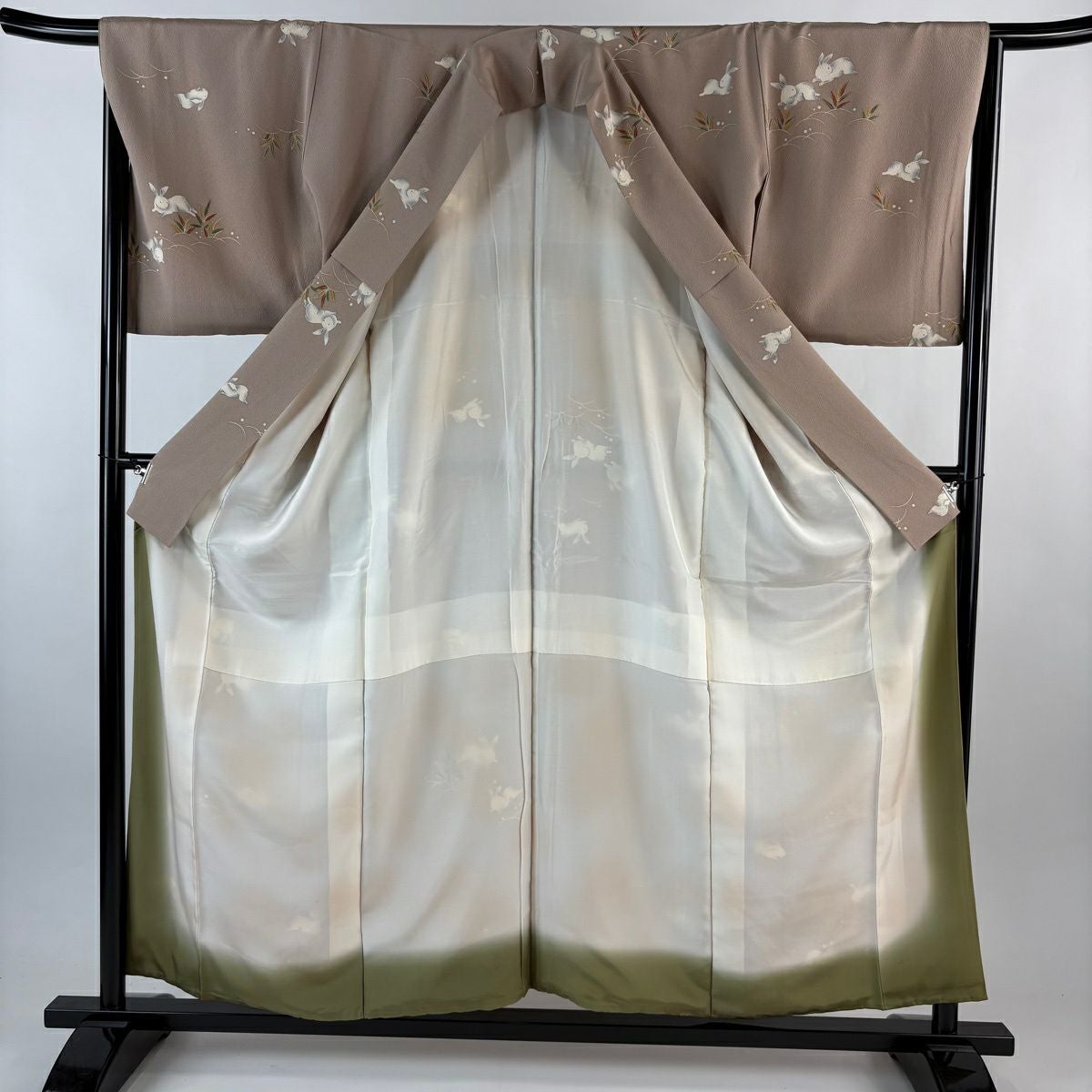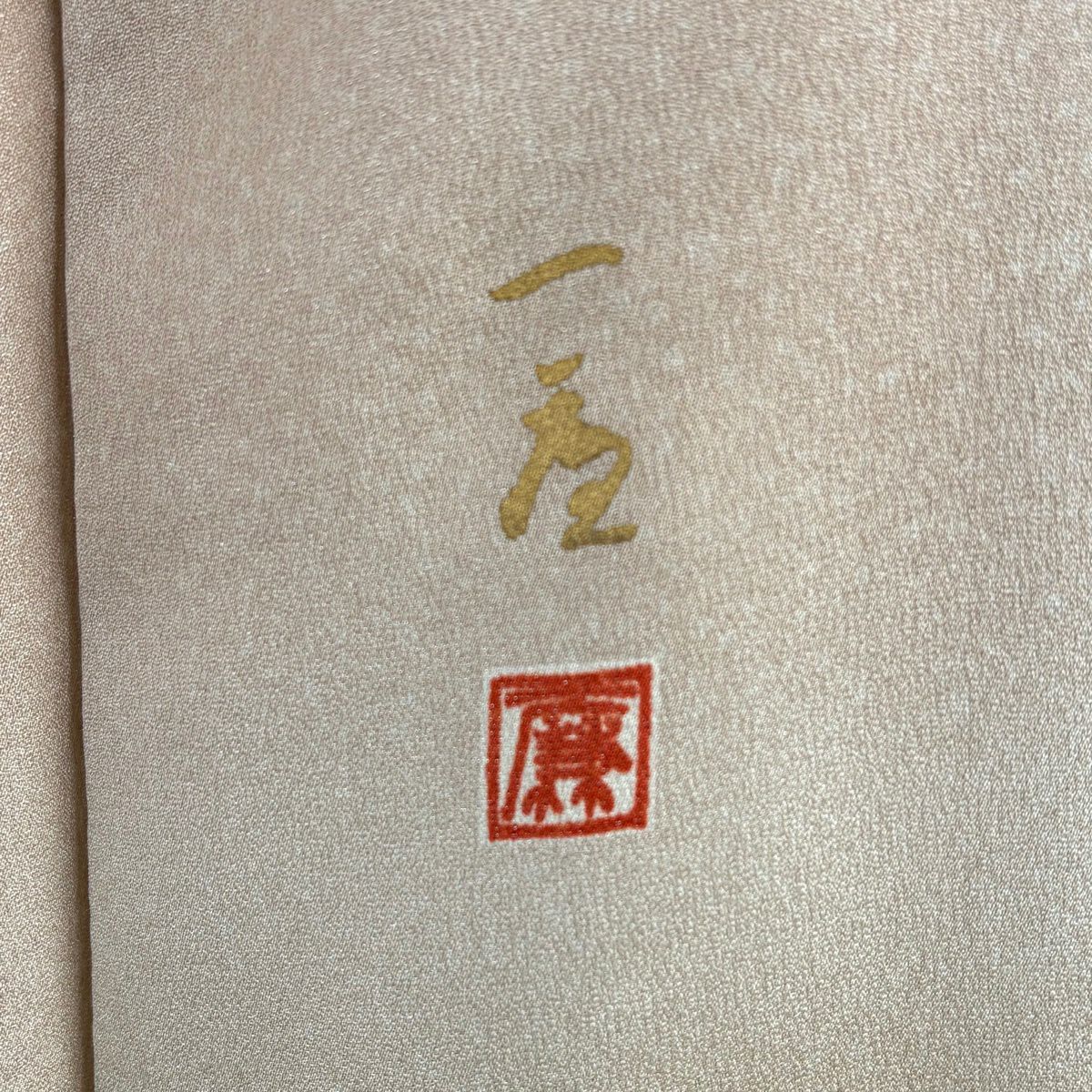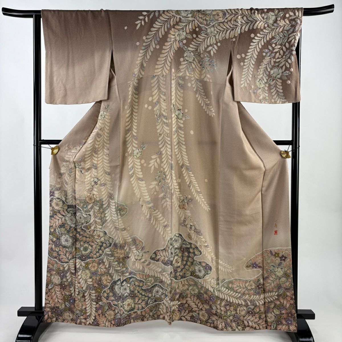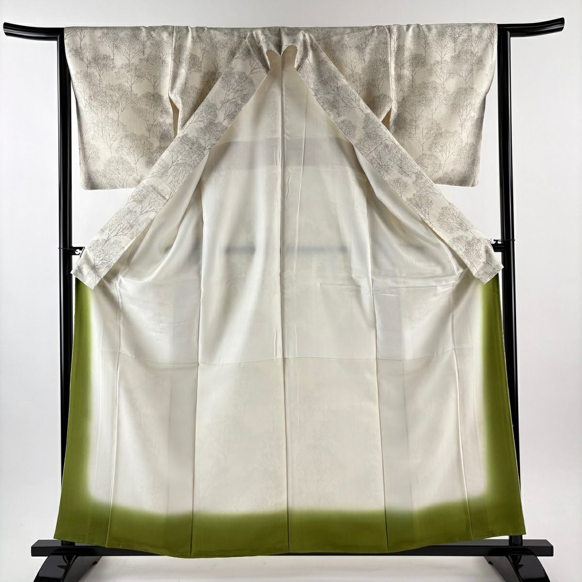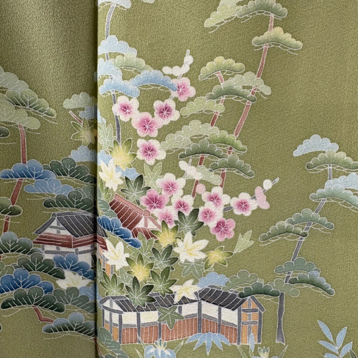付下げ 身丈158.5cm 裄丈66cm M 袷 南 克治 落款あり 建物 松竹梅 ぼかし 抹茶色 正絹 逸品