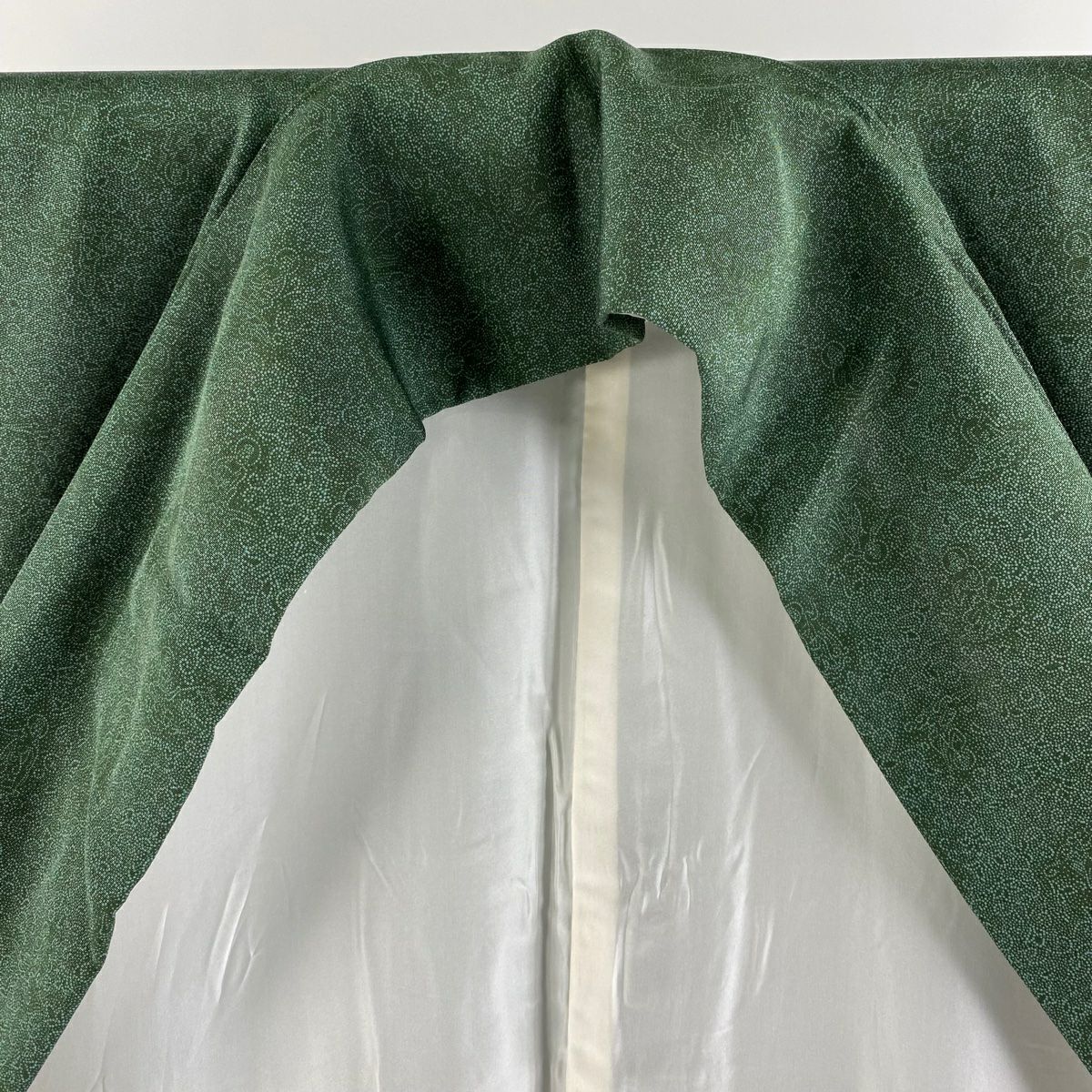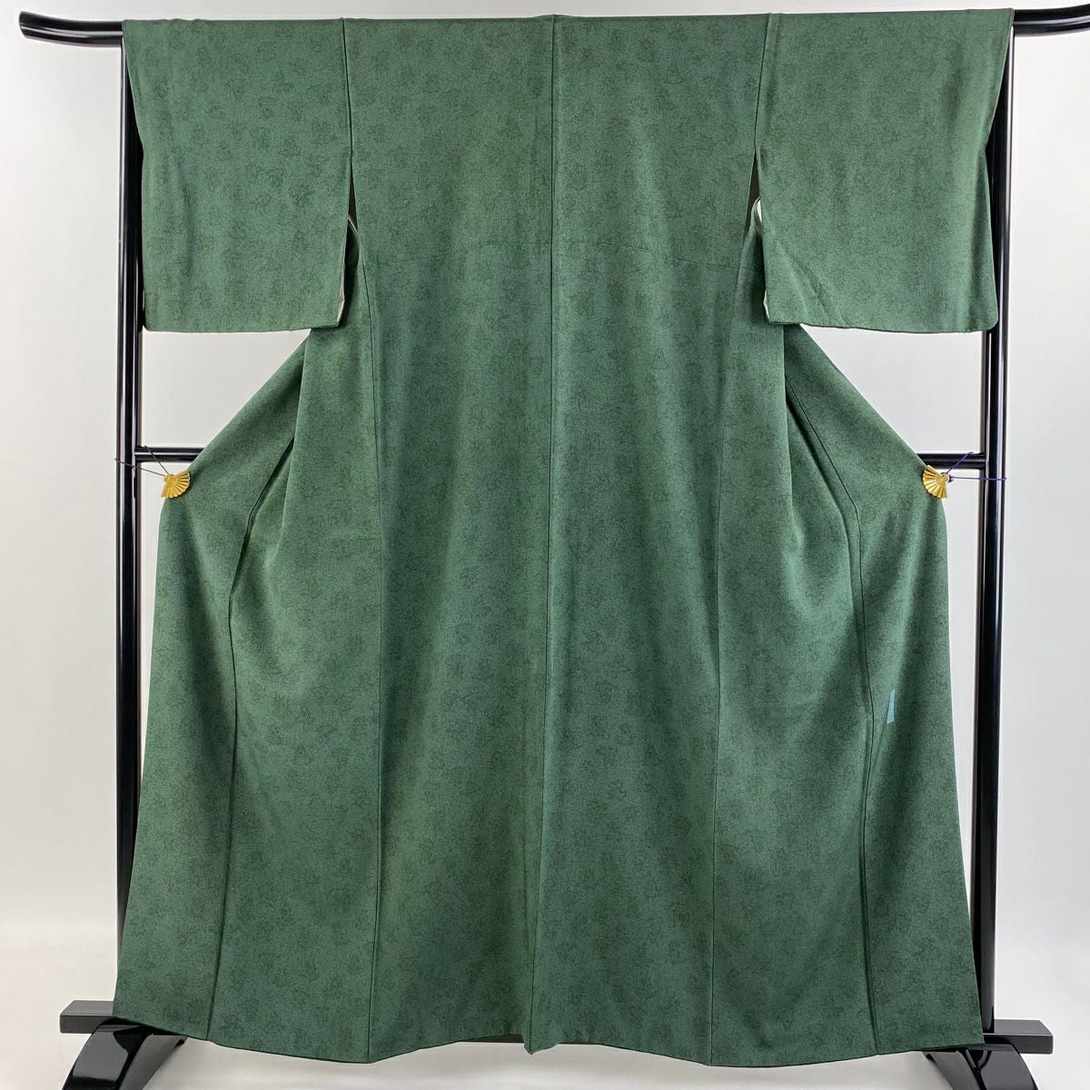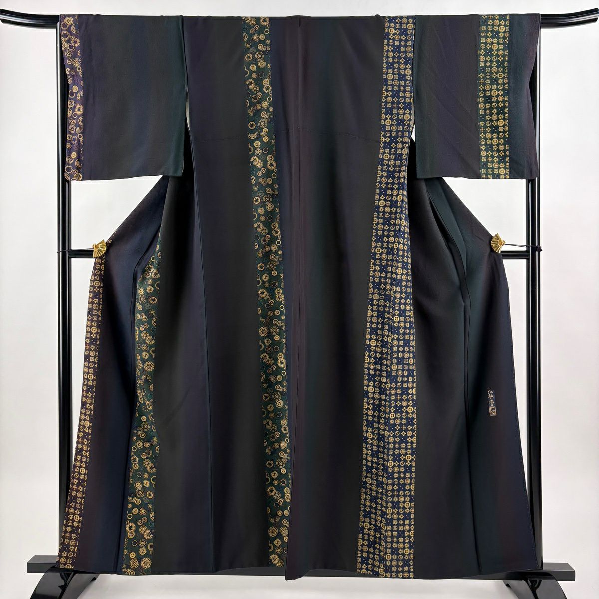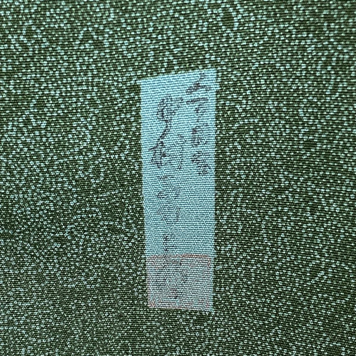 付下げ 身丈158.5cm 裄丈68cm L 袷 前田仁仙 落款あり 幾何学 金彩 ちりめん 深緑 正絹 逸品