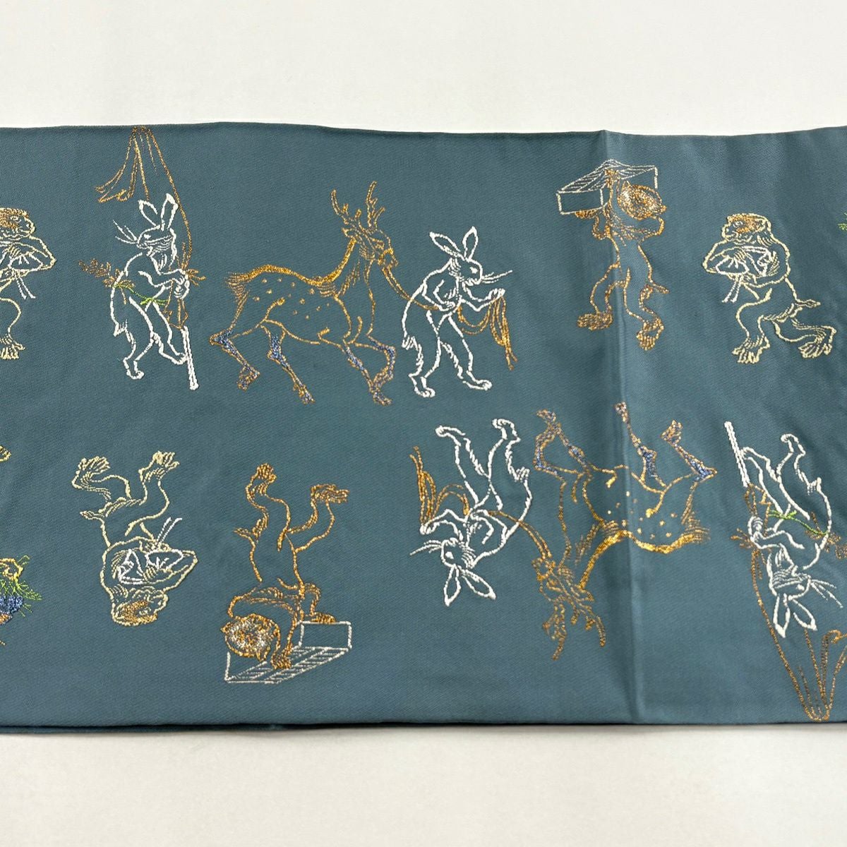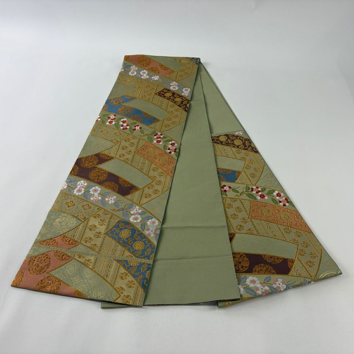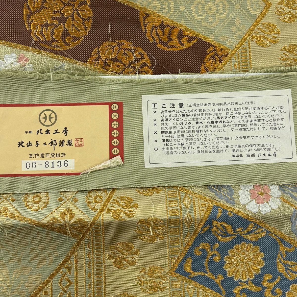 【在庫一掃】 【美品】 袋帯 逸品 北出与三郎 落款あり 本袋 直狐文二人静文様 金糸 箔 灰緑 六通 正絹