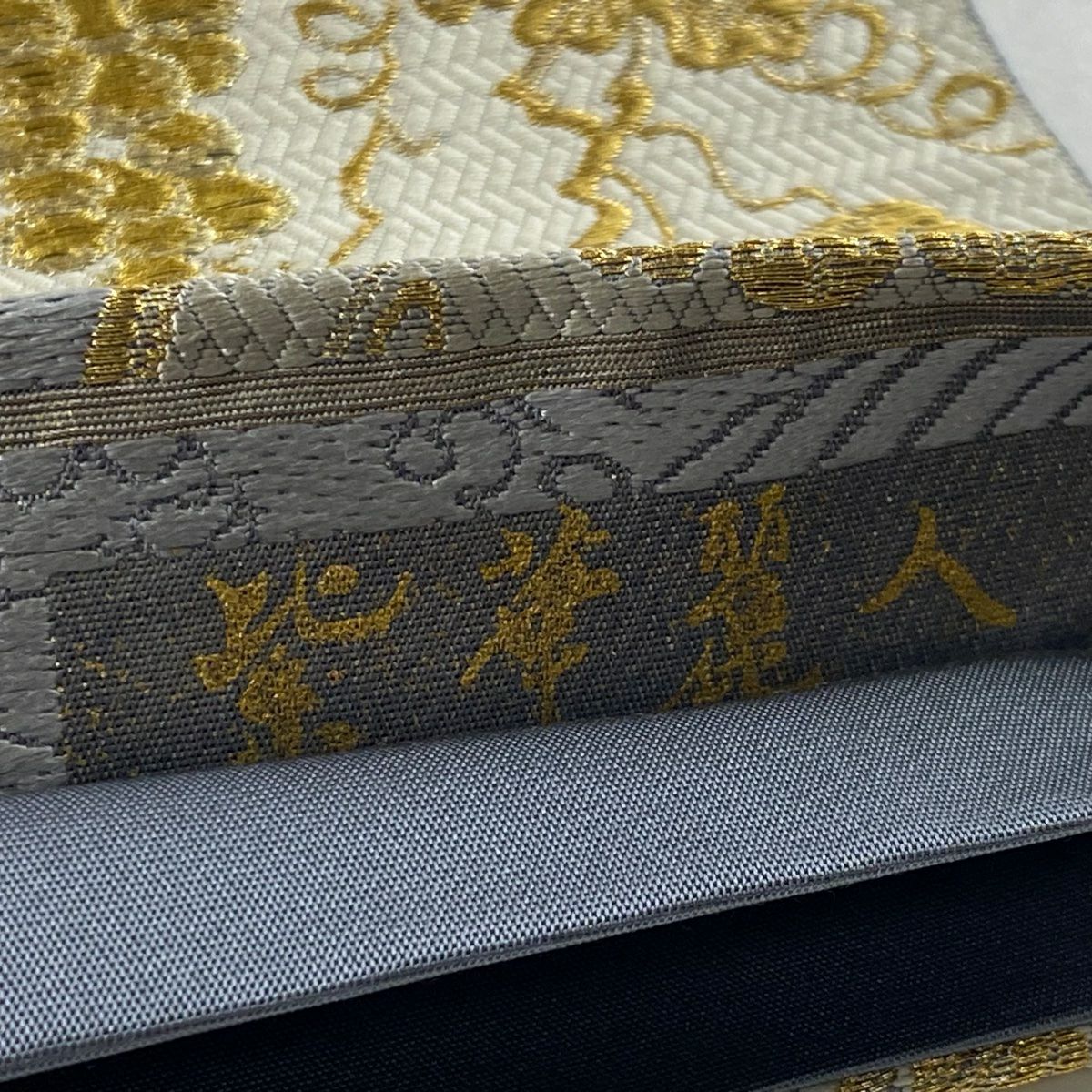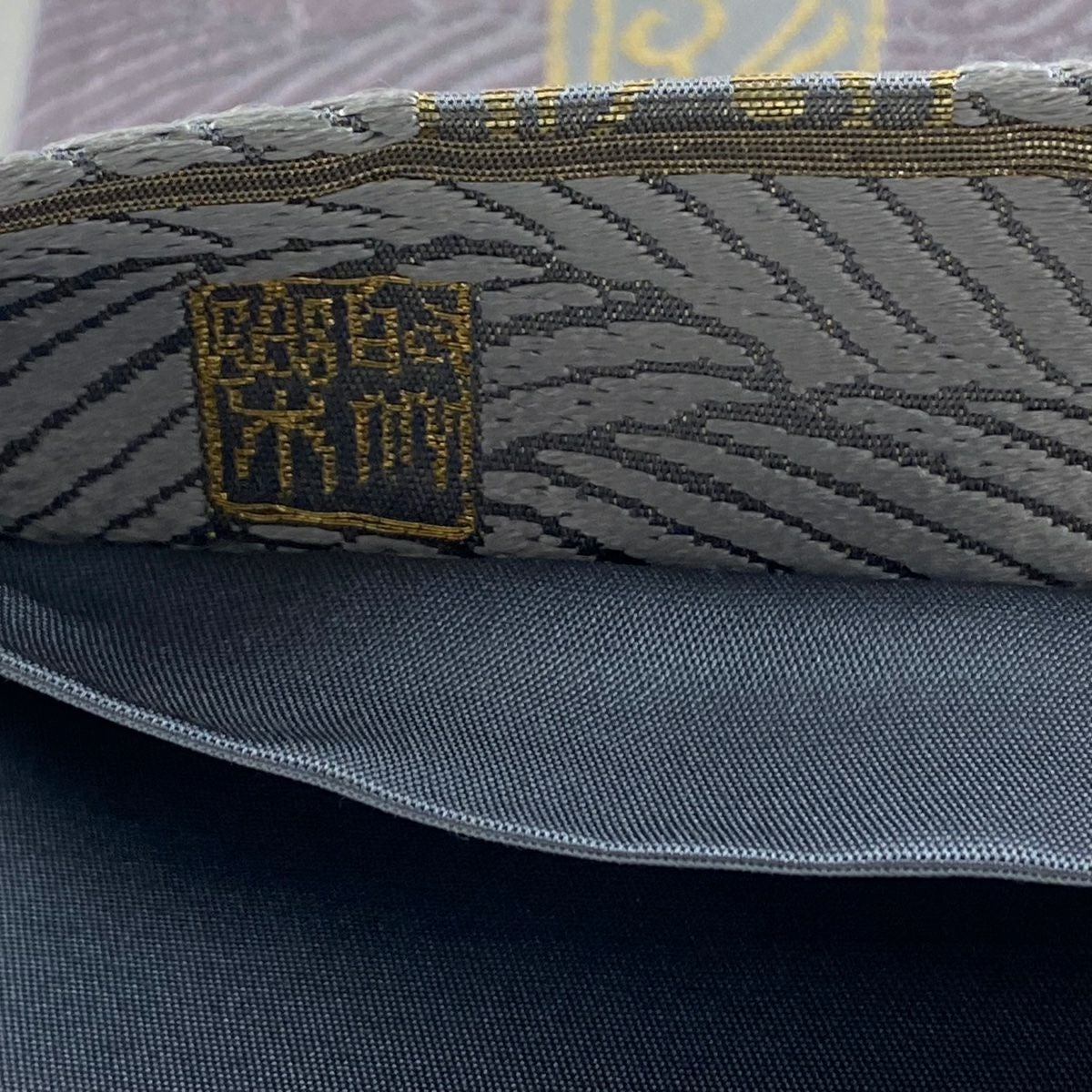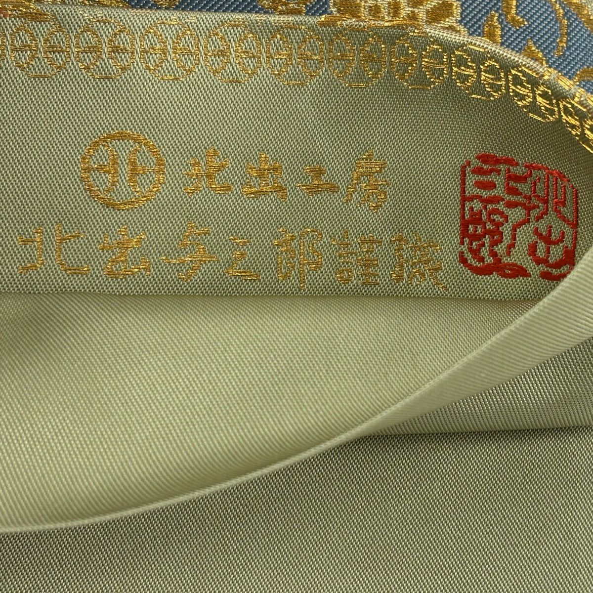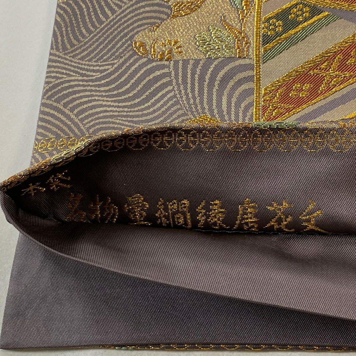 【在庫一掃】 【美品】 袋帯 逸品 北出与三郎 落款あり 本袋 名物暈繝縁唐花文 金糸 箔 灰紫 六通 正絹