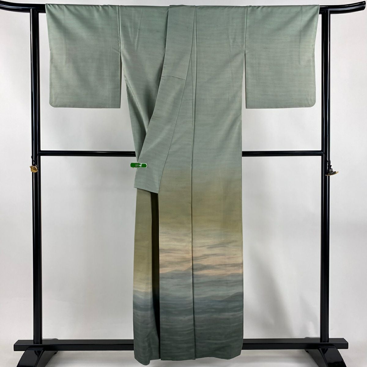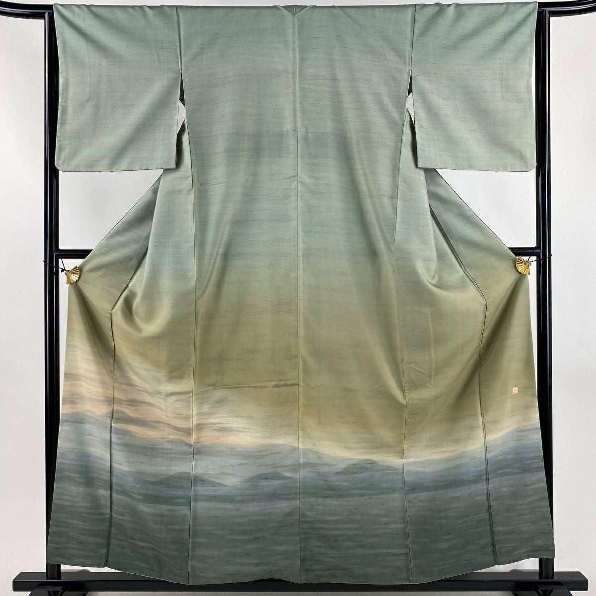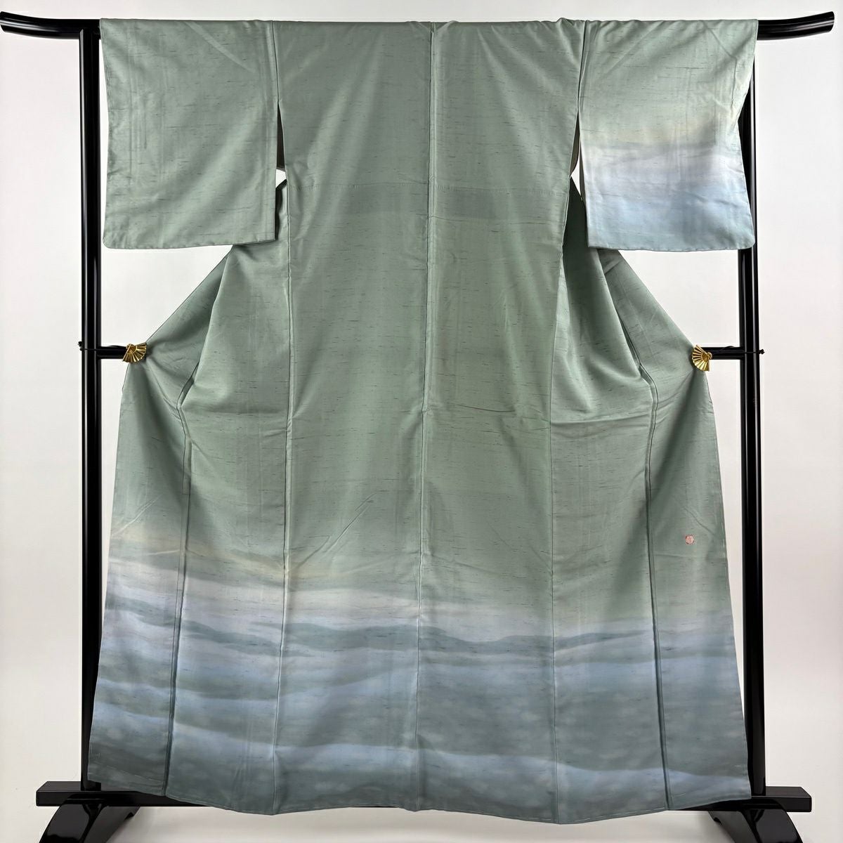 【美品】 付下げ 身丈160cm 裄丈65cm M 袷 牛首紬地 落款あり 水面 霞 ぼかし 灰緑 正絹 逸品