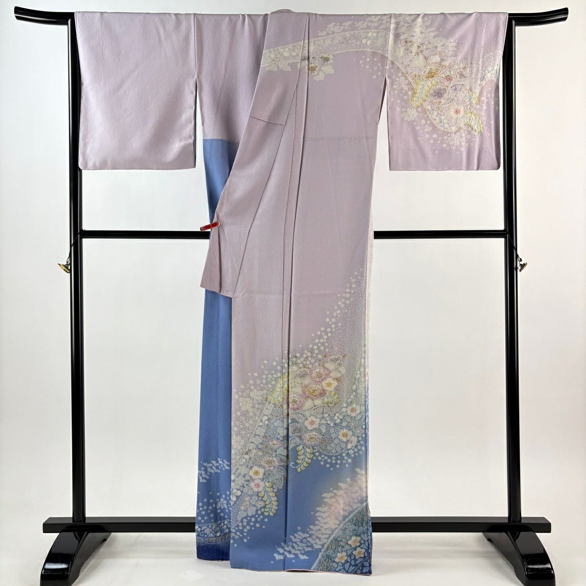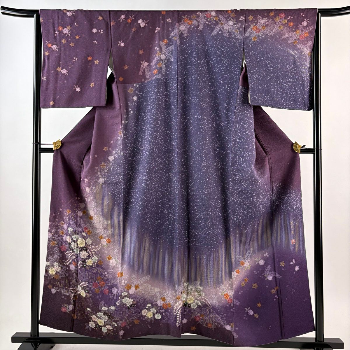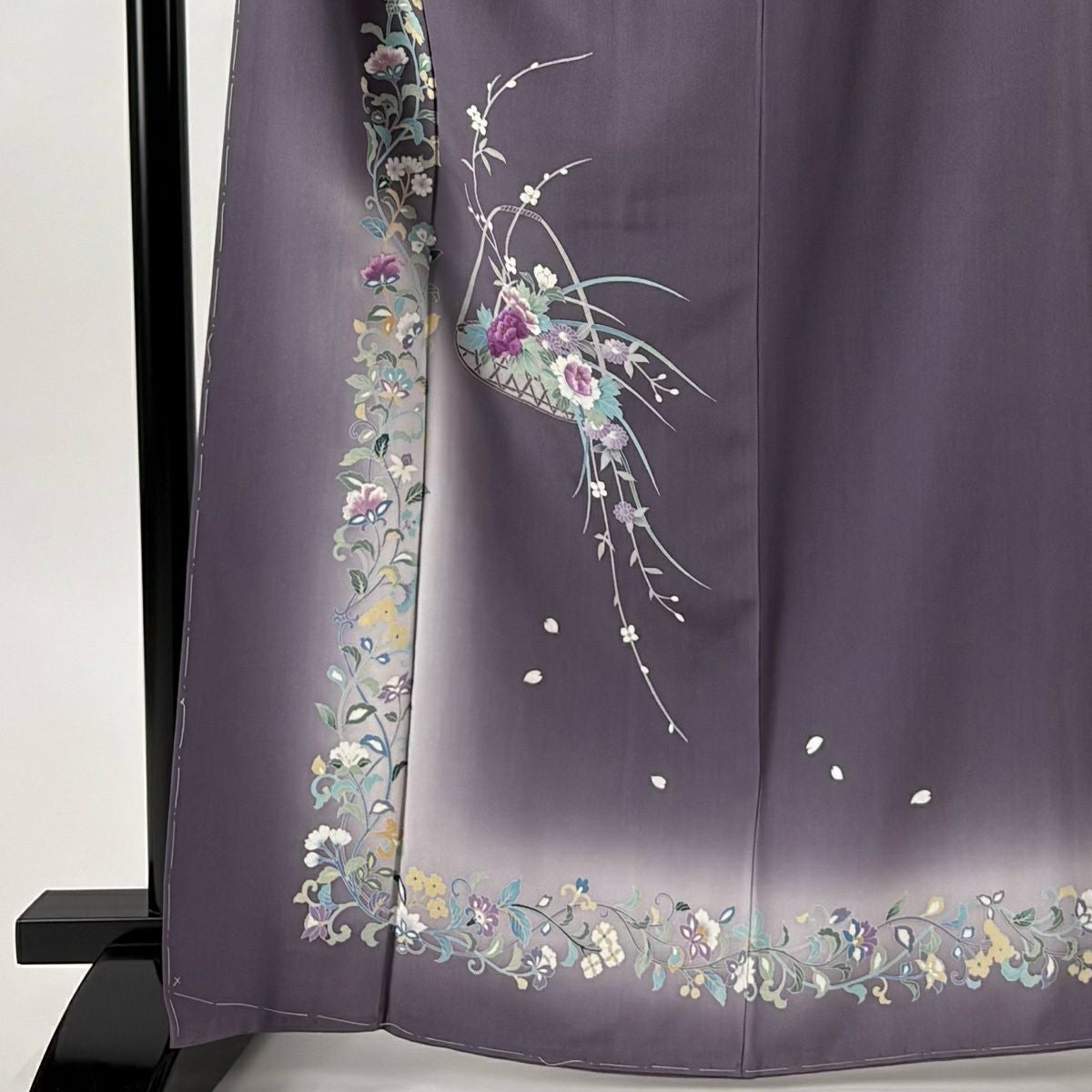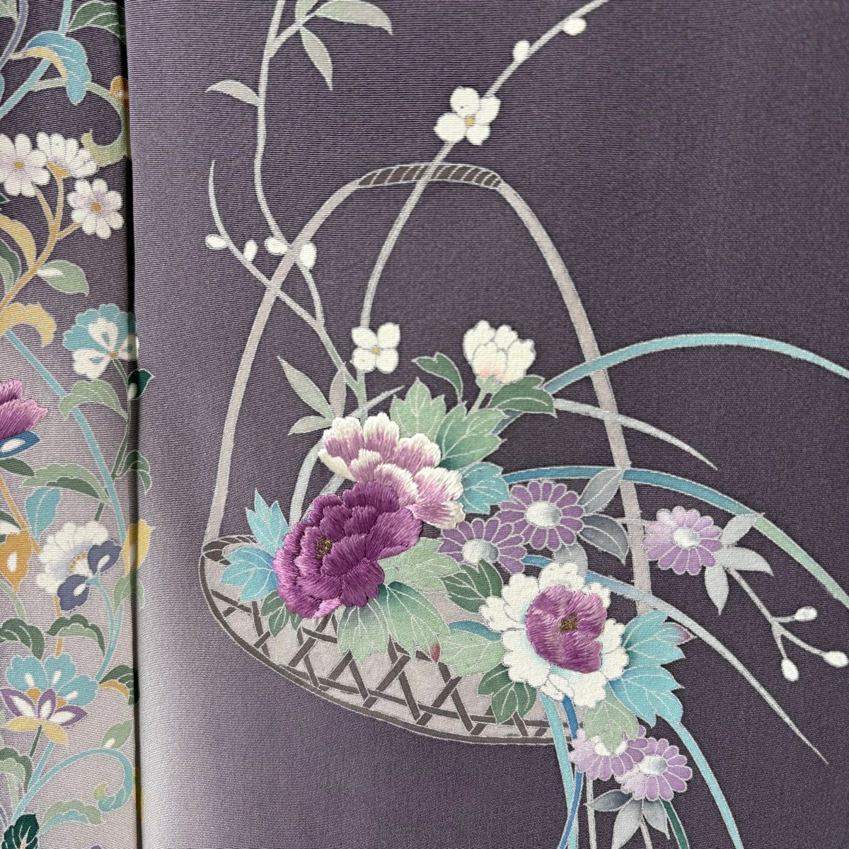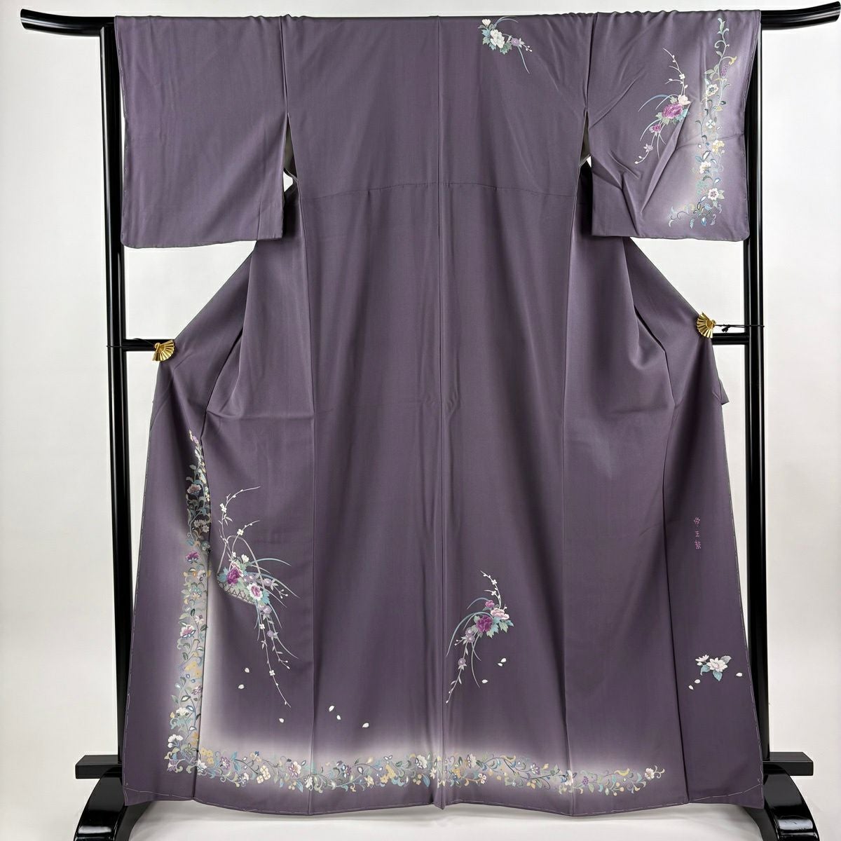 訪問着 身丈166cm 裄丈64.5cm M 袷 帝王紫 落款あり 花籠 花唐草 刺繍 ぼかし 灰紫 正絹 逸品
