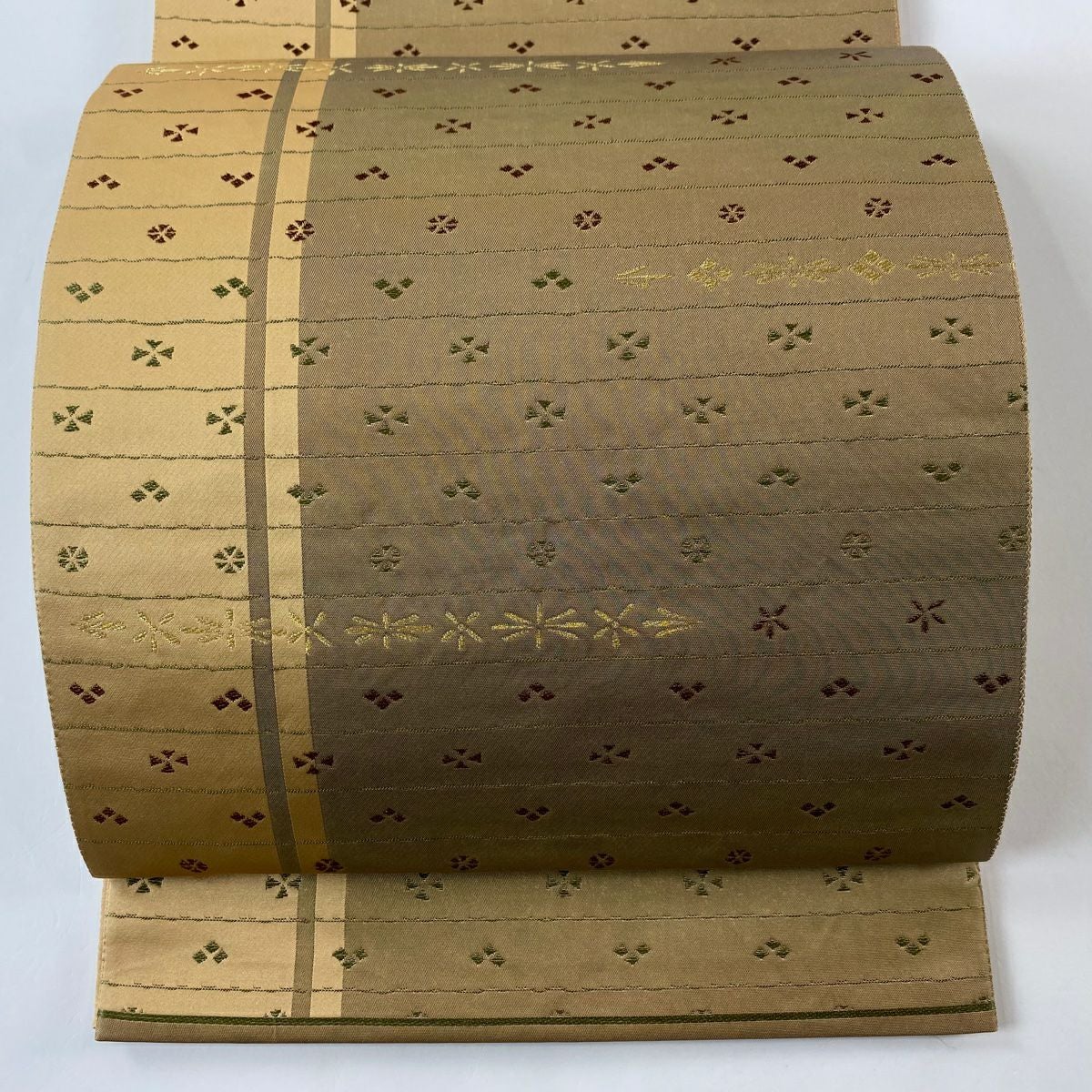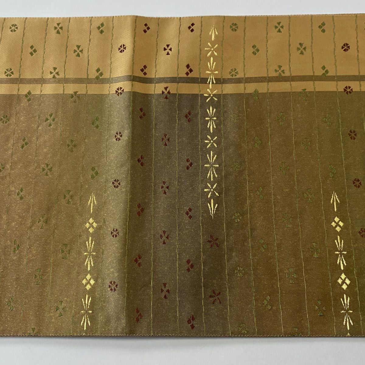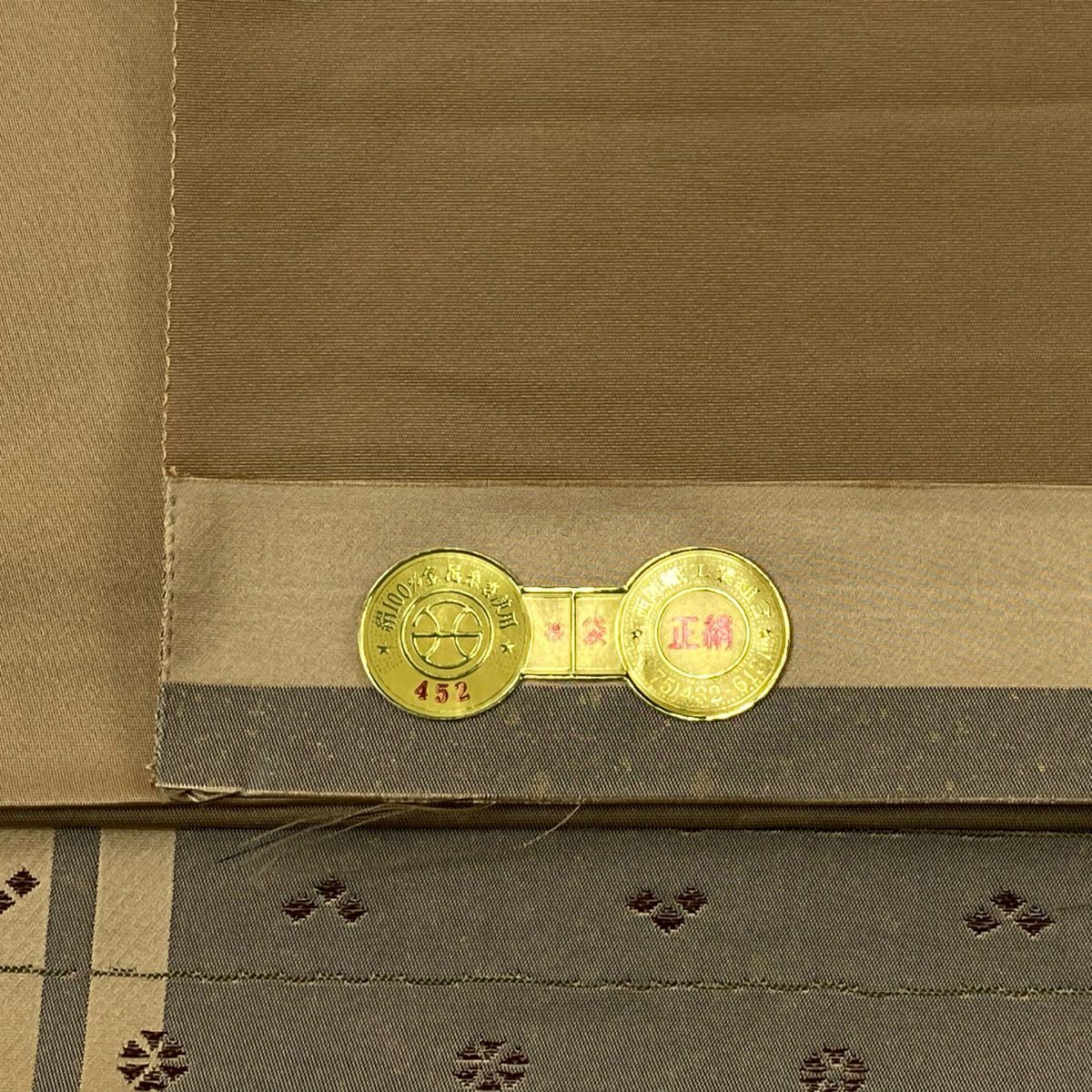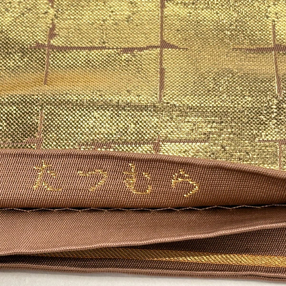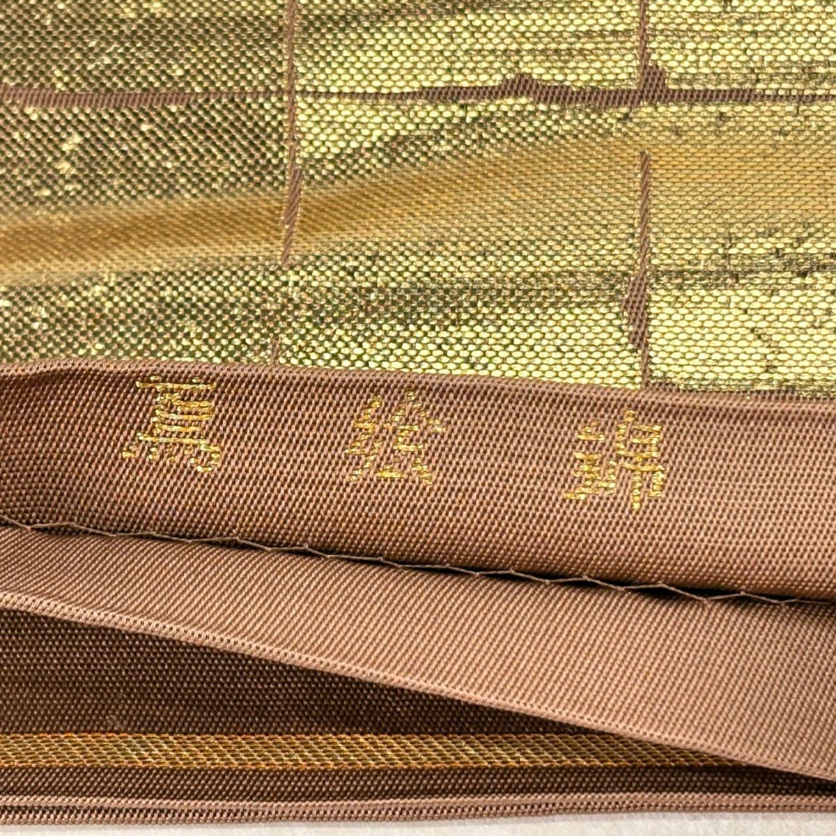 【在庫一掃】 【美品】 袋帯 逸品 となみ織物 落款あり 証紙あり 関西仕立て 縞 菱 金糸 茶色 六通 正絹