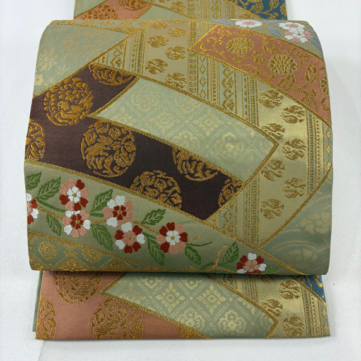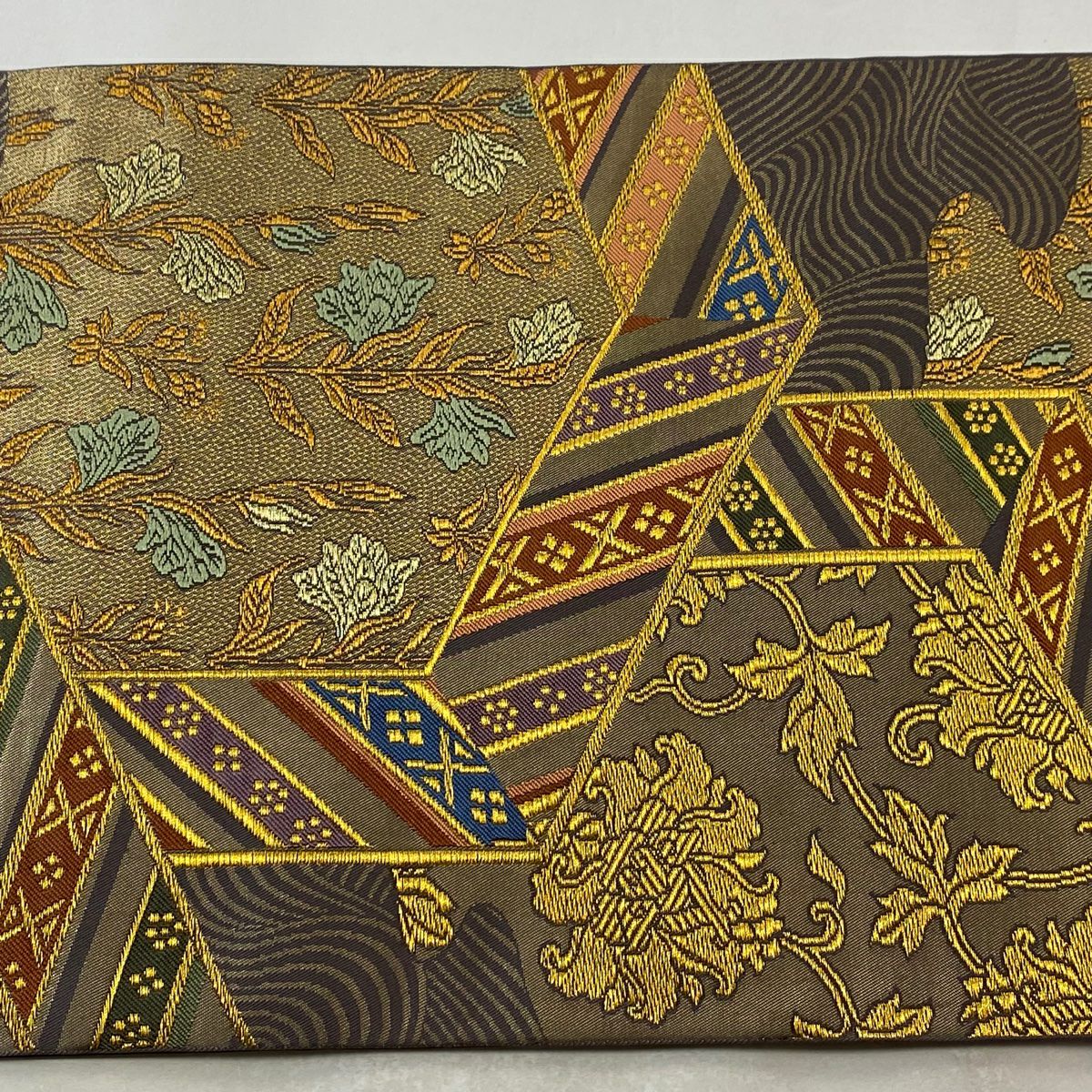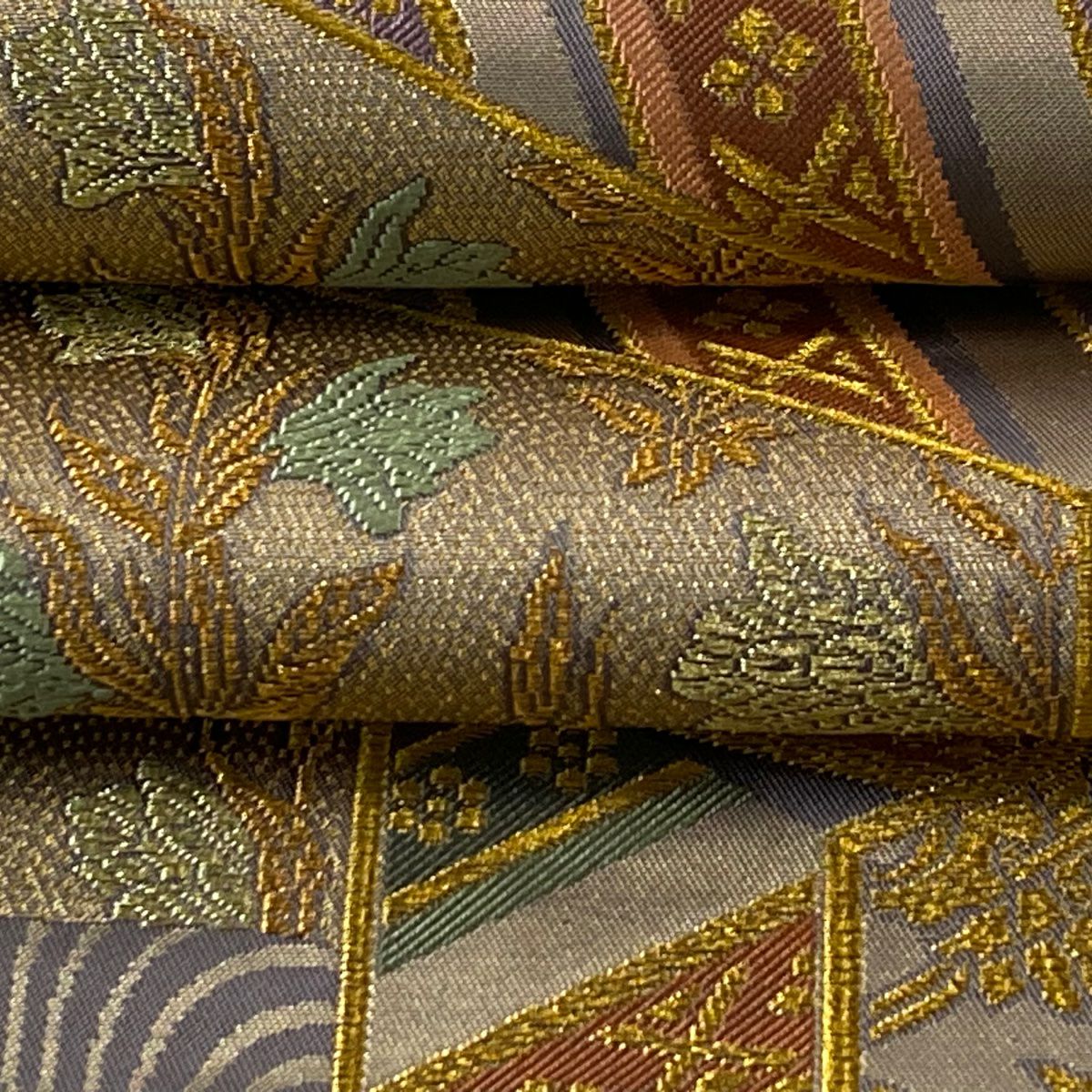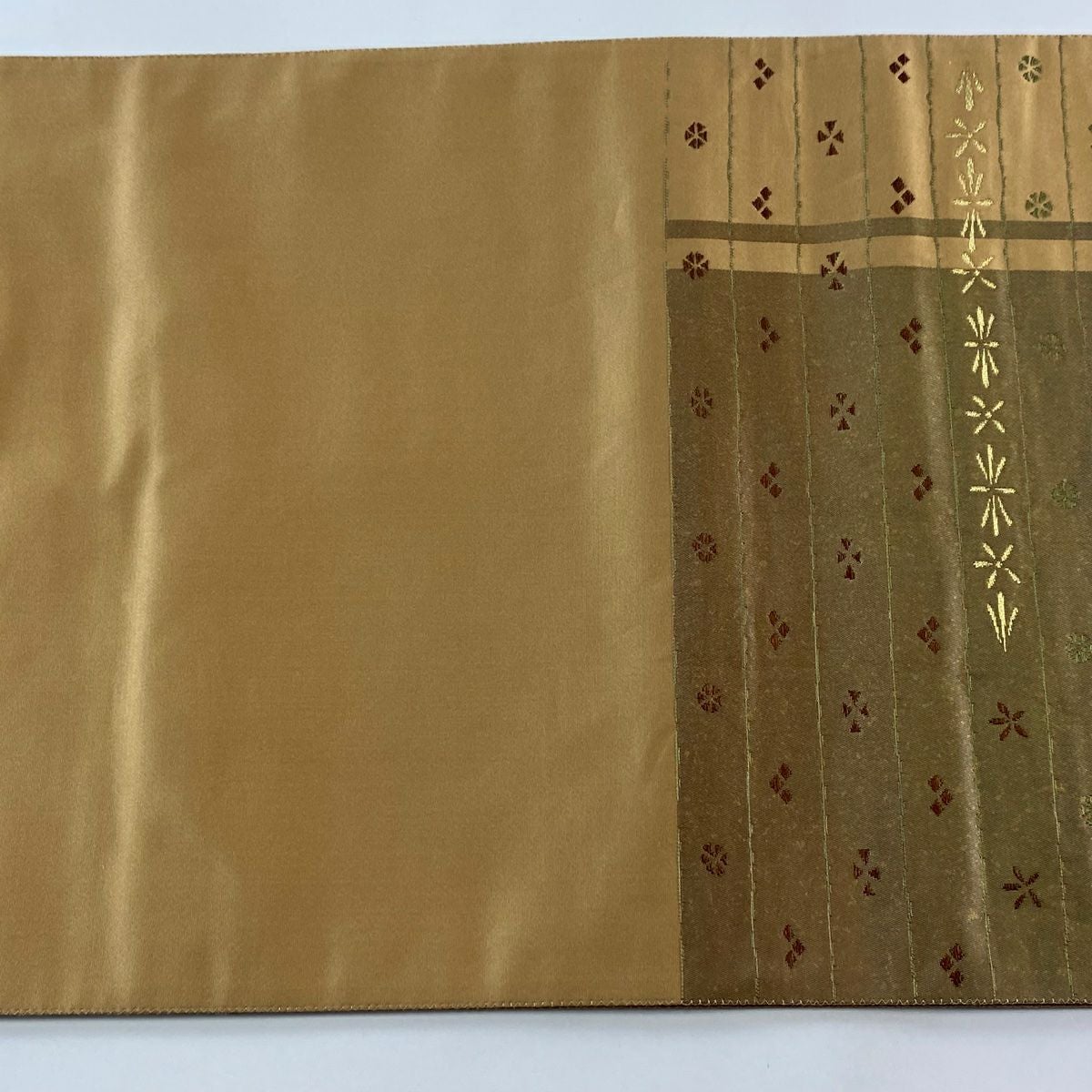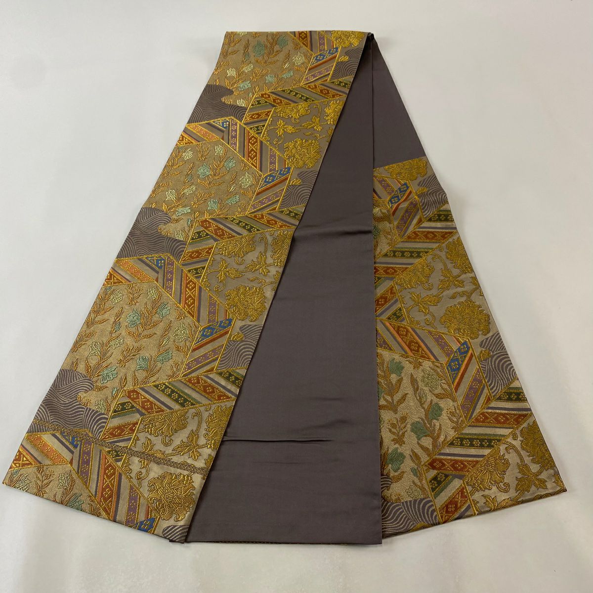 【在庫一掃】 【美品】 袋帯 逸品 となみ織物 落款あり 証紙あり 関西仕立て 縞 菱 金糸 茶色 六通 正絹