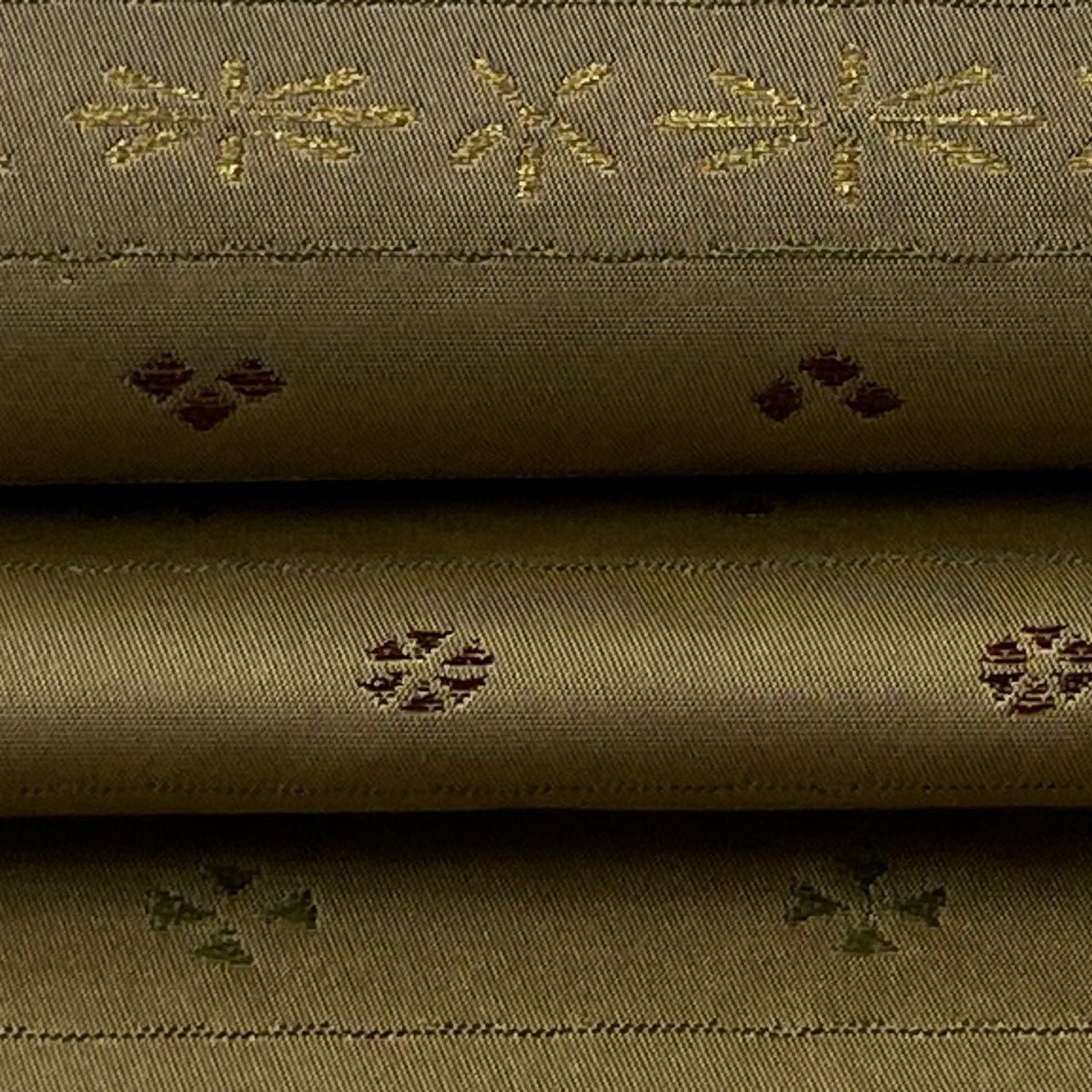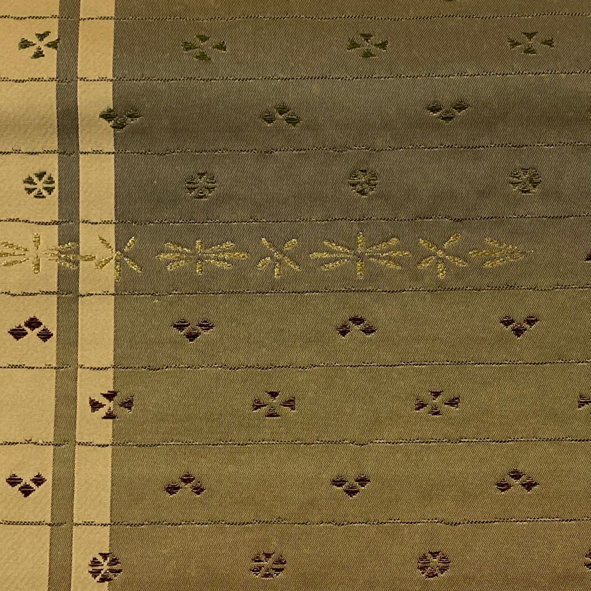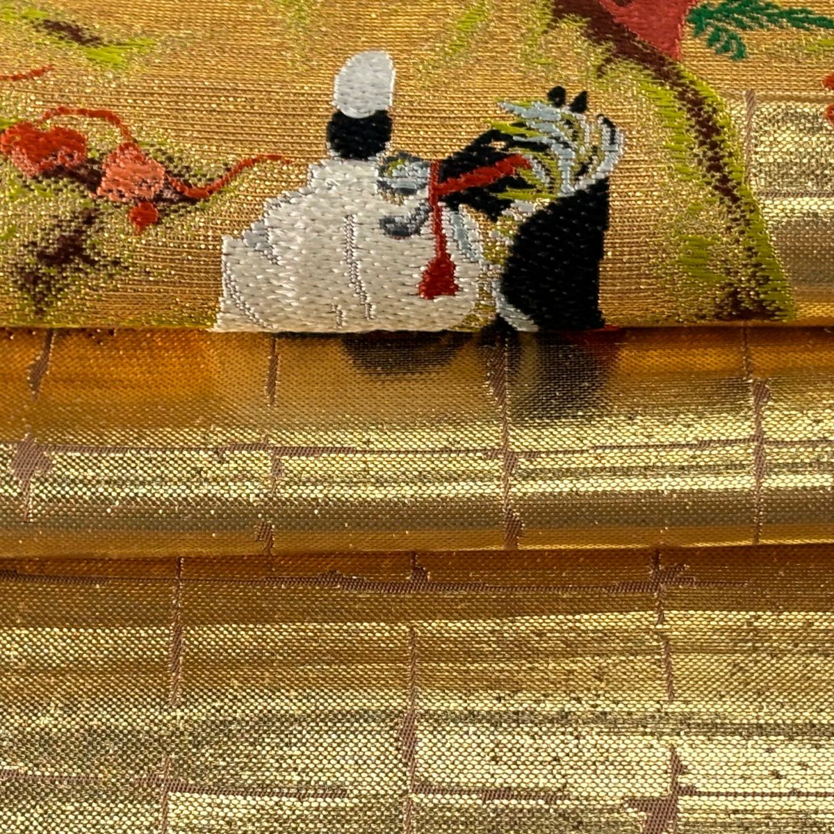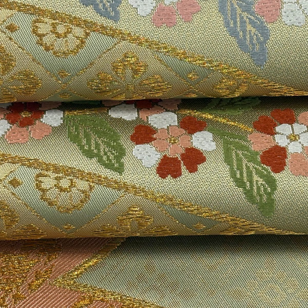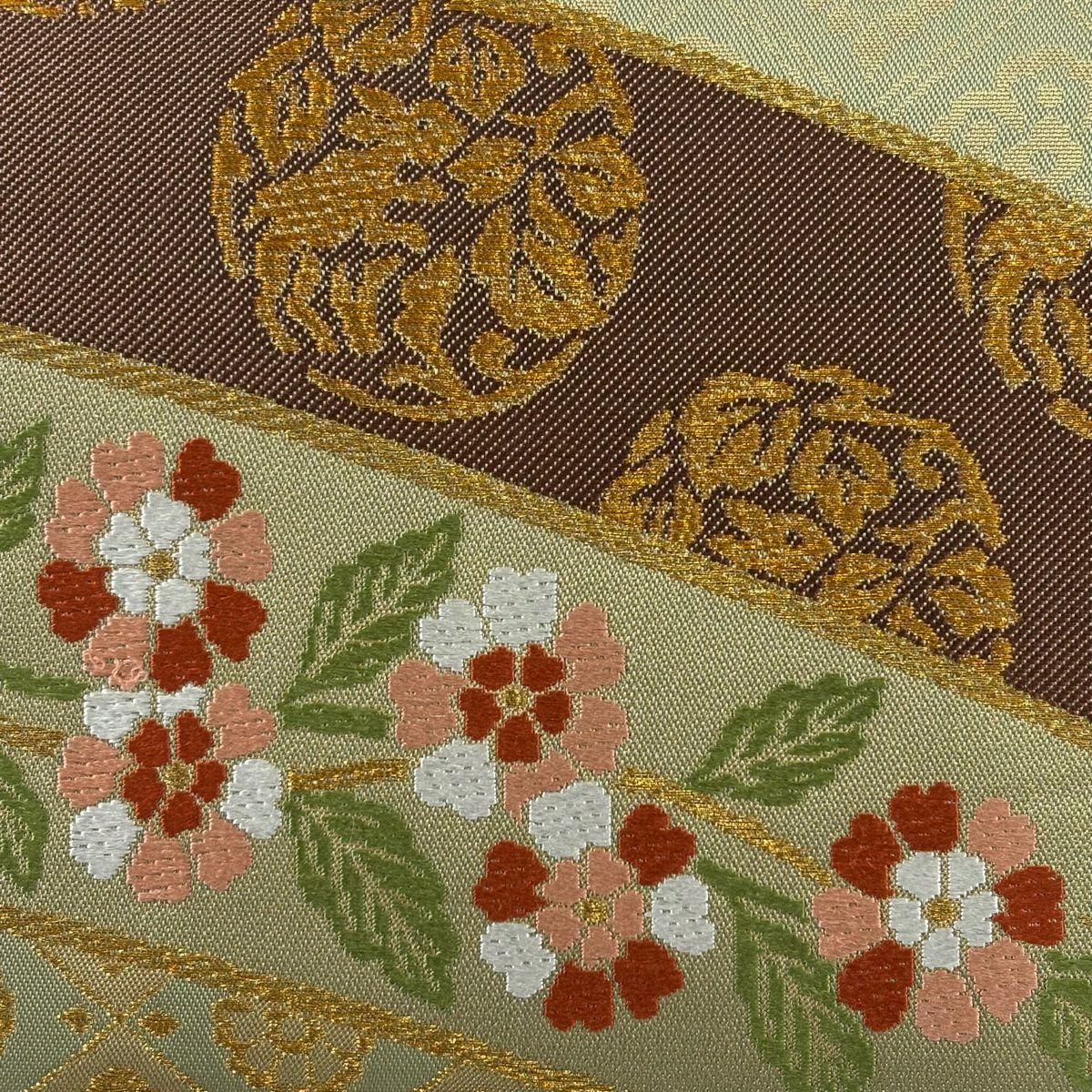 【在庫一掃】 【美品】 袋帯 逸品 となみ織物 落款あり 証紙あり 関西仕立て 縞 菱 金糸 茶色 六通 正絹