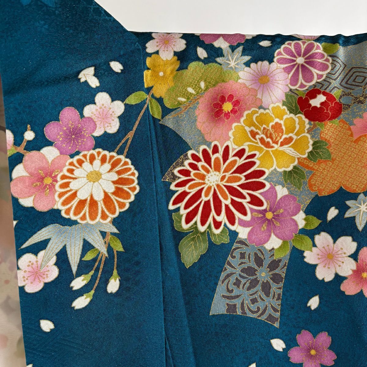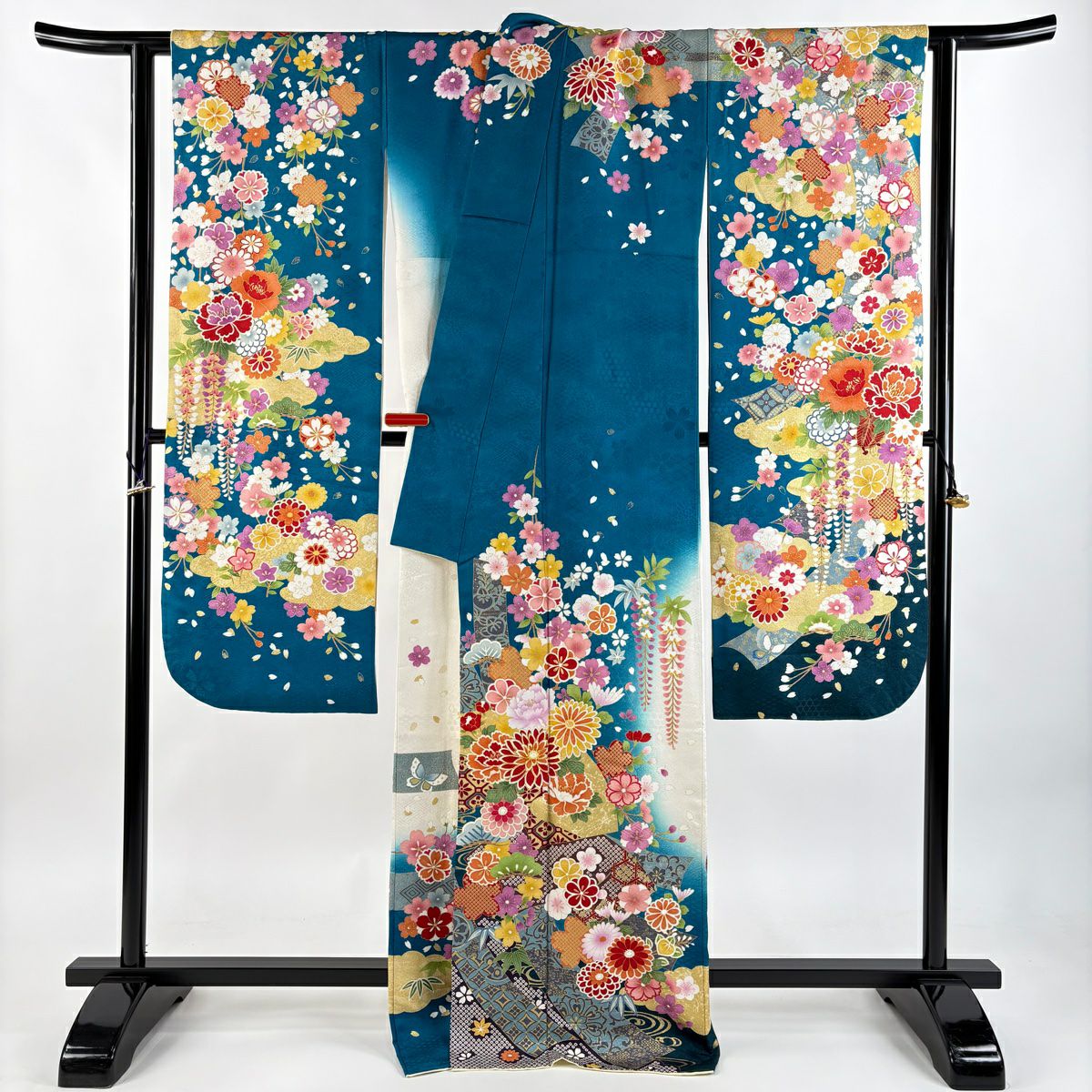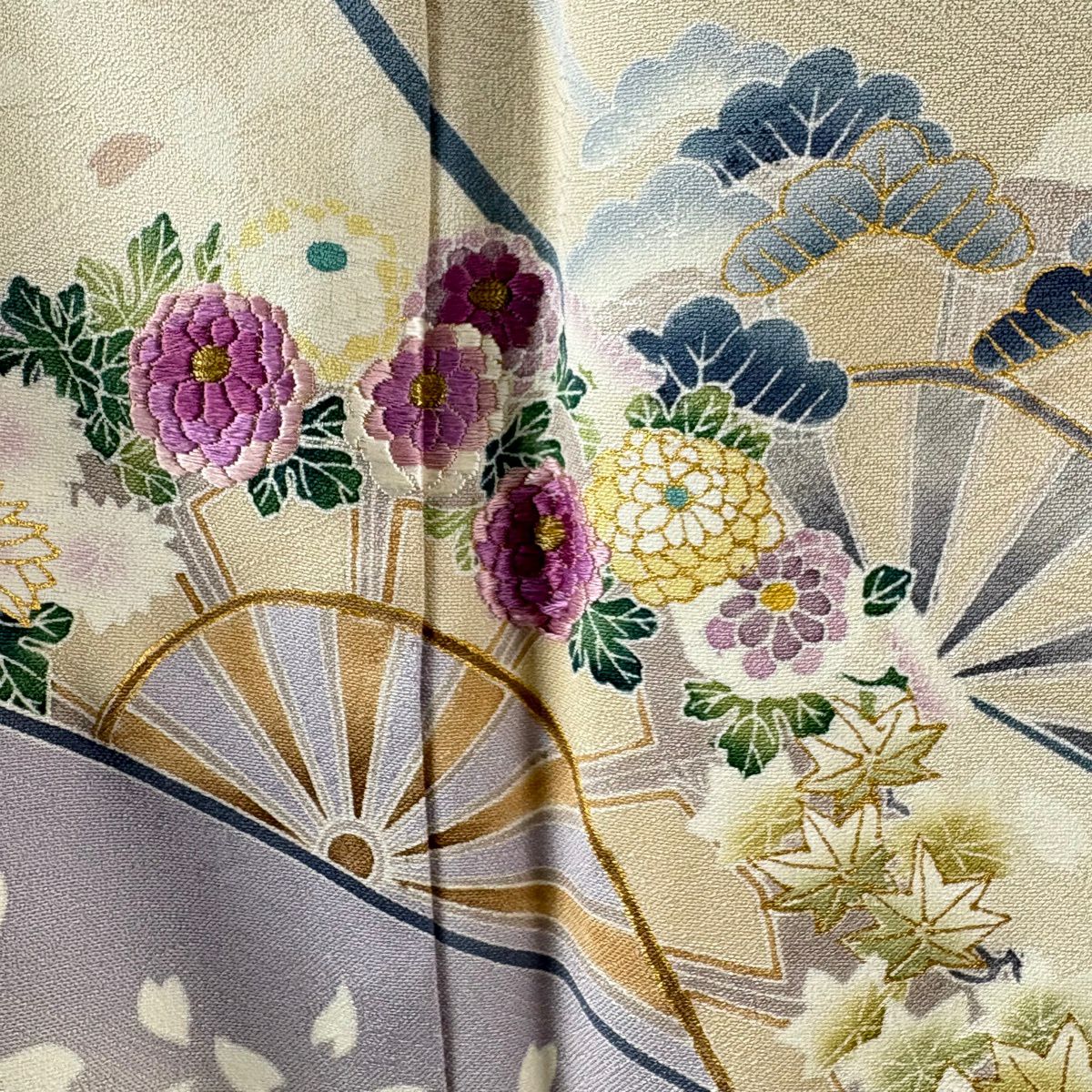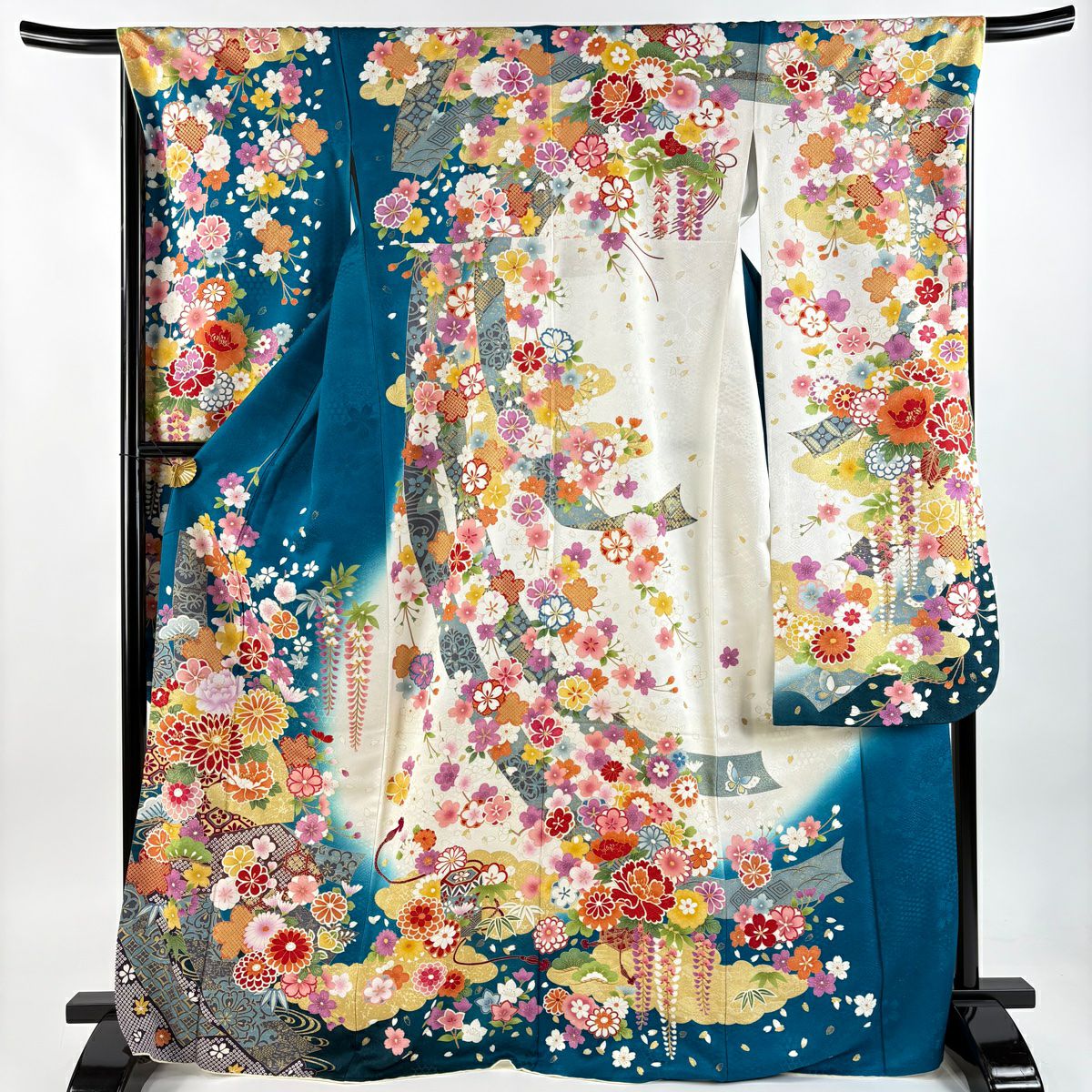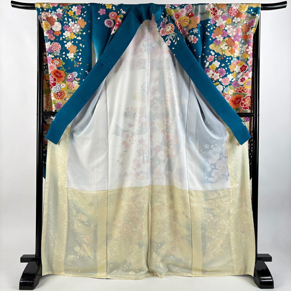 【在庫一掃】 【美品】 振袖 身丈170cm 裄丈68cm L 袷 扇面 草花 銀通し 金糸 青緑 正絹 逸品