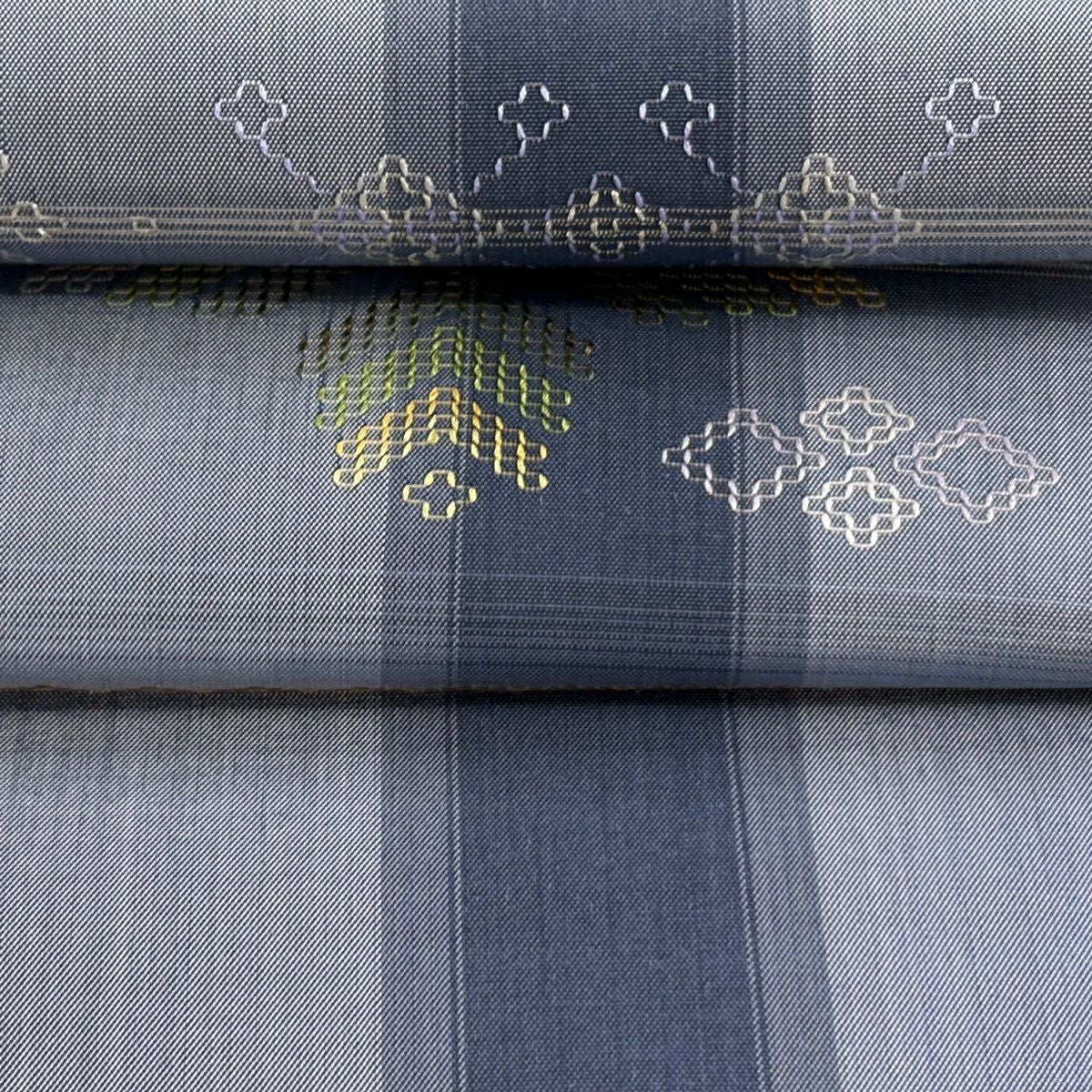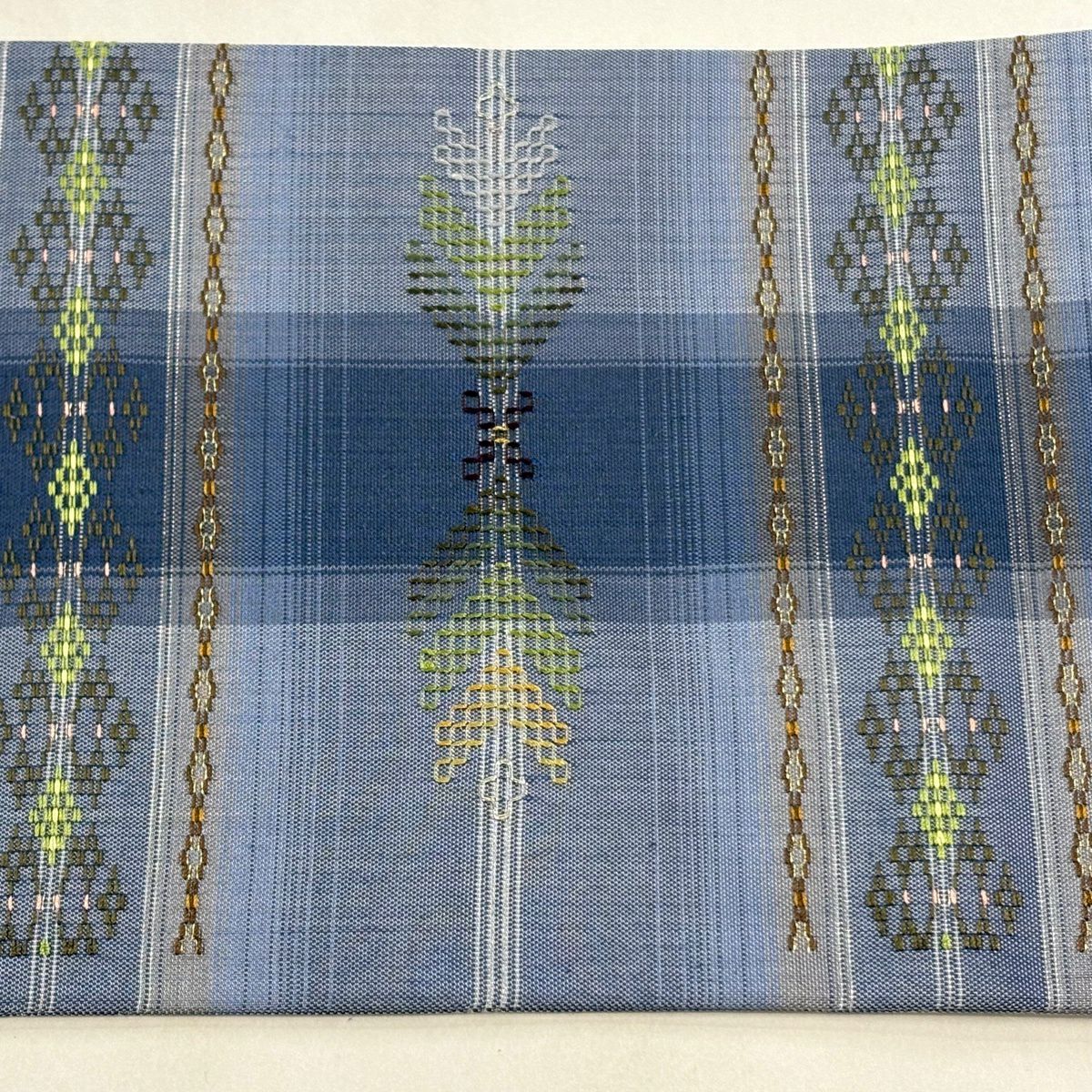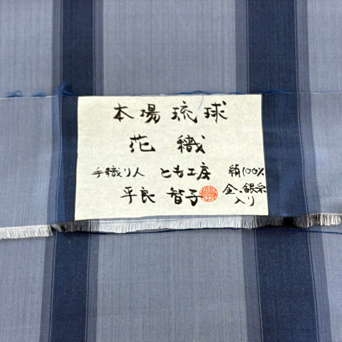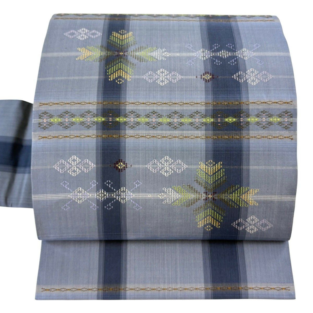 【美品】 名古屋帯 逸品 落款あり 証紙あり 平良智子 本場琉球 格子 幾何学模様 金銀糸 花織 青灰色 正絹