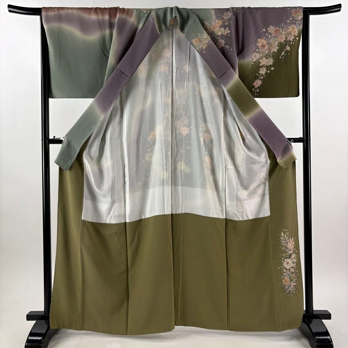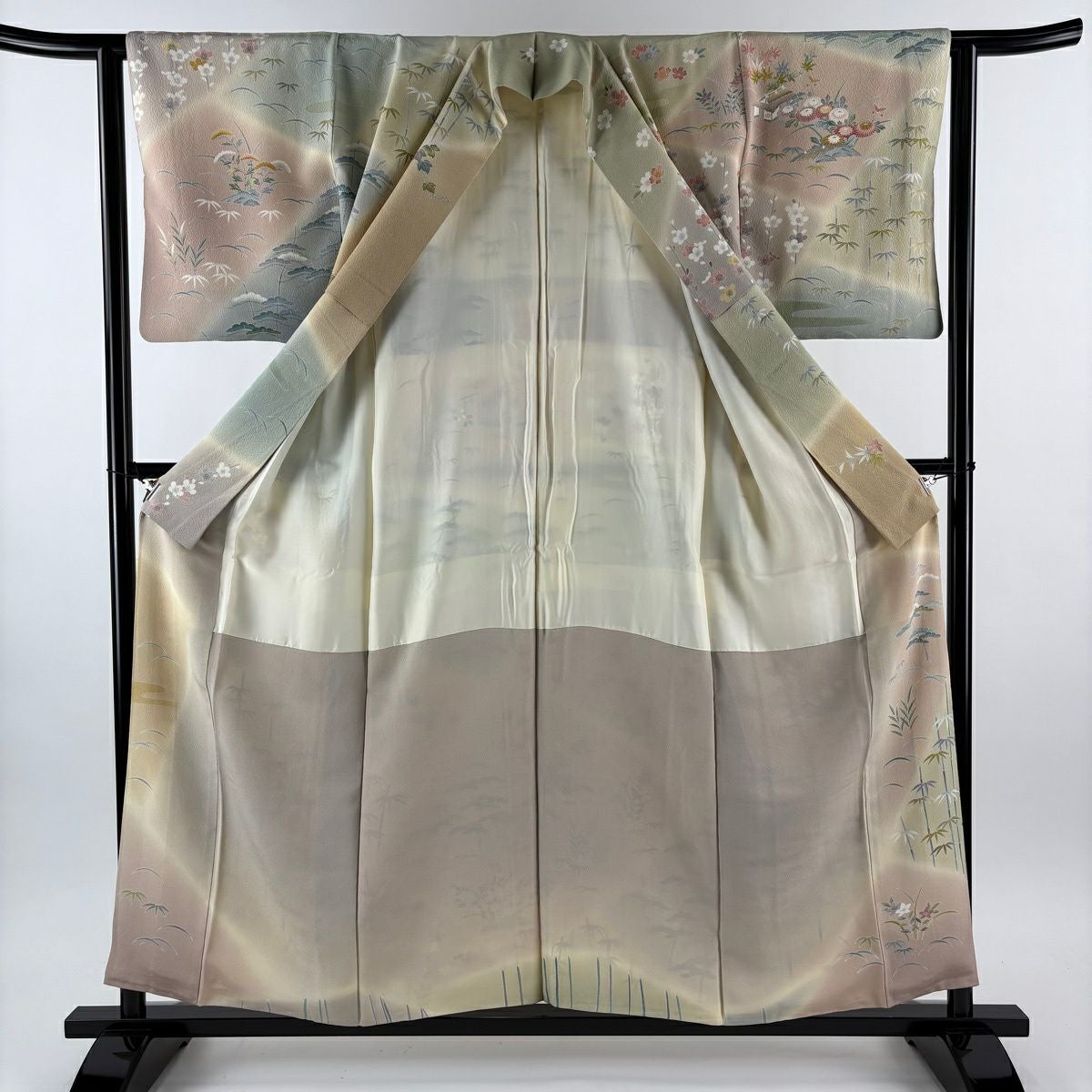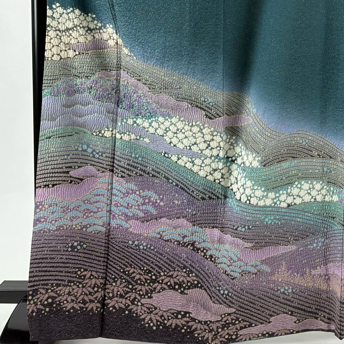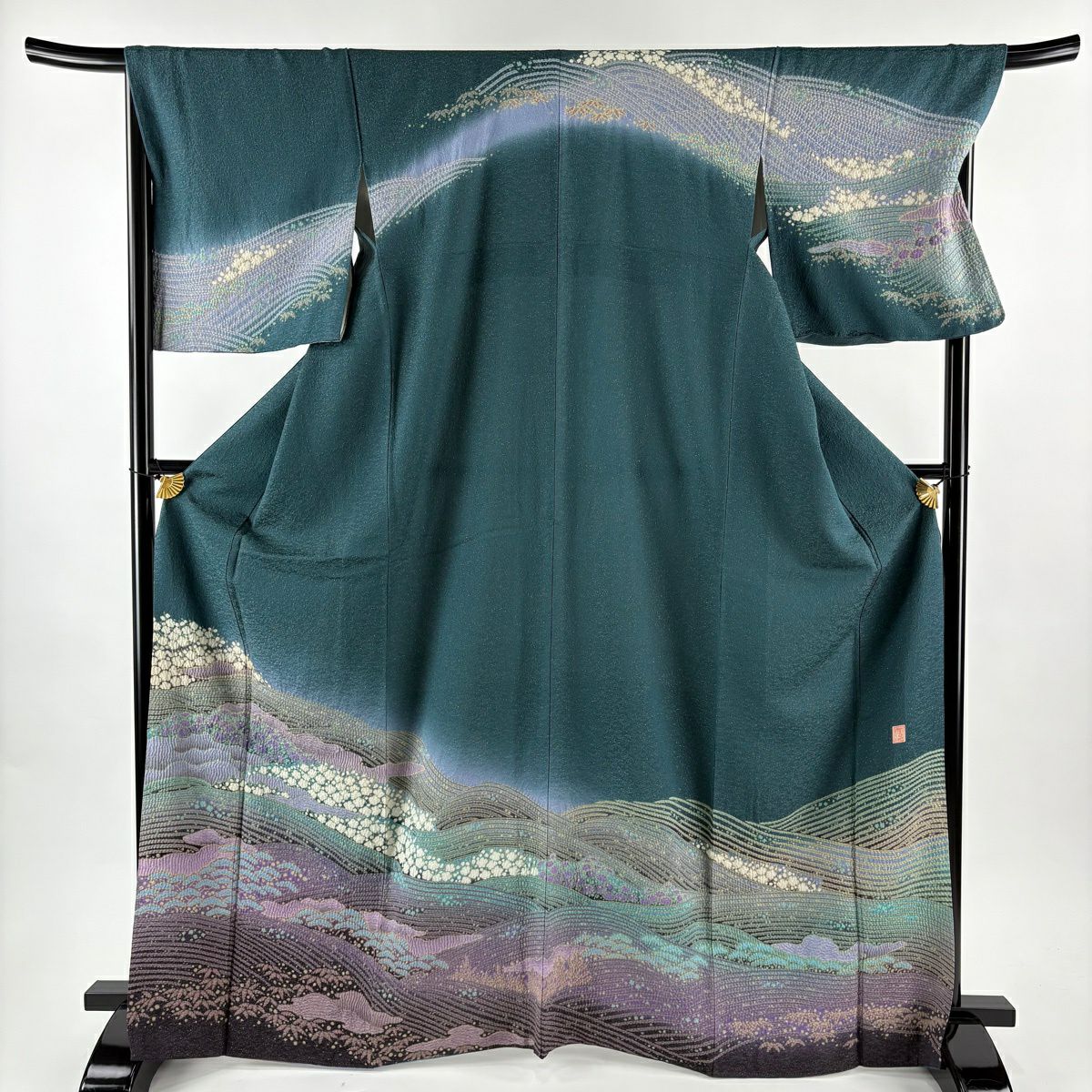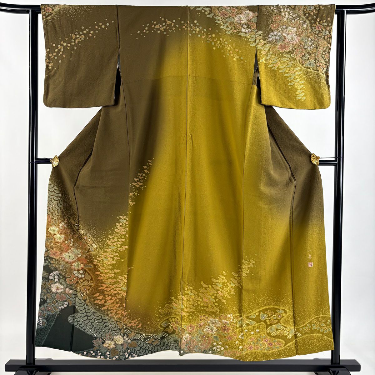 訪問着 身丈168.5cm 裄丈67.5cm L 袷 滝泰 落款あり 草花 波 金通し 染め分け 灰緑 正絹 逸品
