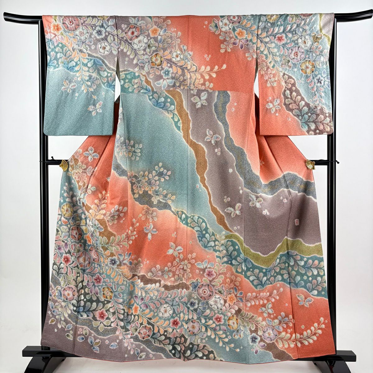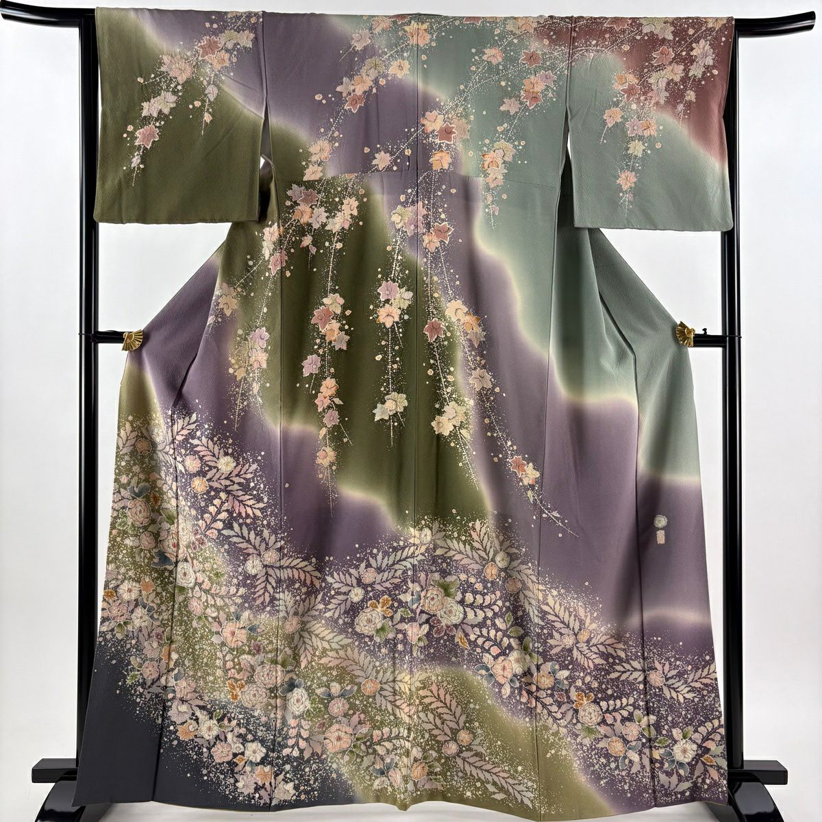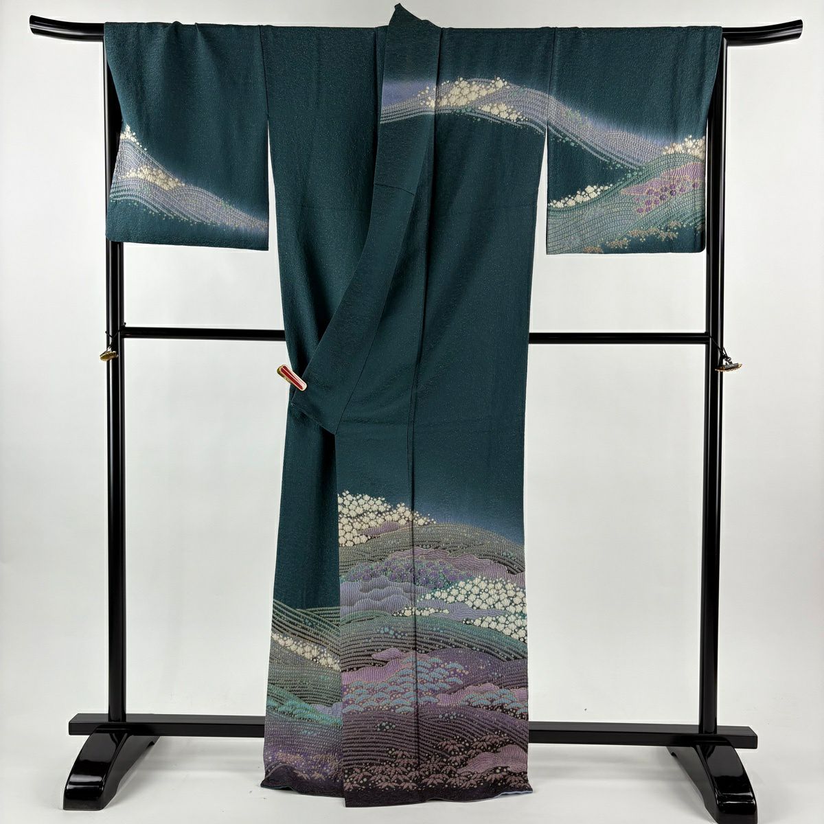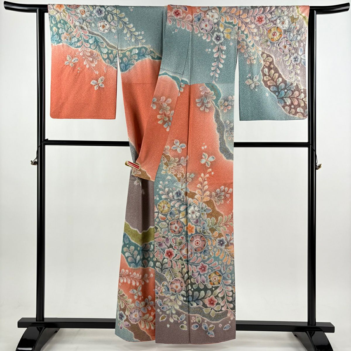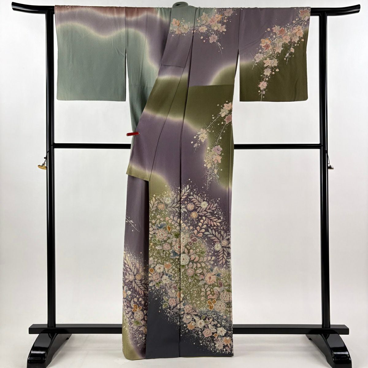 訪問着 身丈168.5cm 裄丈67.5cm L 袷 滝泰 落款あり 草花 波 金通し 染め分け 灰緑 正絹 逸品