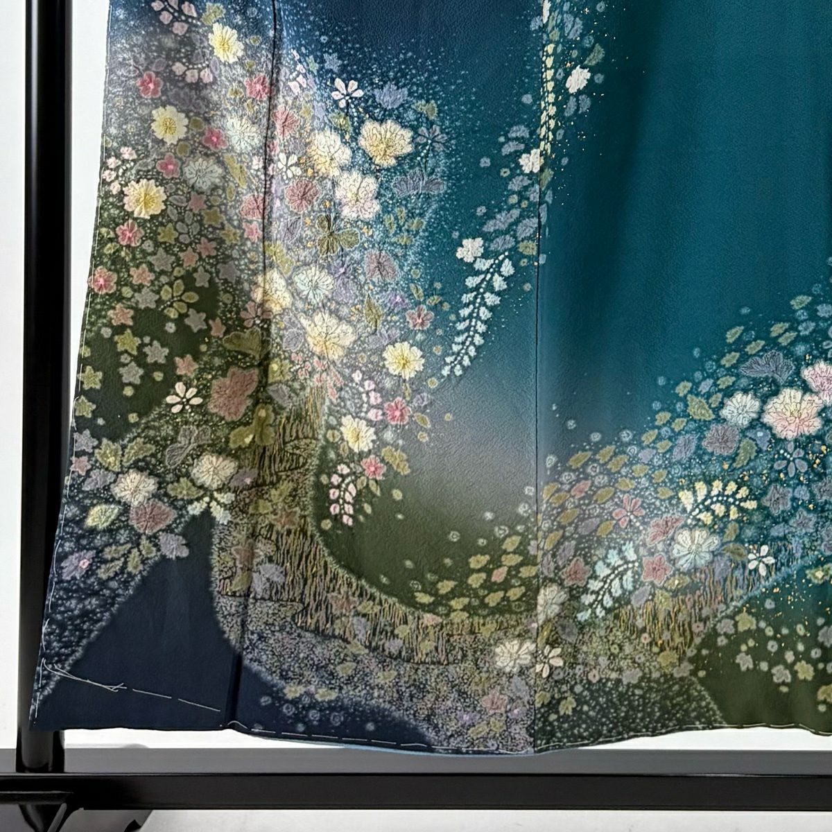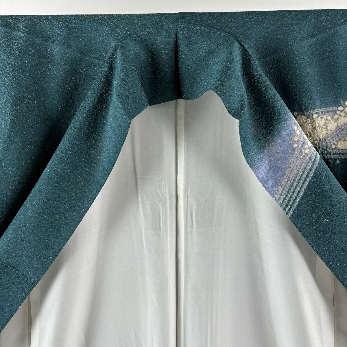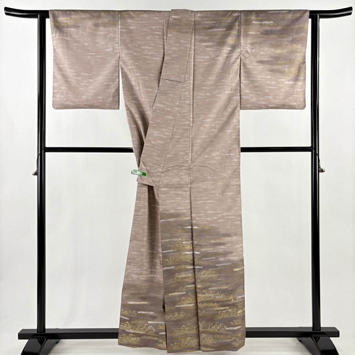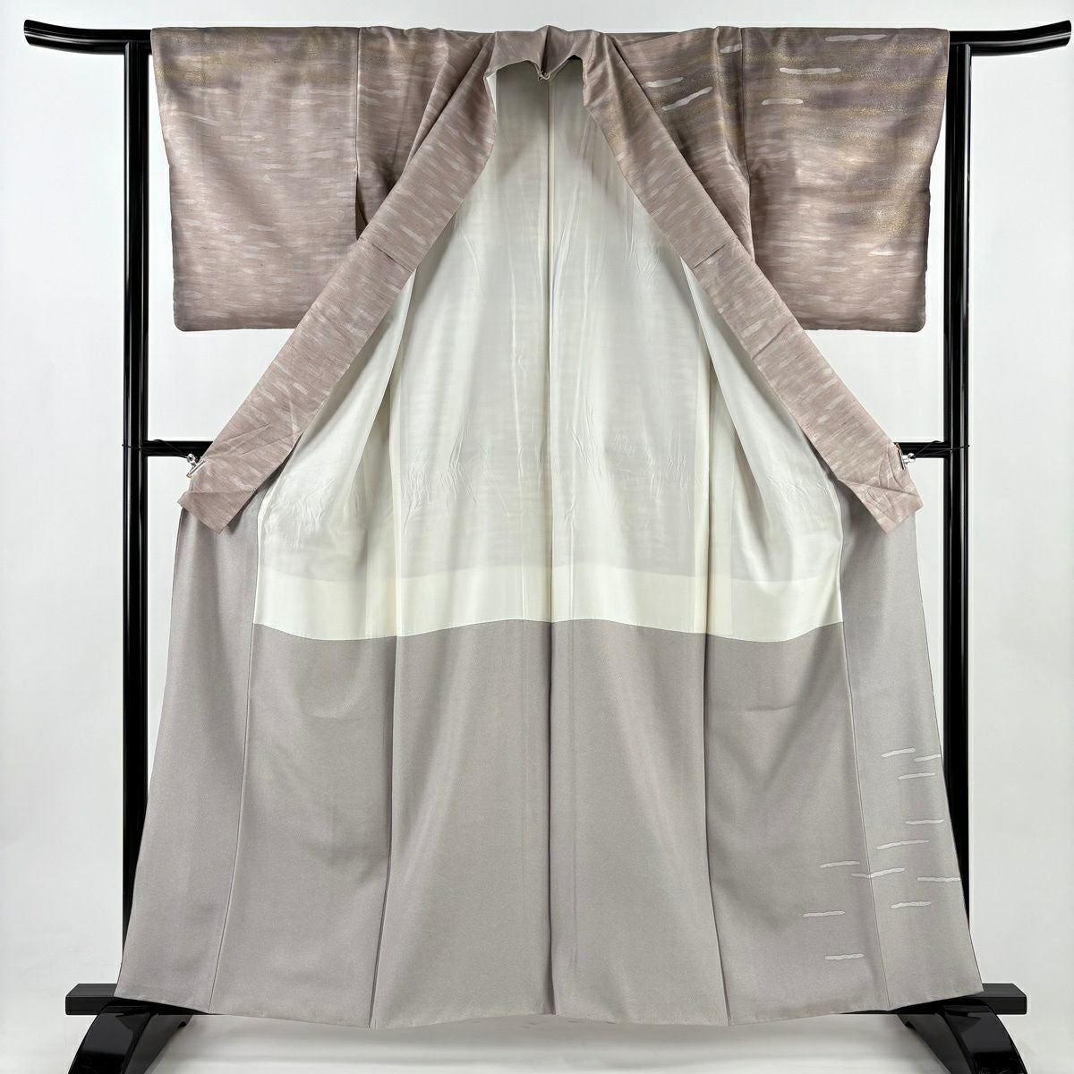 訪問着 身丈168.5cm 裄丈67.5cm L 袷 滝泰 落款あり 草花 波 金通し 染め分け 灰緑 正絹 逸品