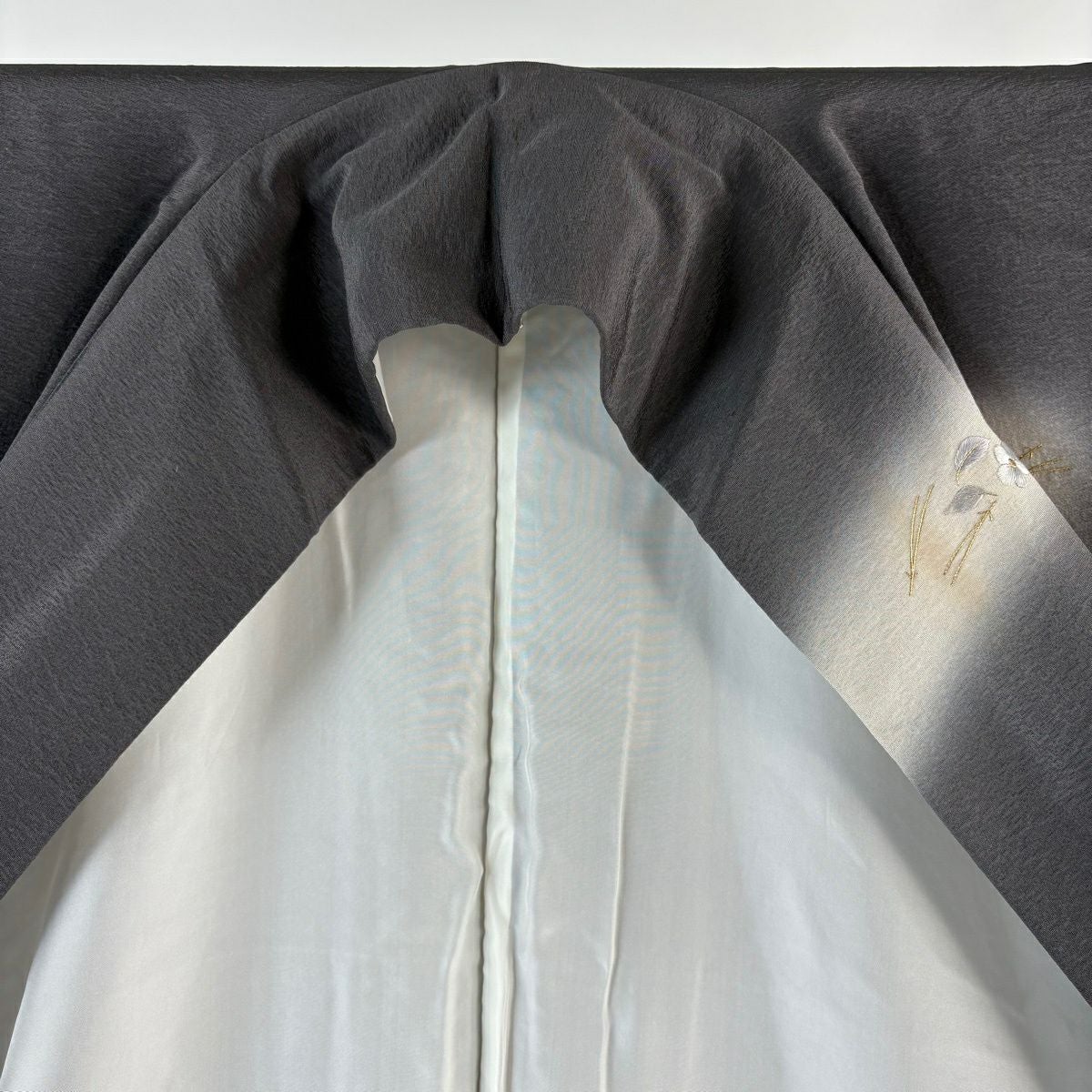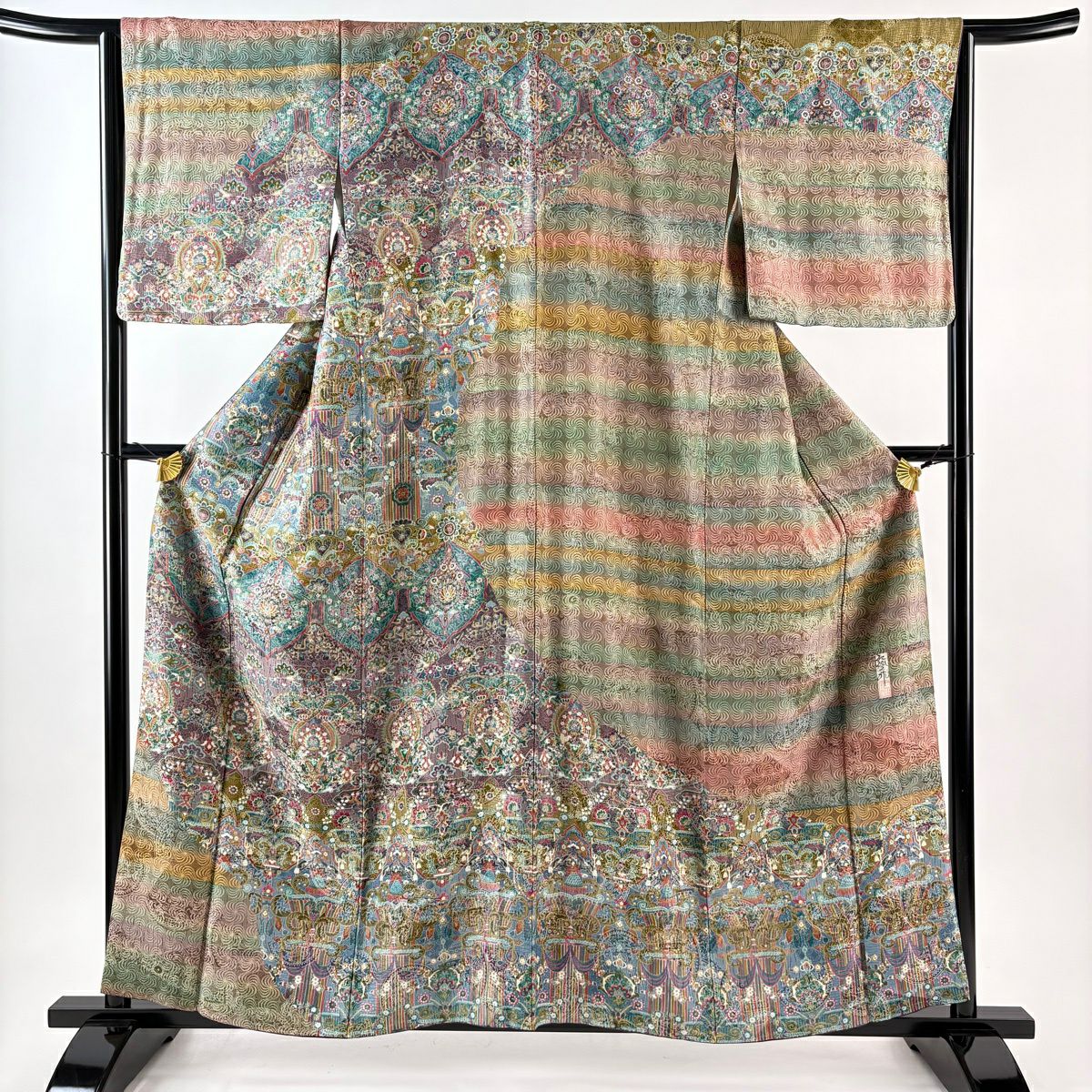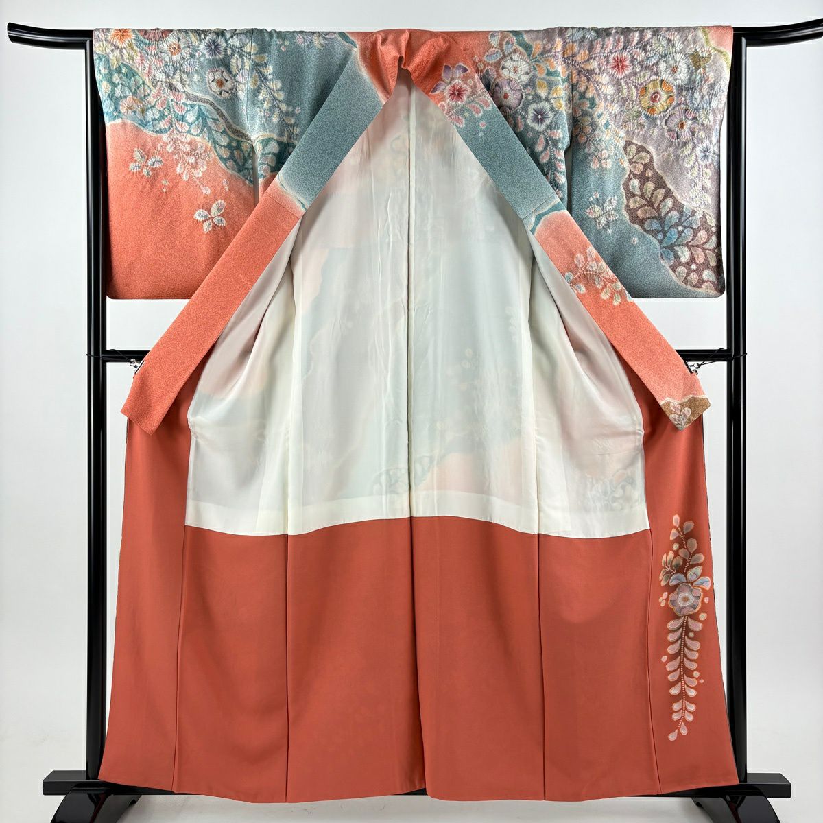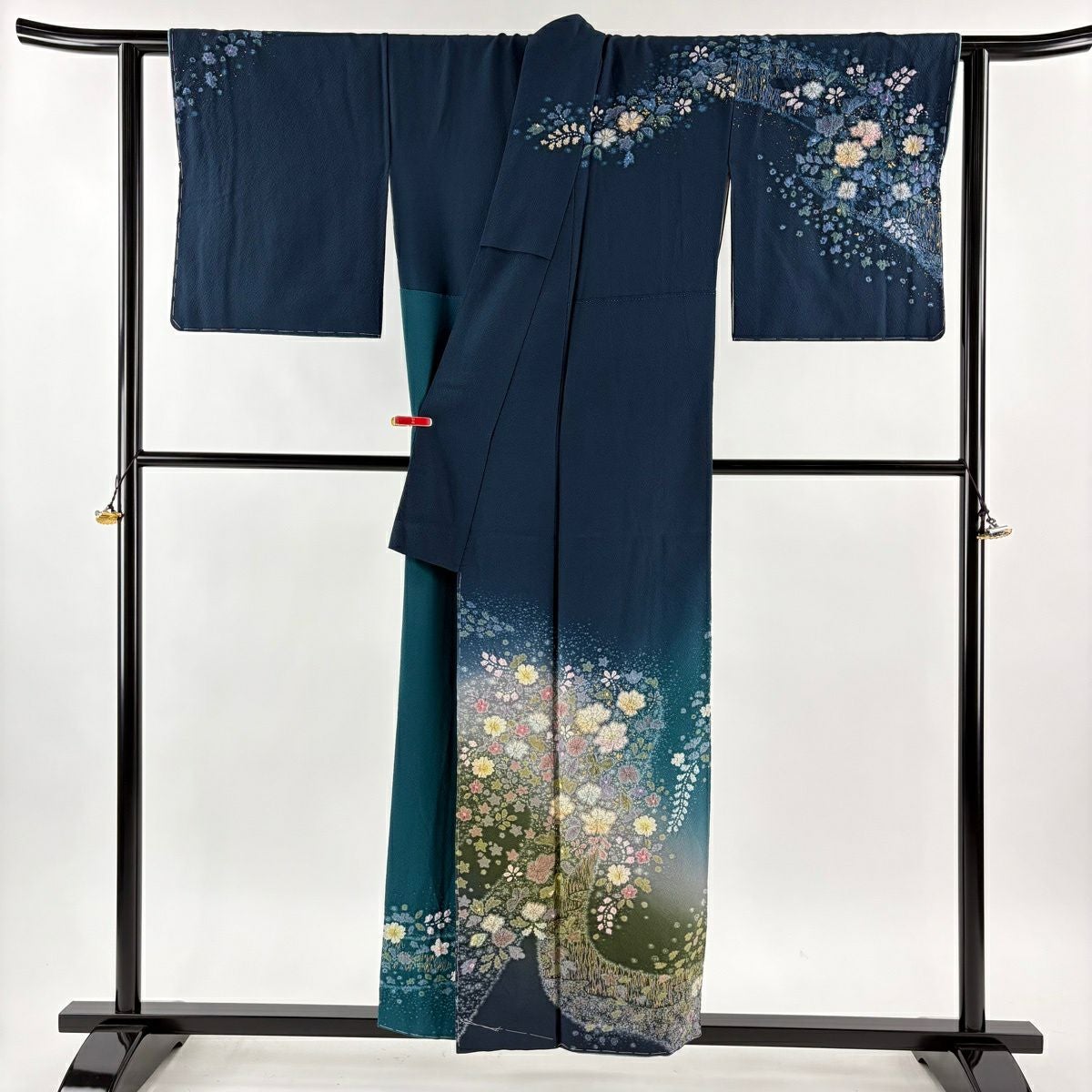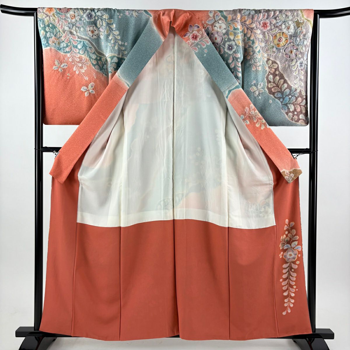 訪問着 身丈168.5cm 裄丈67.5cm L 袷 滝泰 落款あり 草花 波 金通し 染め分け 灰緑 正絹 逸品