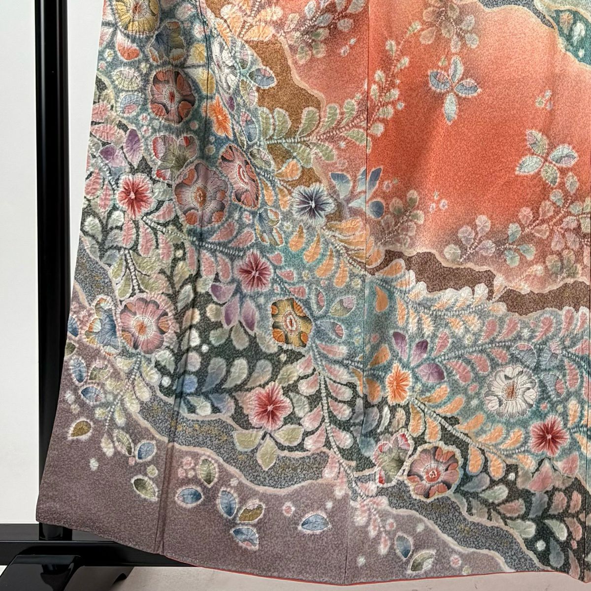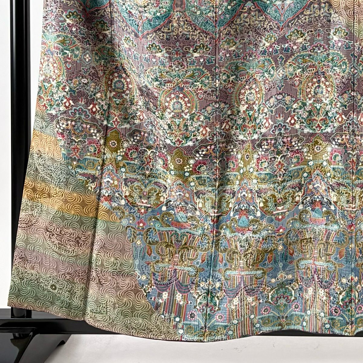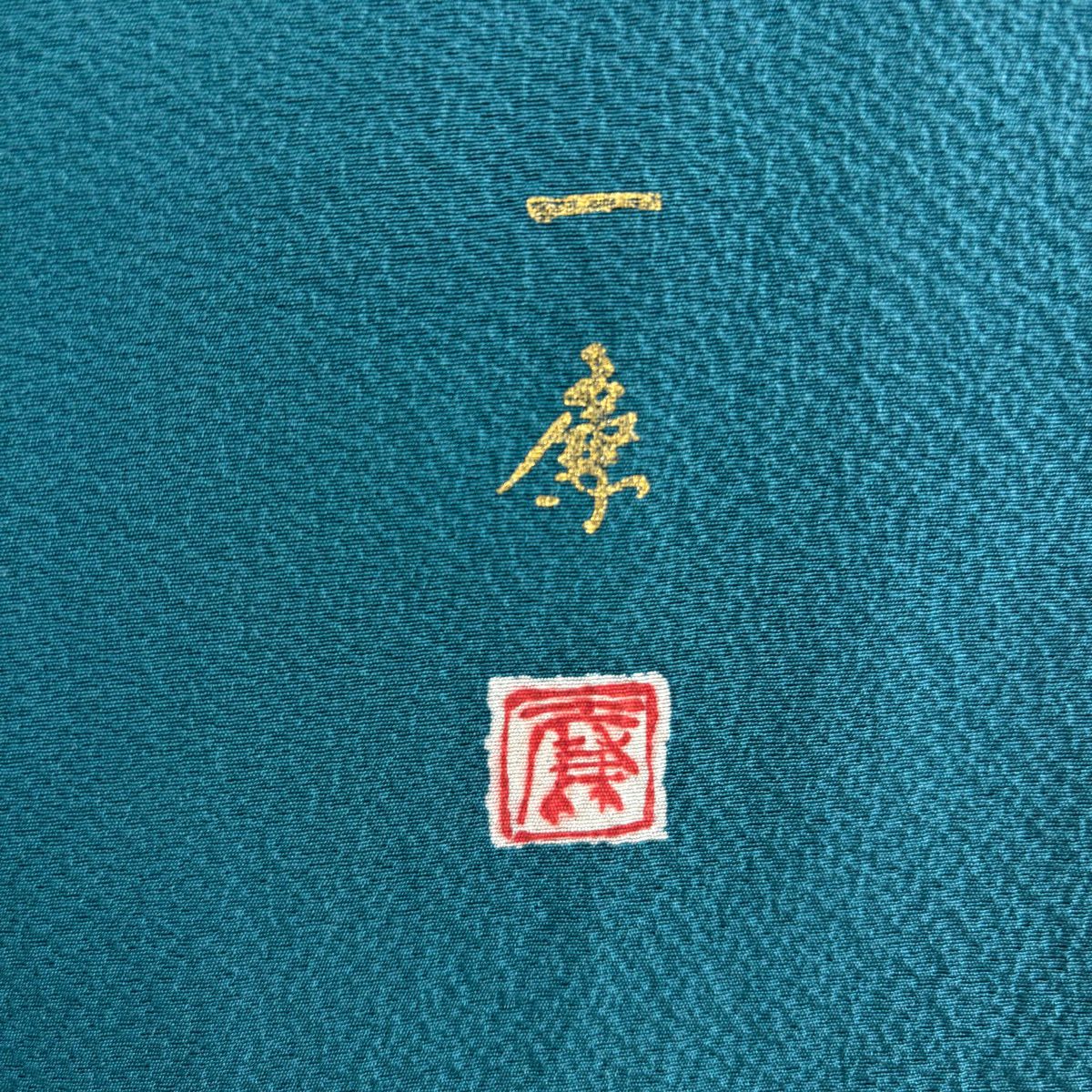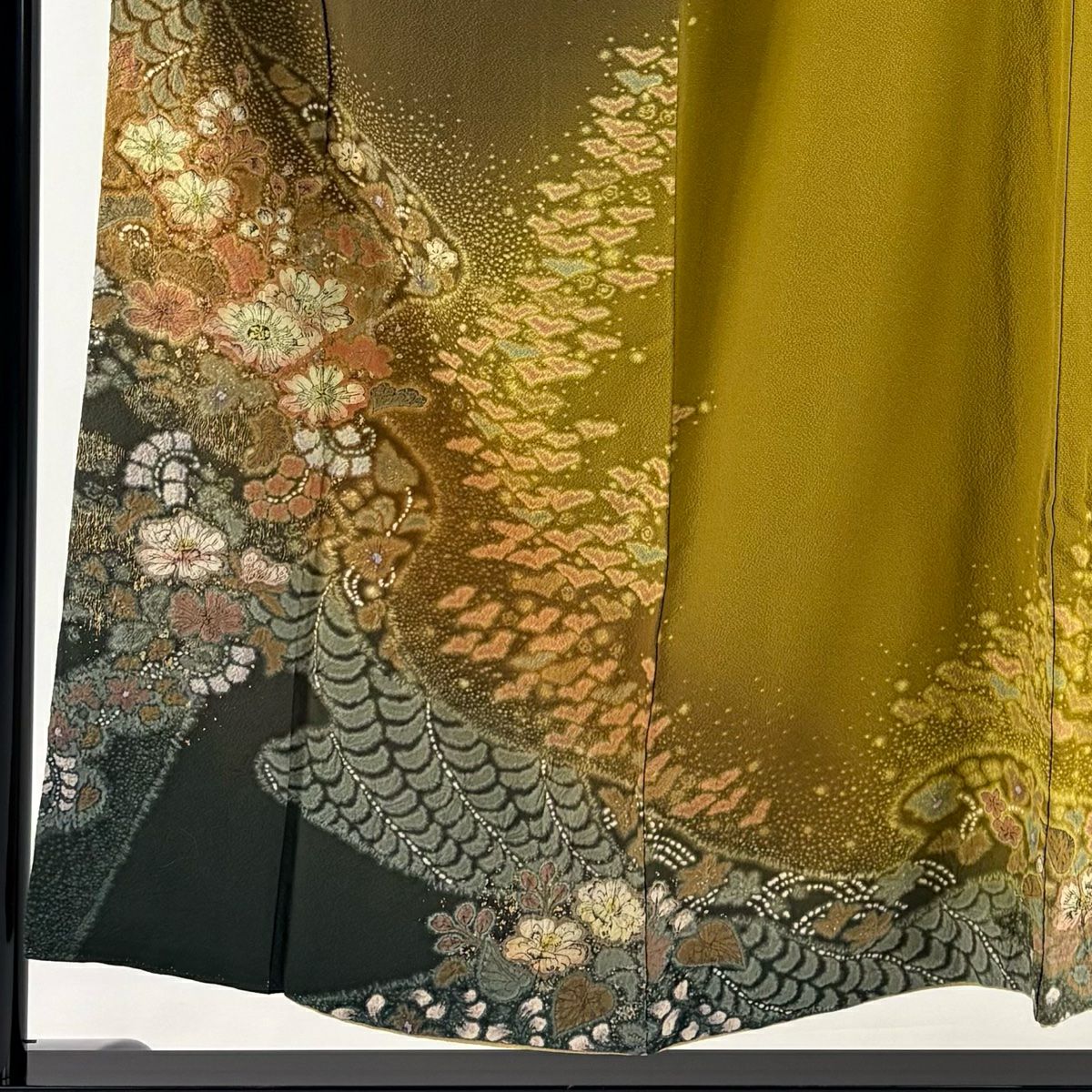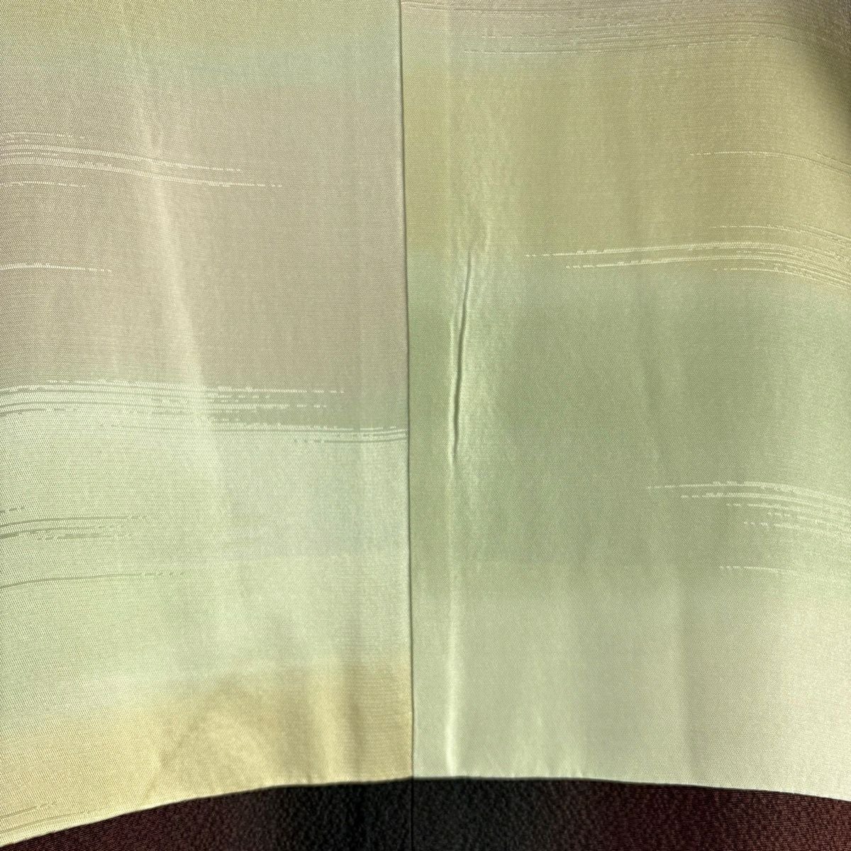 訪問着 身丈168.5cm 裄丈67.5cm L 袷 滝泰 落款あり 草花 波 金通し 染め分け 灰緑 正絹 逸品