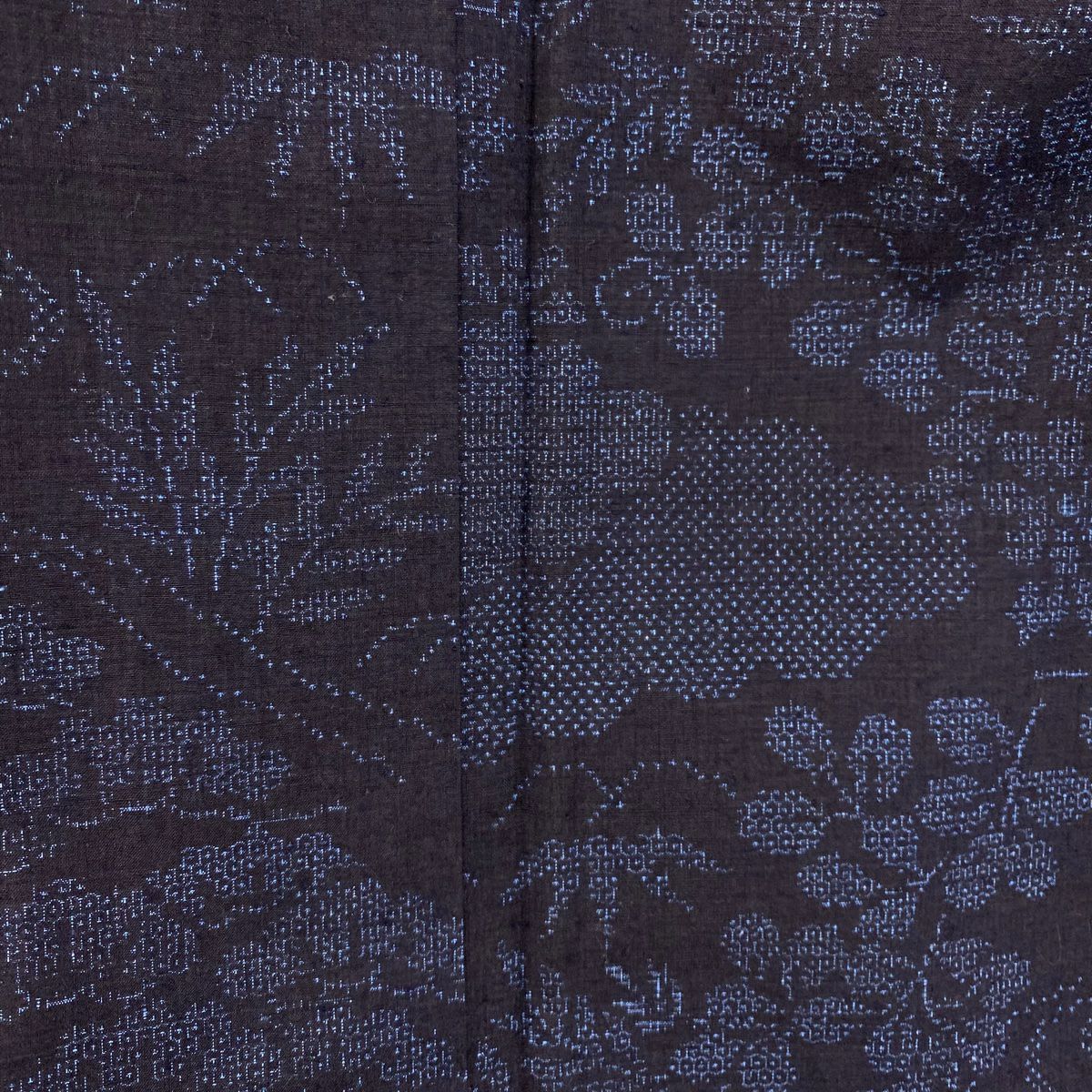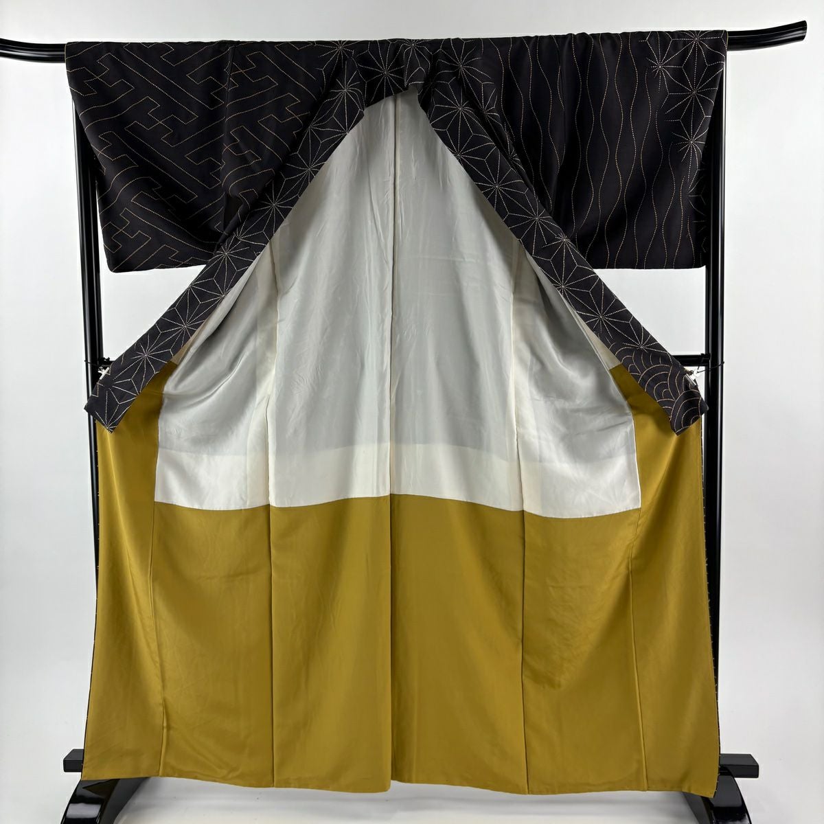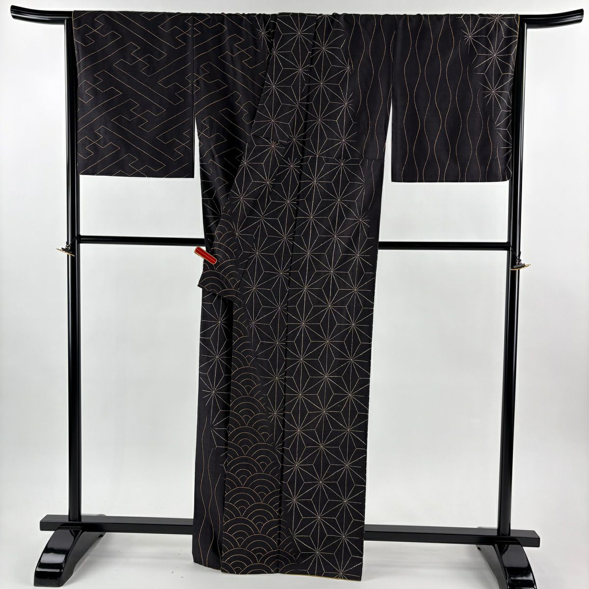 訪問着 身丈164.5cm 裄丈67cm M 袷 紬地 落款あり 麻の葉 青海波 刺し子刺繍 濃紫 正絹 逸品