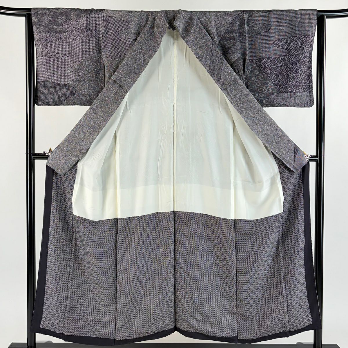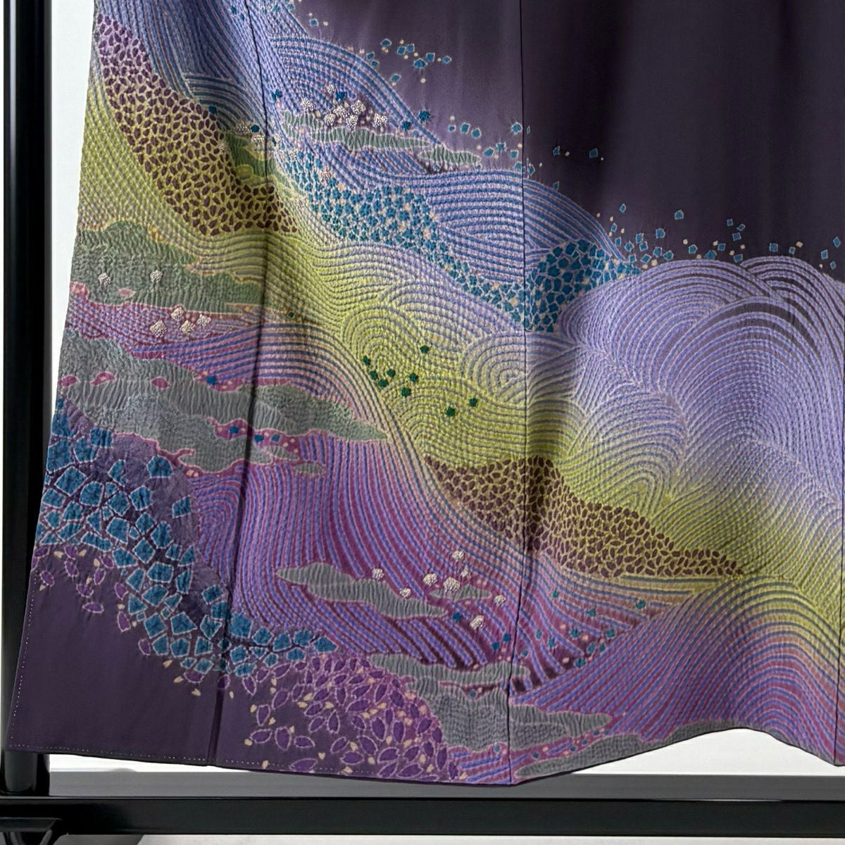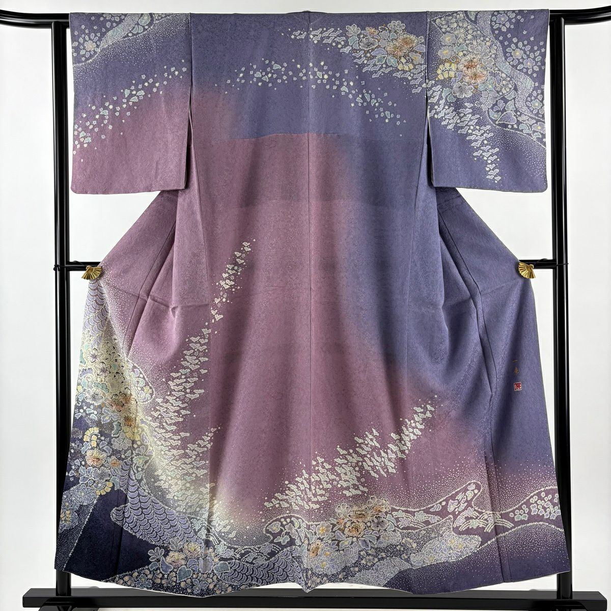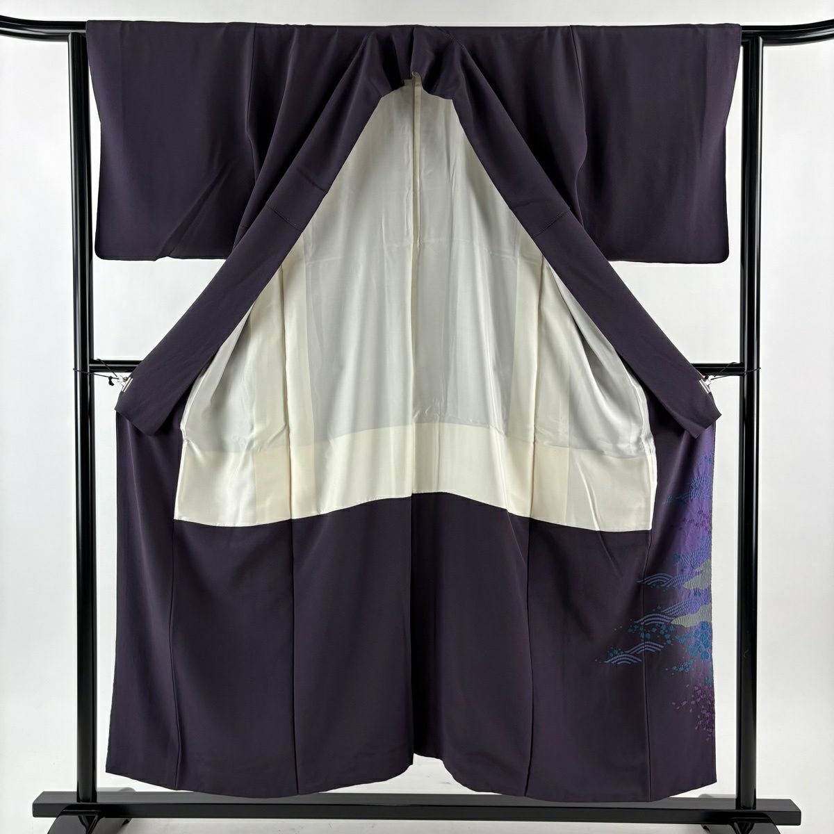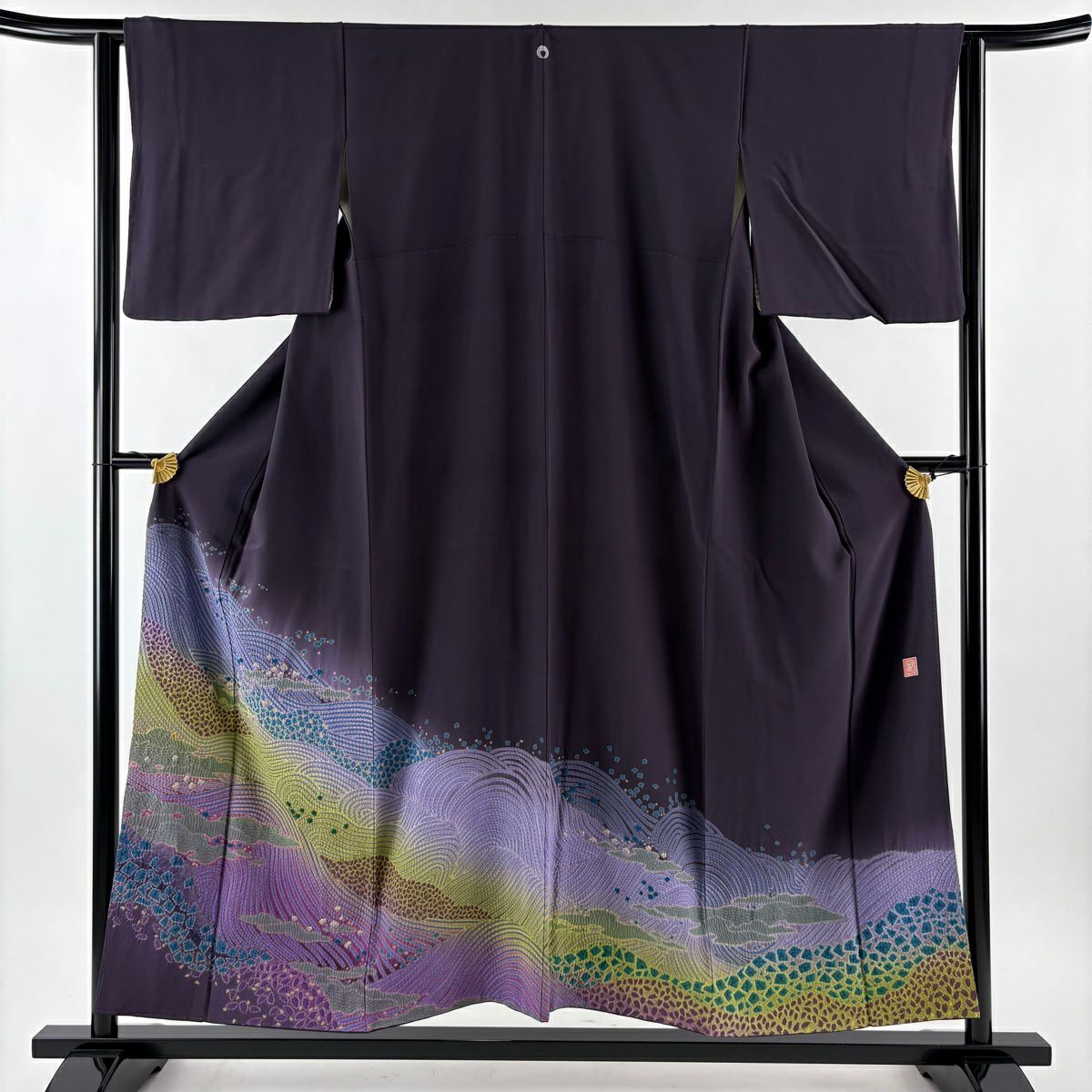 付下げ 身丈161.5cm 裄丈65cm M 袷 人間国宝 中村勇二郎 落款あり 流水 寄せ柄 濃紫 正絹 逸品