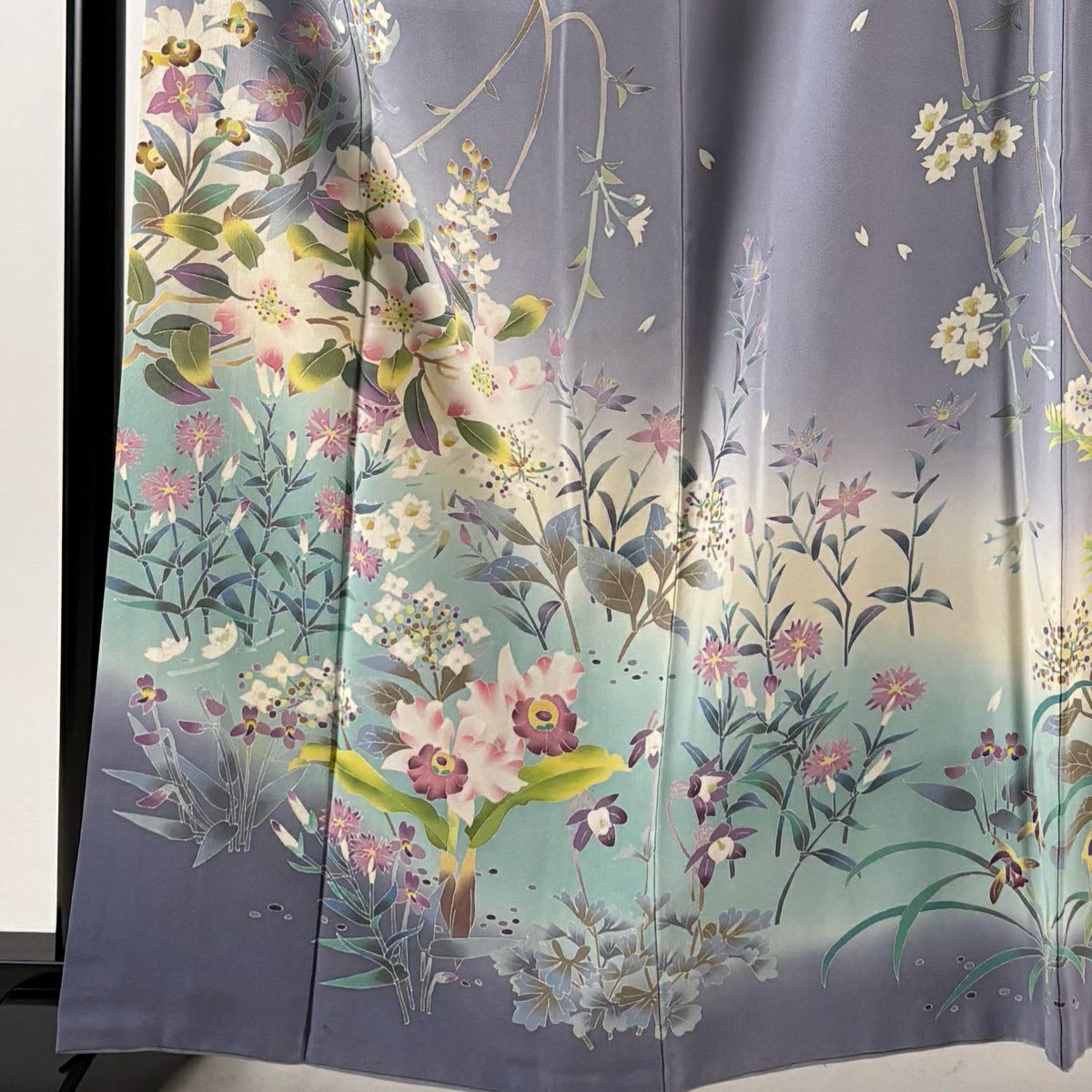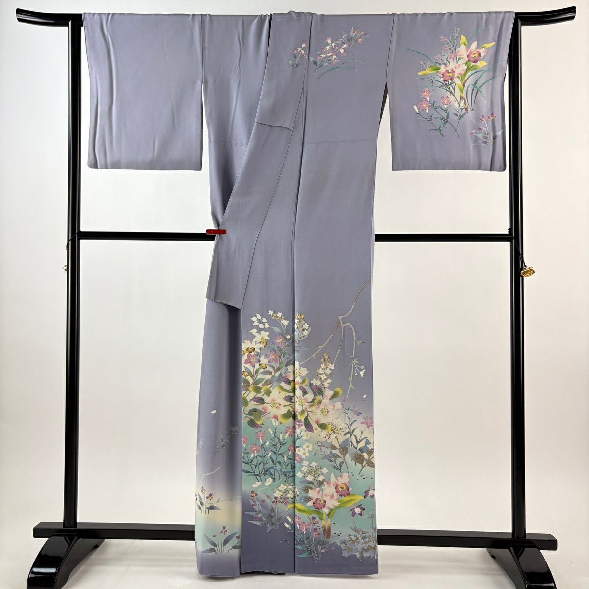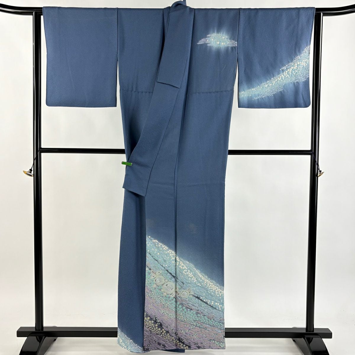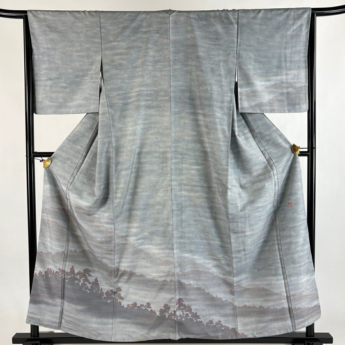 訪問着 身丈159cm 裄丈64.5cm M 袷 滝泰 落款あり 草花 霞 銀通し ぼかし 青灰色 正絹 逸品