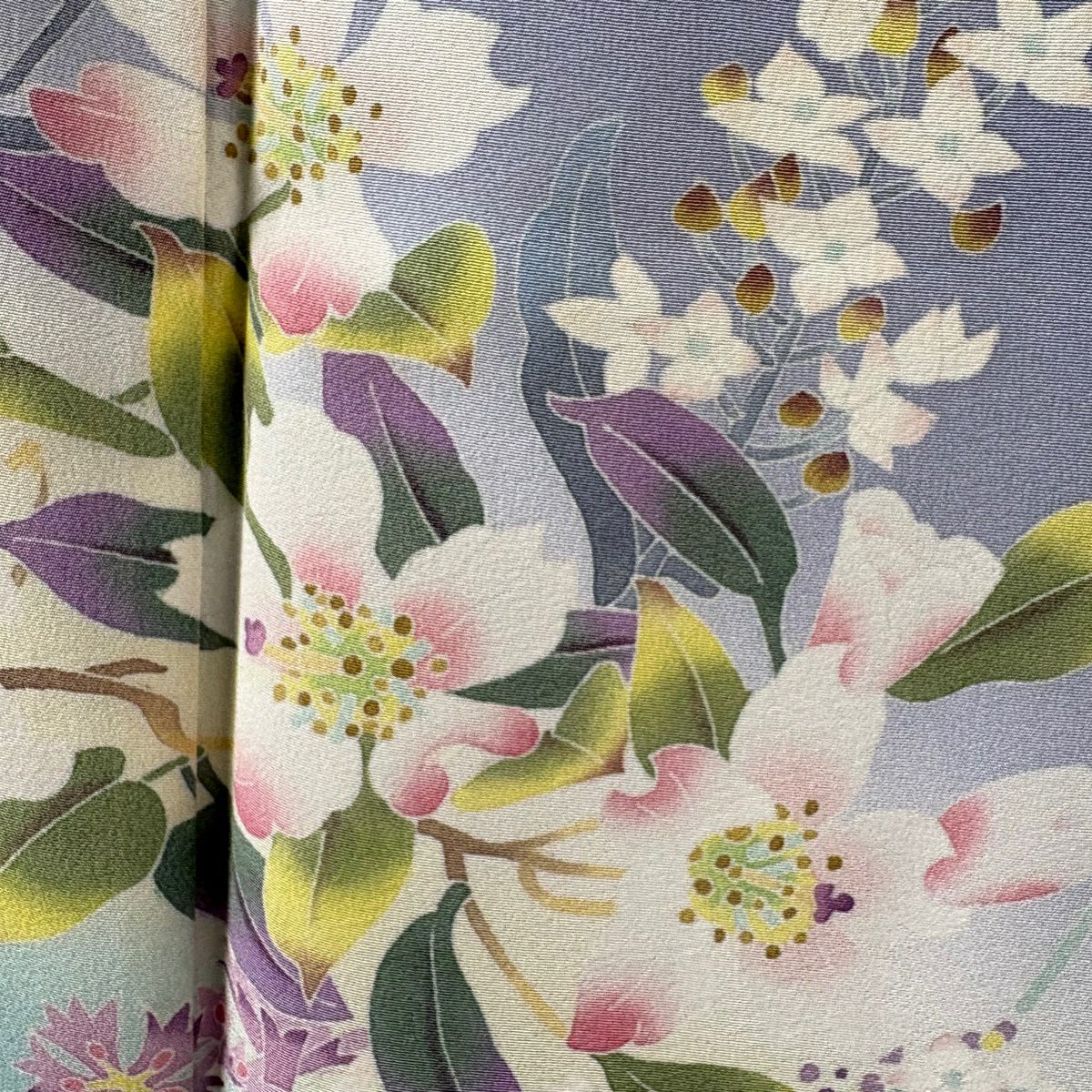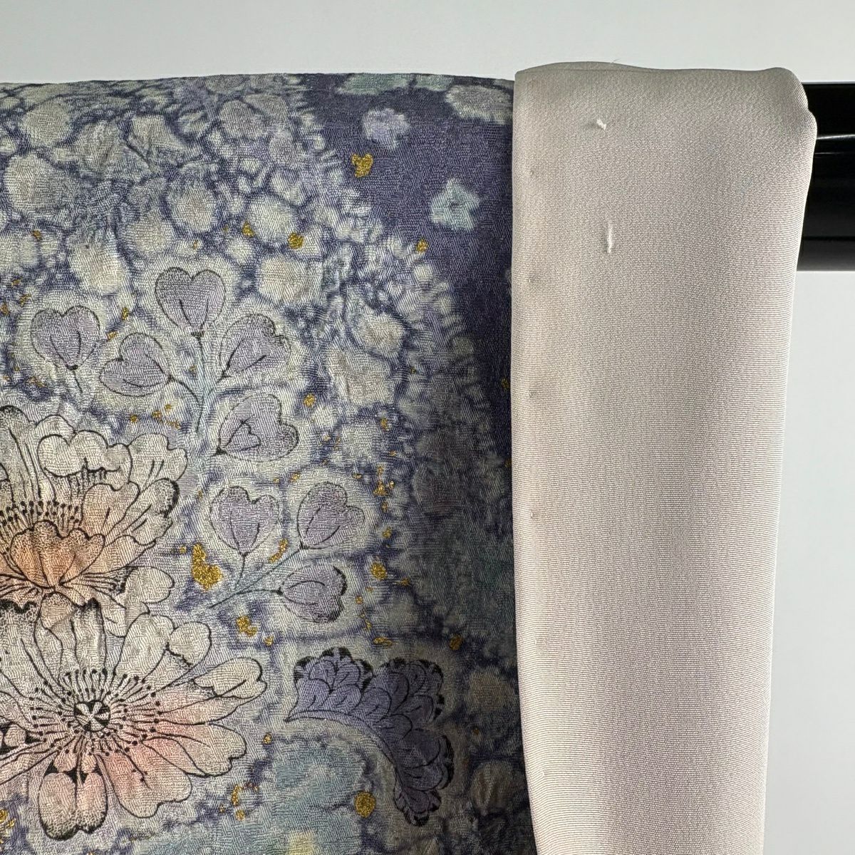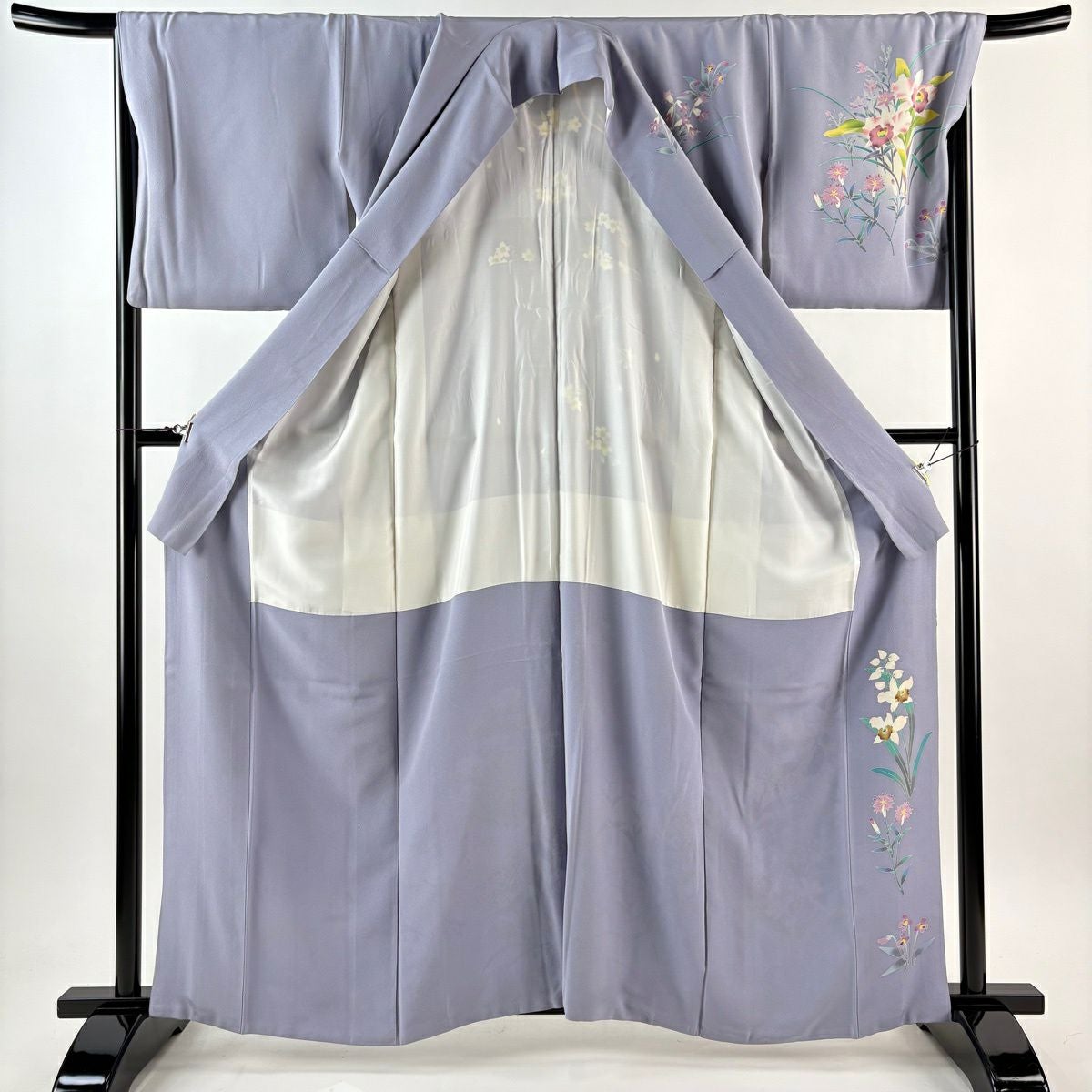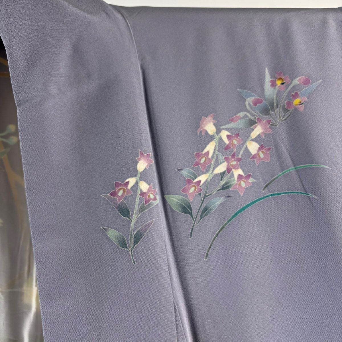 訪問着 身丈159cm 裄丈64.5cm M 袷 滝泰 落款あり 草花 霞 銀通し ぼかし 青灰色 正絹 逸品