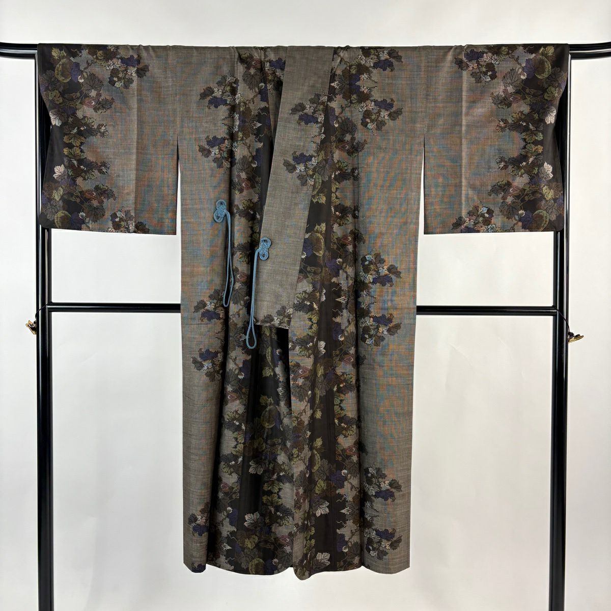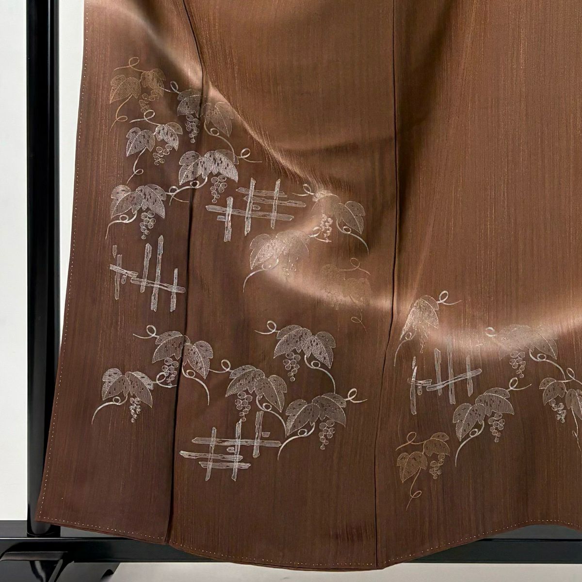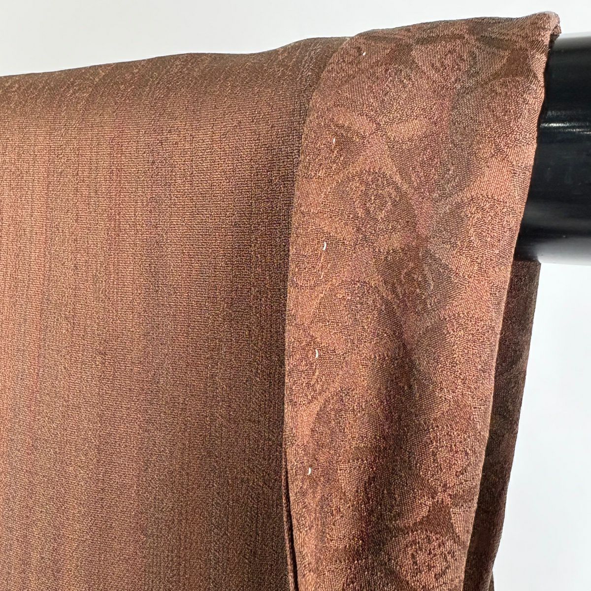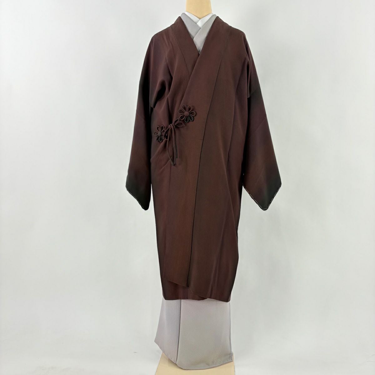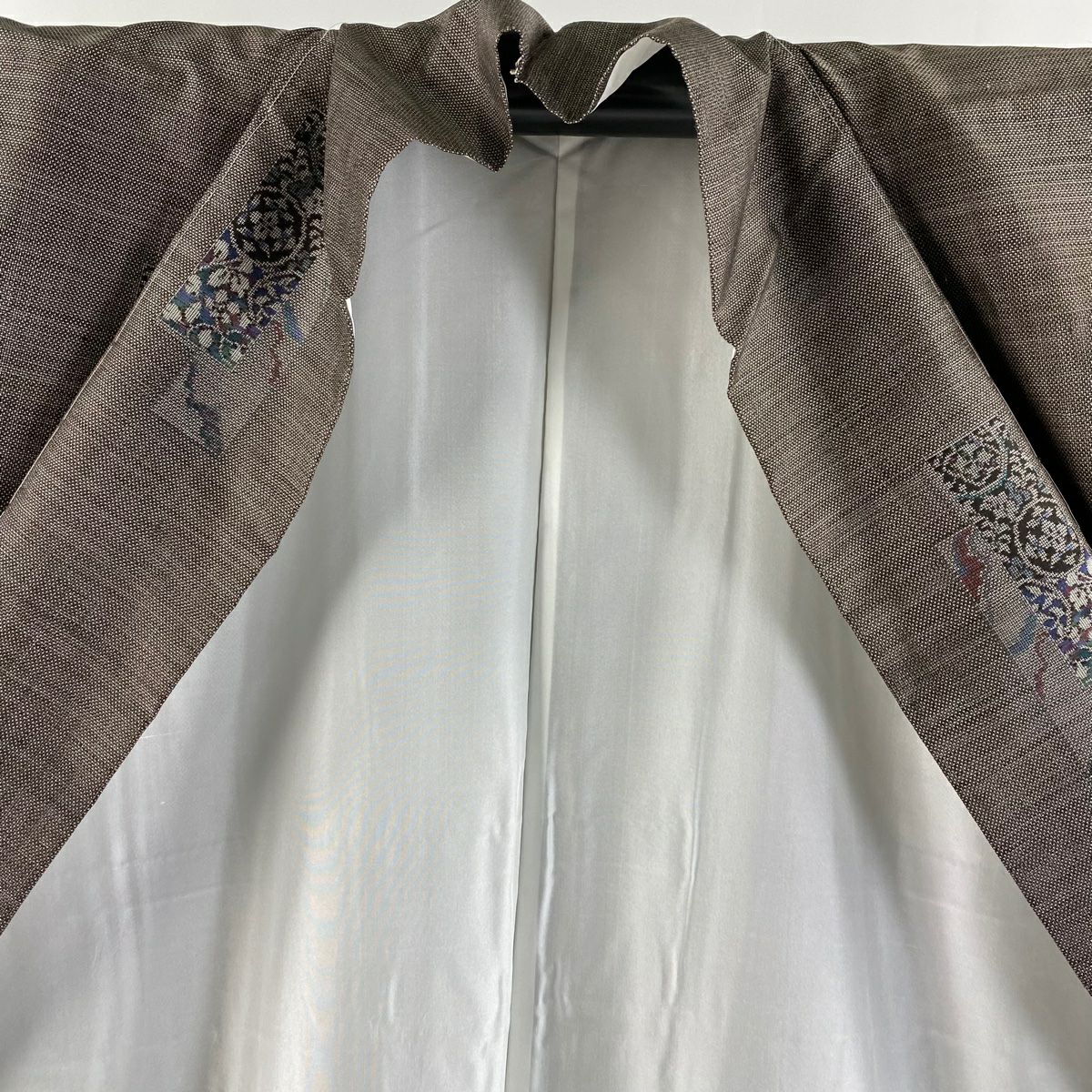 【美品】 道中着 身丈133cm 裄丈68cm L 和装コート 着物衿 紬地 生り物 葉柄 焦茶色 正絹 逸品