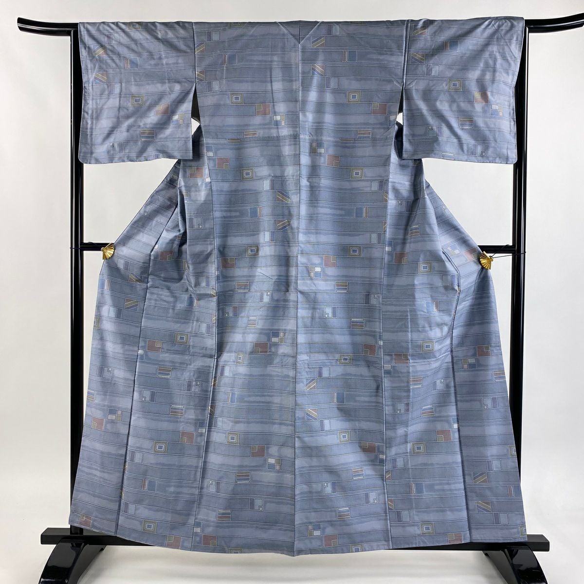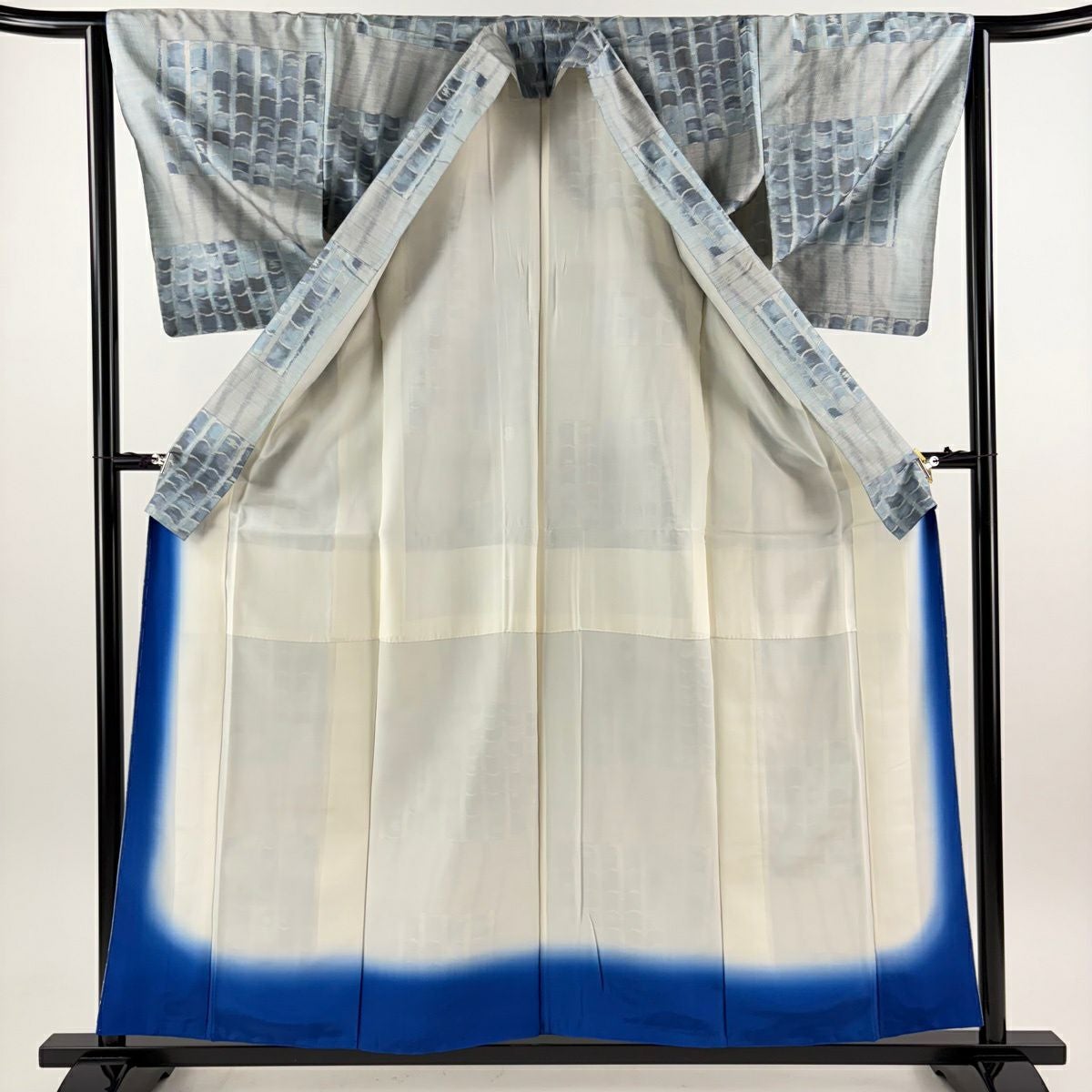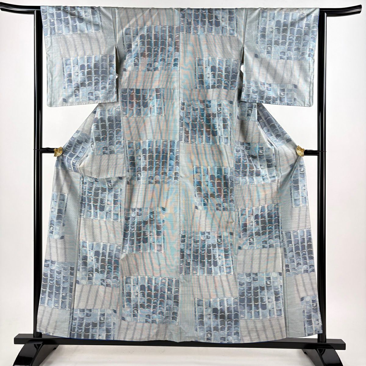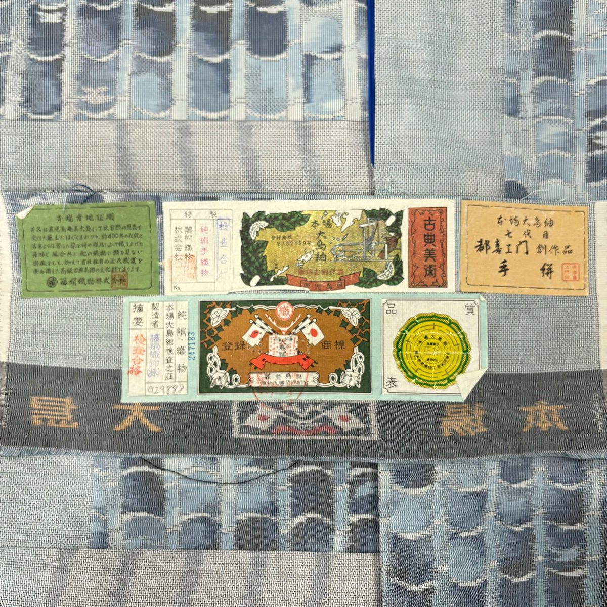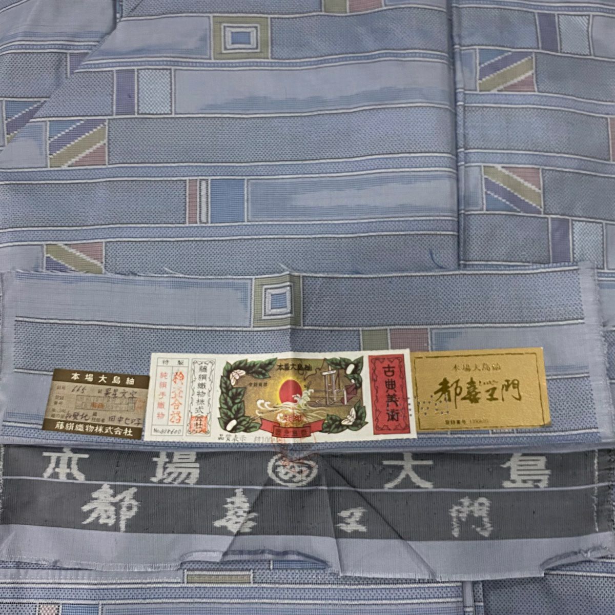 【在庫一掃】 大島紬 身丈160cm 裄丈64cm M 袷 都喜ヱ門 証紙あり 幾何学模様 青灰色 正絹 逸品