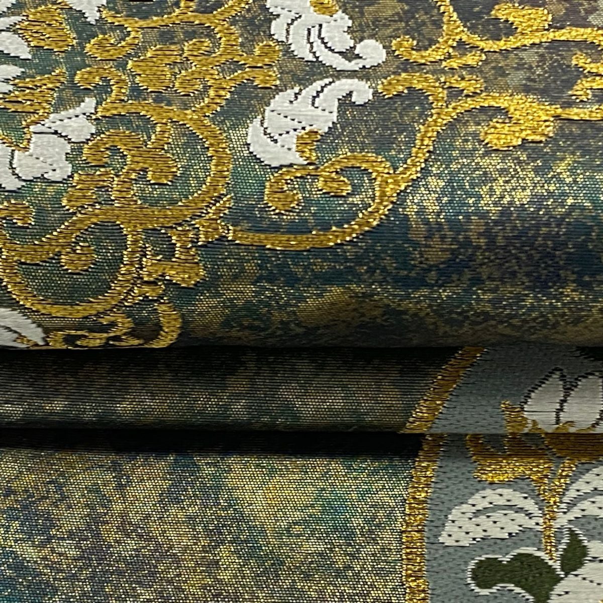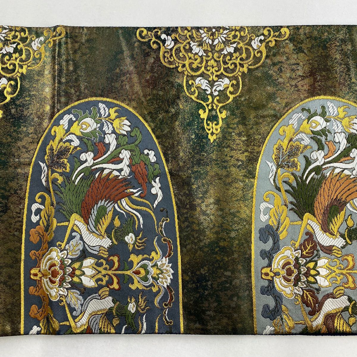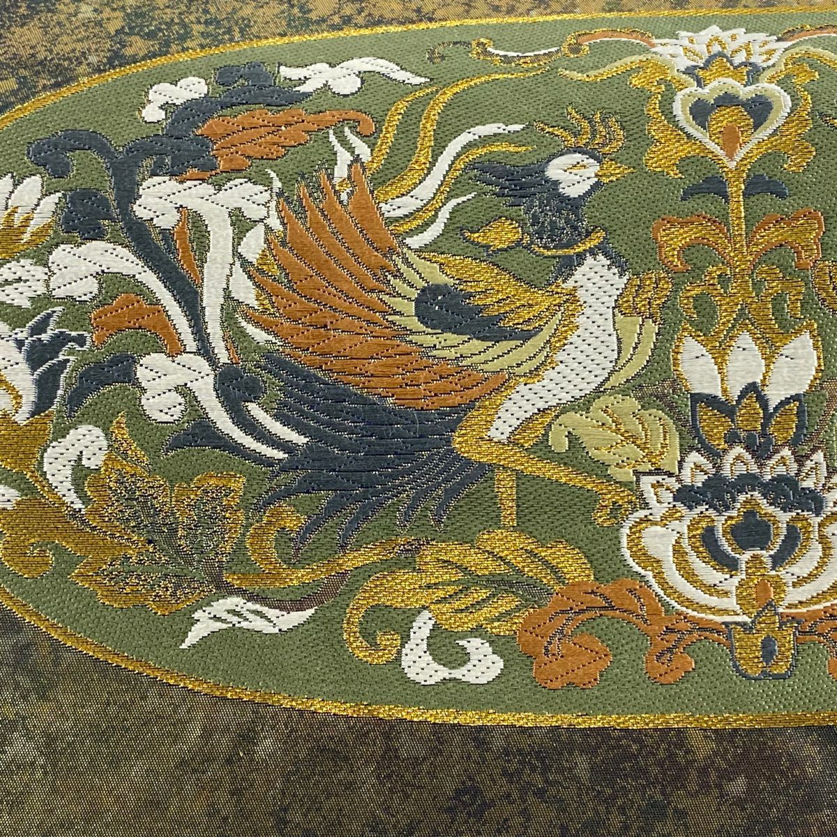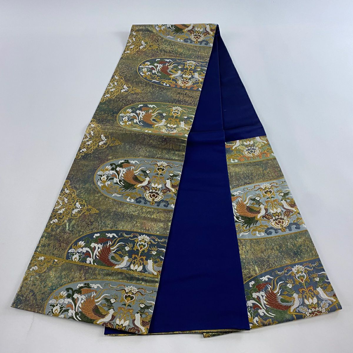 【在庫一掃】 【美品】 袋帯 逸品 となみ織物 落款あり 証紙あり 向かい鳥 草花 刺繍 金糸 灰緑 六通 正絹