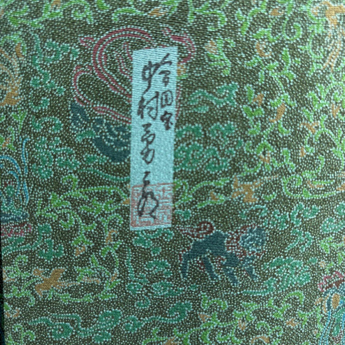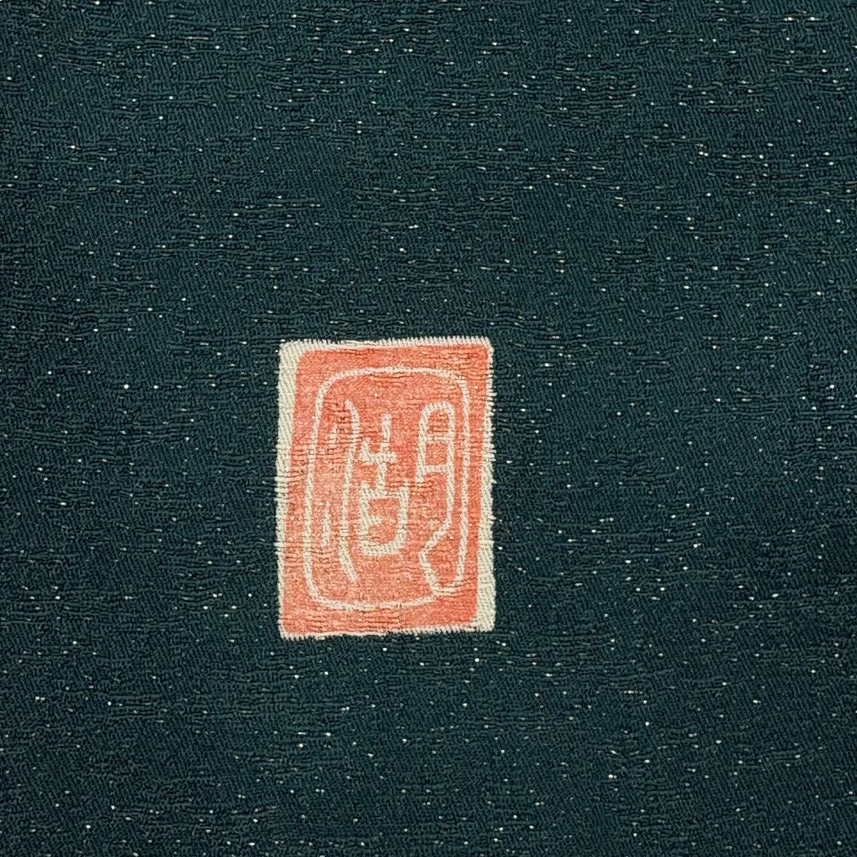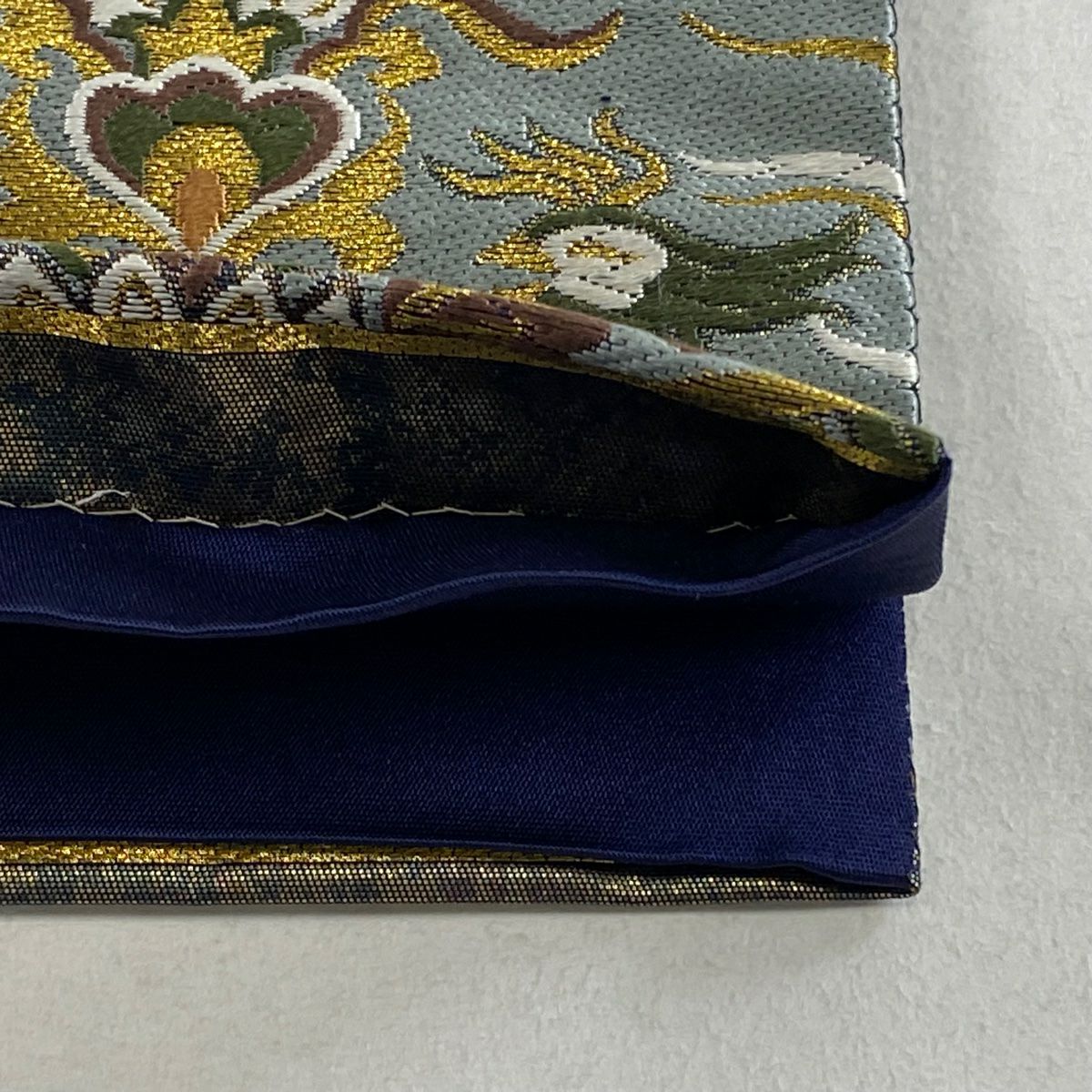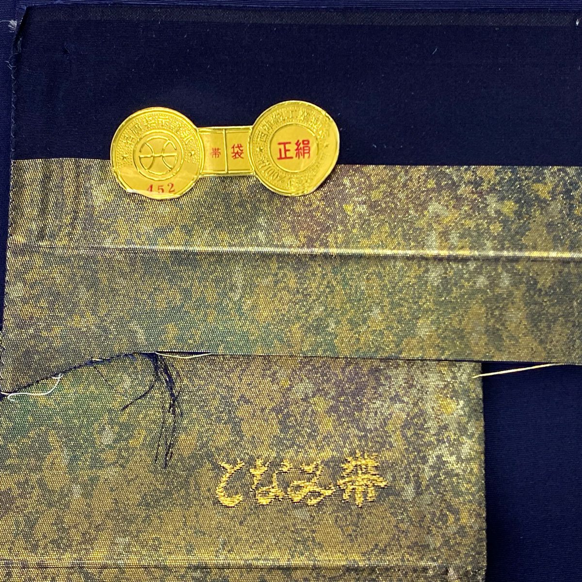 【在庫一掃】 【美品】 袋帯 逸品 となみ織物 落款あり 証紙あり 向かい鳥 草花 刺繍 金糸 灰緑 六通 正絹