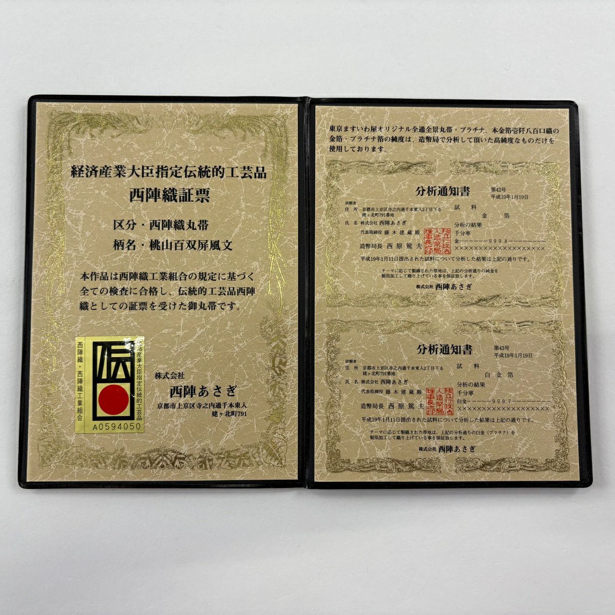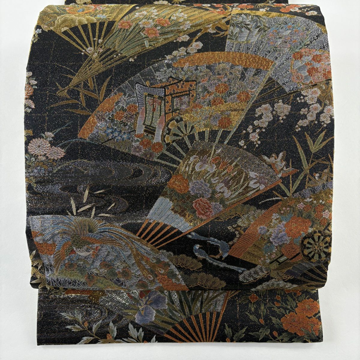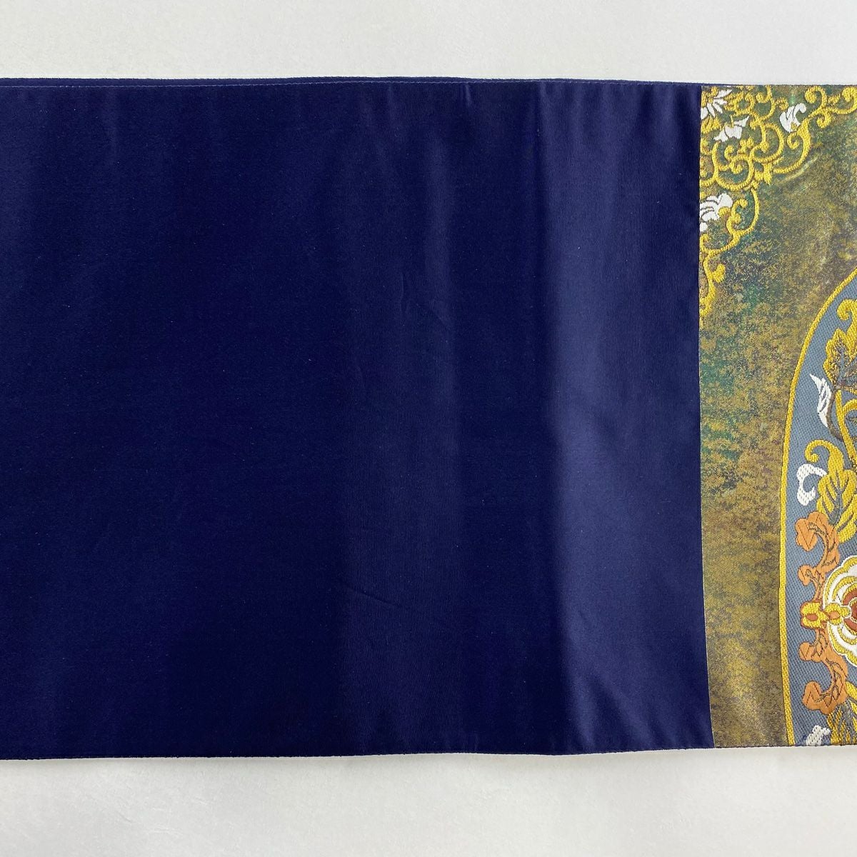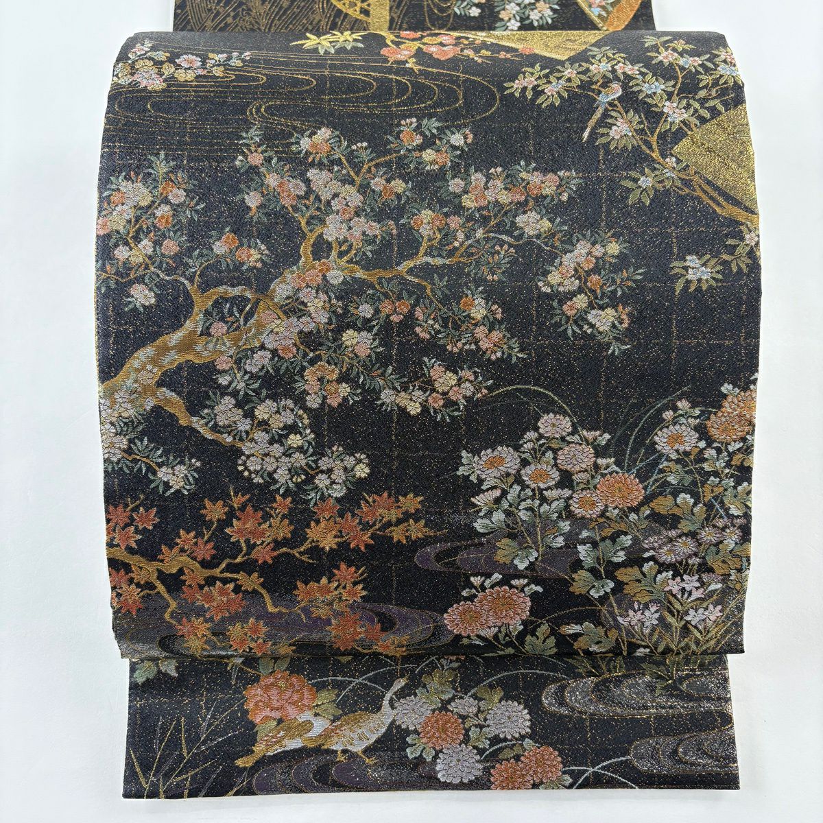 【在庫一掃】 【美品】 袋帯 逸品 となみ織物 落款あり 証紙あり 向かい鳥 草花 刺繍 金糸 灰緑 六通 正絹
