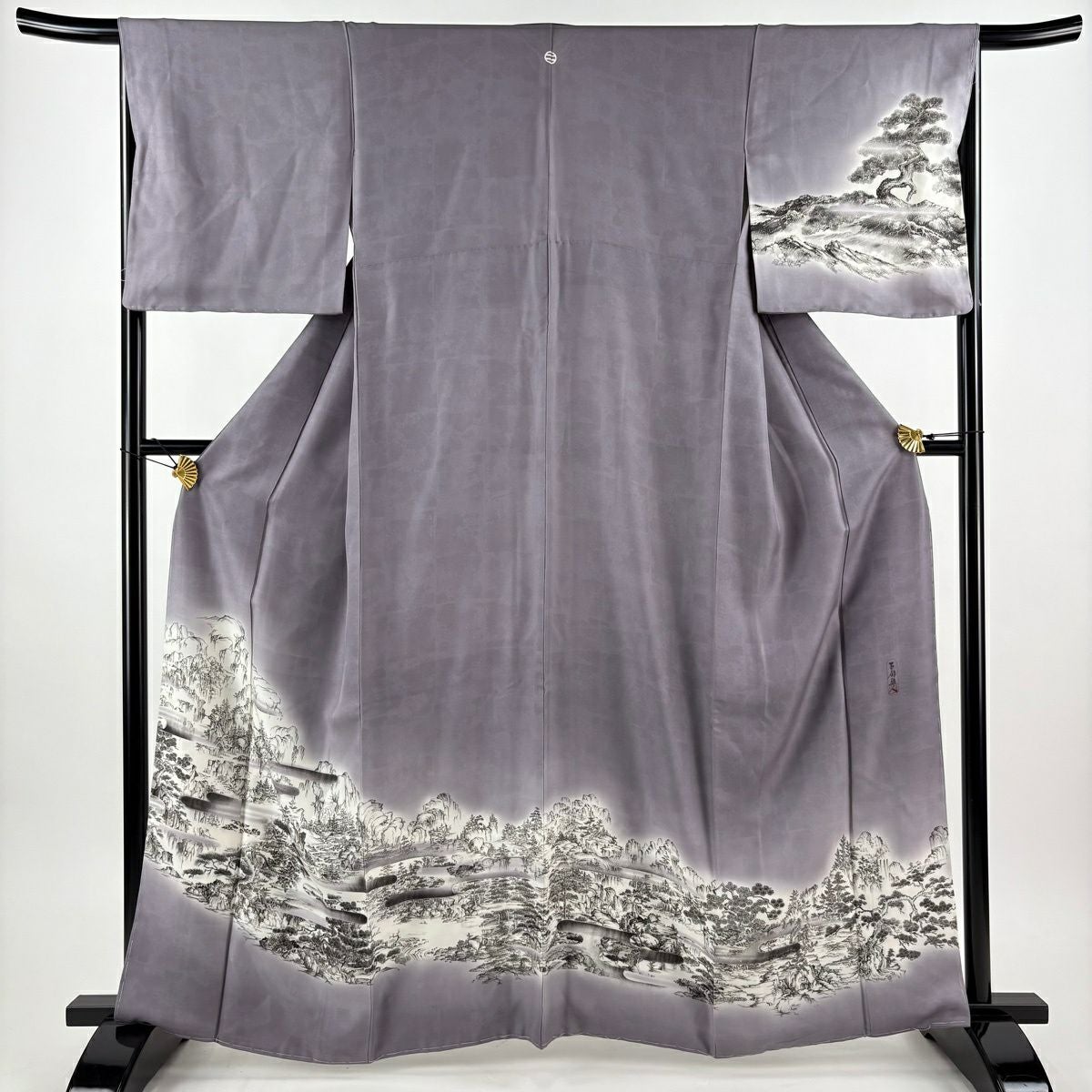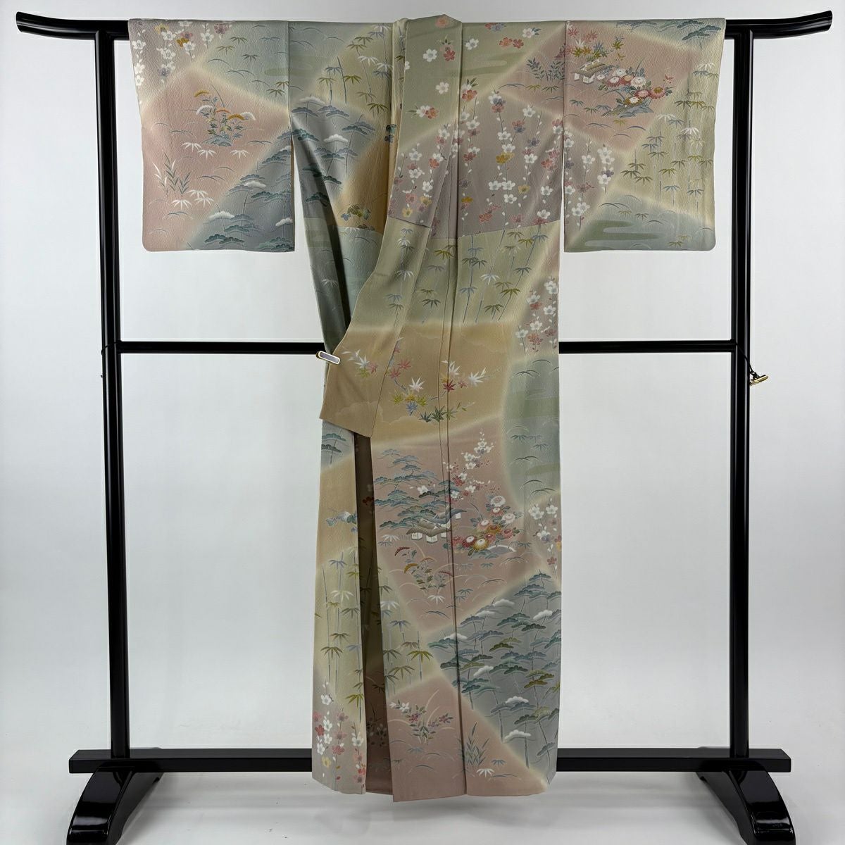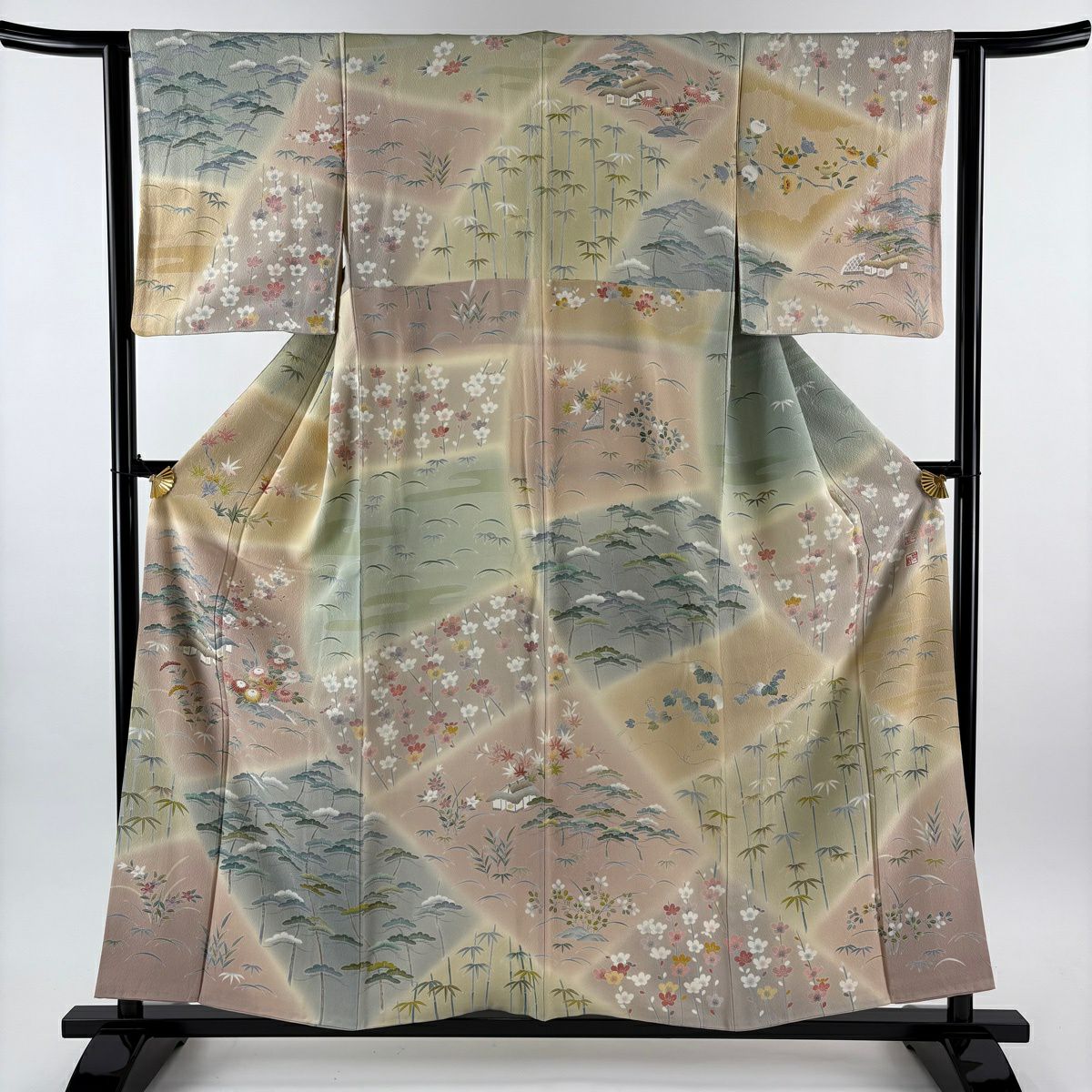 訪問着 身丈157cm 裄丈62cm S 袷 上野為二 落款あり 松竹梅 家屋 金糸 ぼかし 灰緑 正絹 逸品