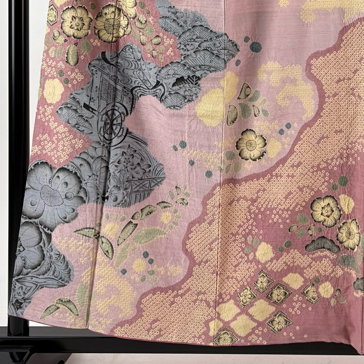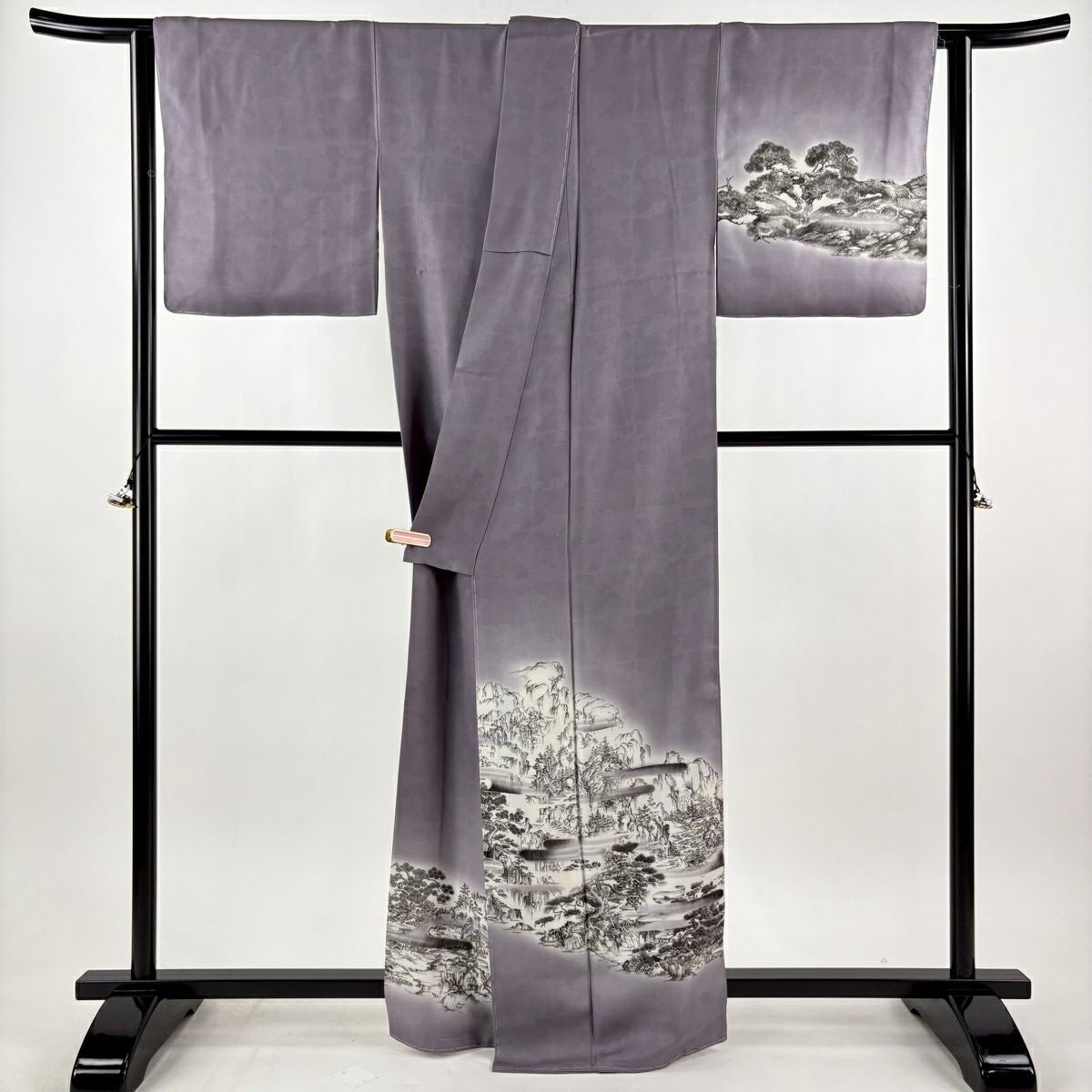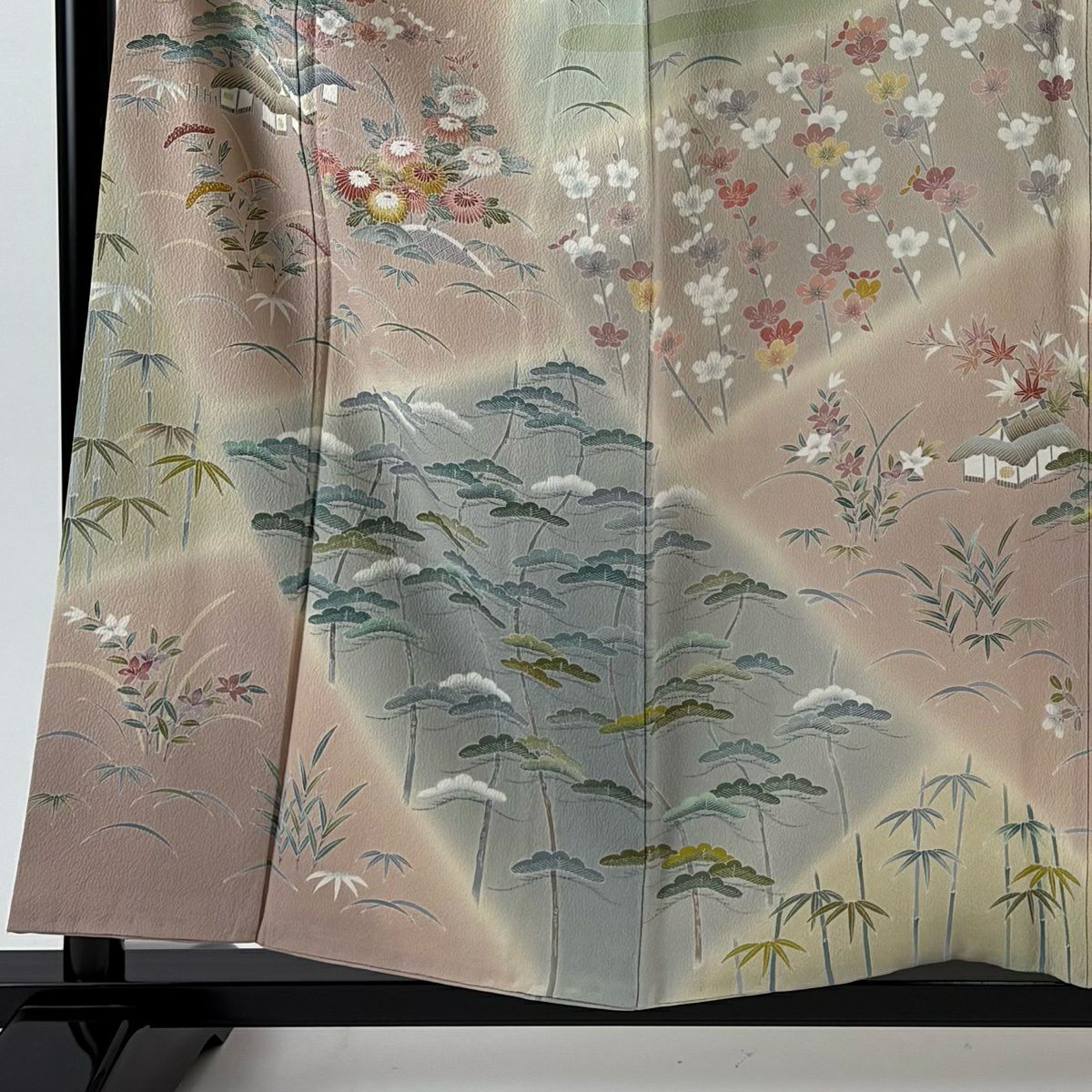 訪問着 身丈157cm 裄丈62cm S 袷 上野為二 落款あり 松竹梅 家屋 金糸 ぼかし 灰緑 正絹 逸品