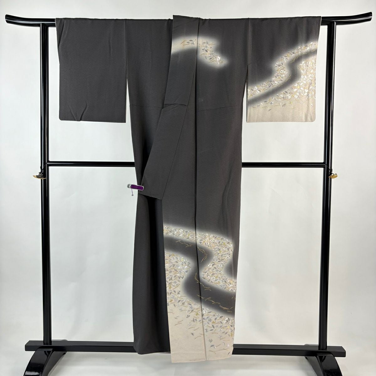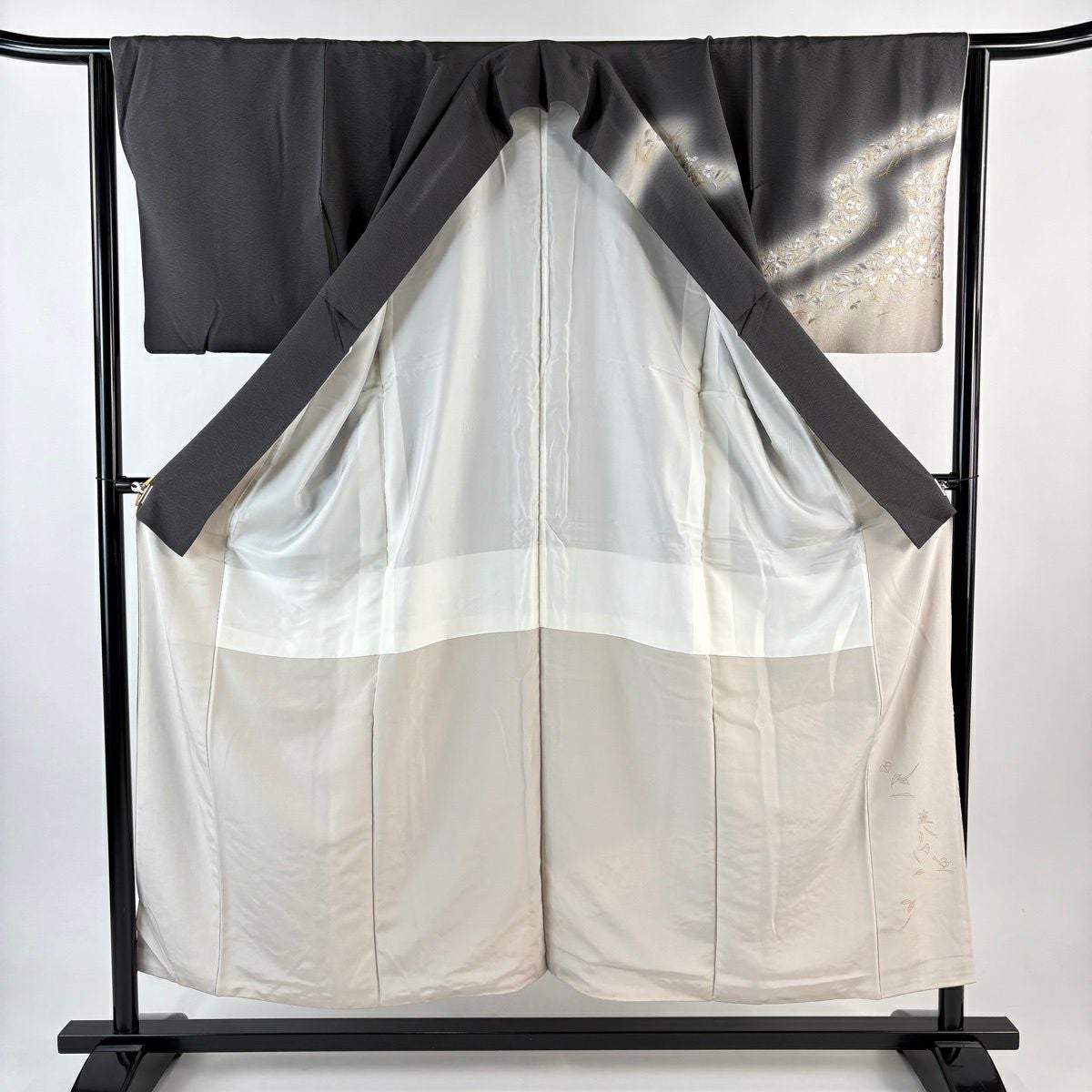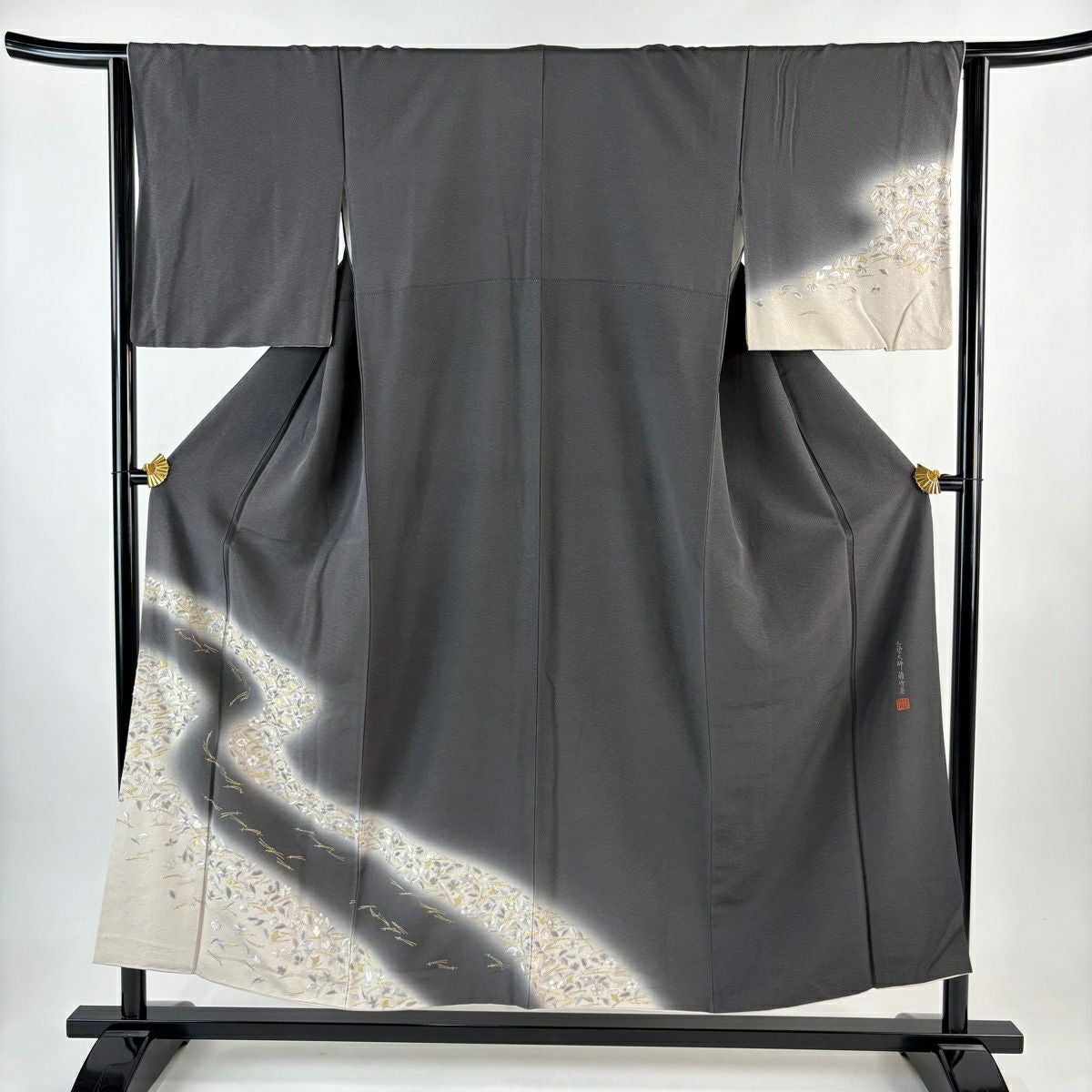 付下げ 身丈153.5cm 裄丈63.5cm S 袷 蒋雪英 落款あり 梅 吹き寄せ 金銀糸 刺繍 灰茶 正絹 逸品