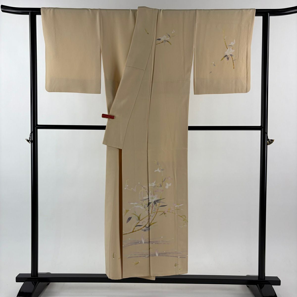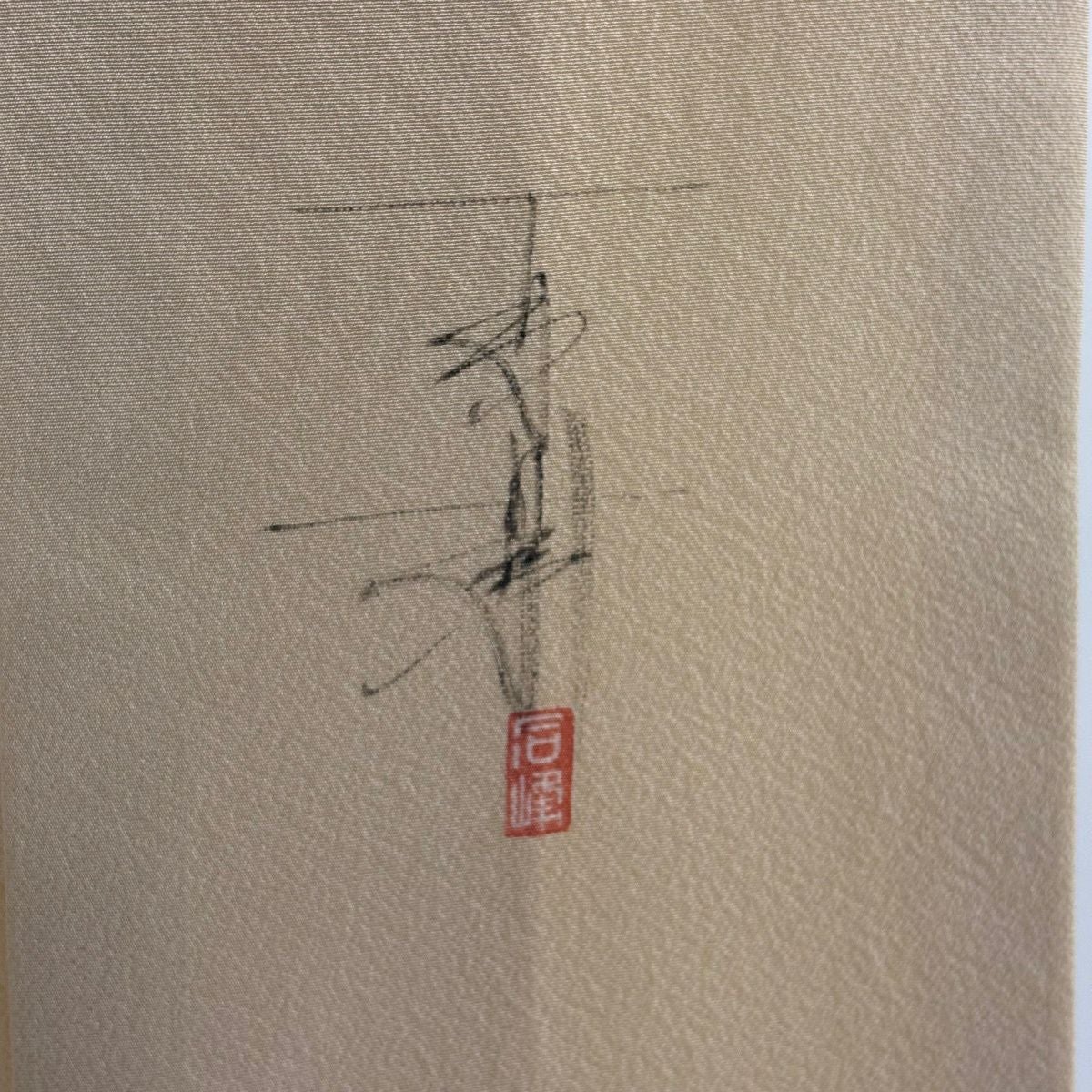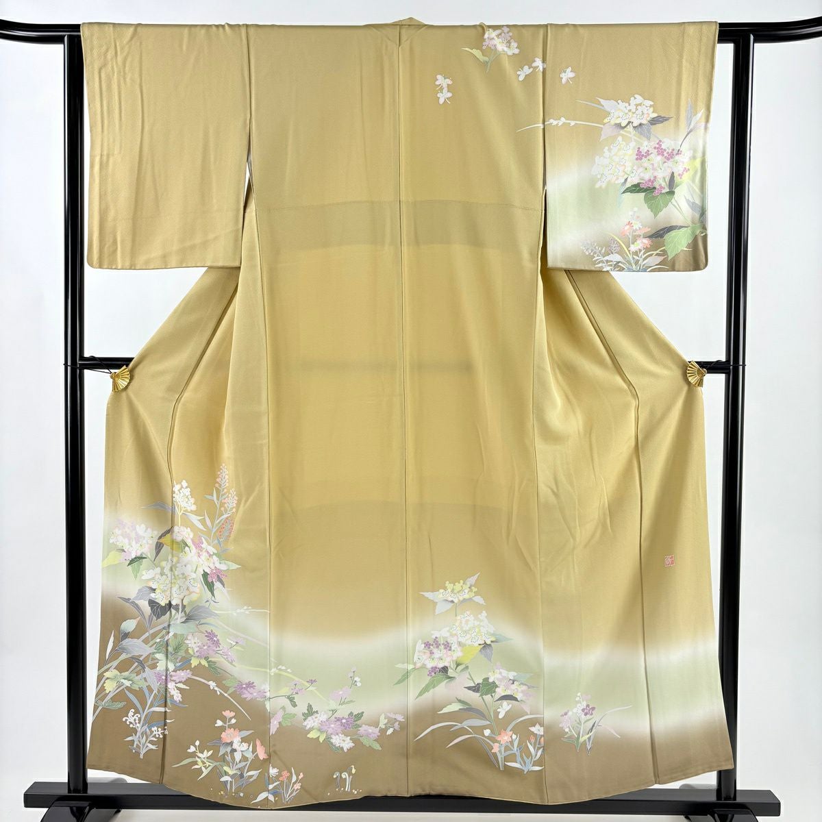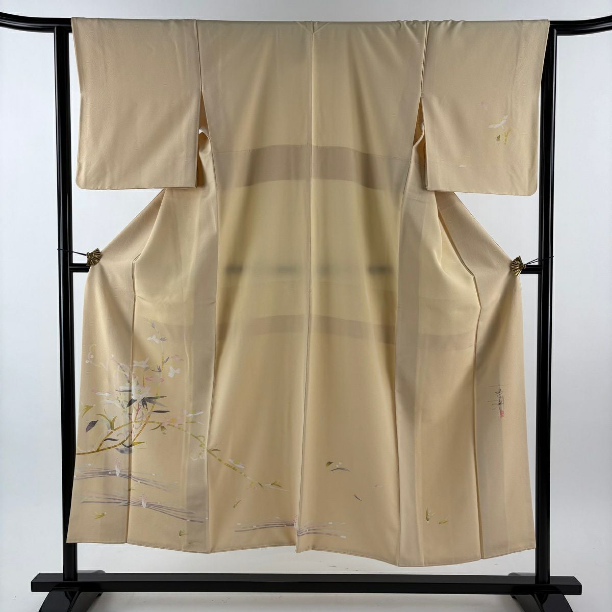 【美品】 付下げ 身丈150.5cm 裄丈63.5cm S 袷 百貫石峰 落款あり 草花 ベージュ 正絹 逸品