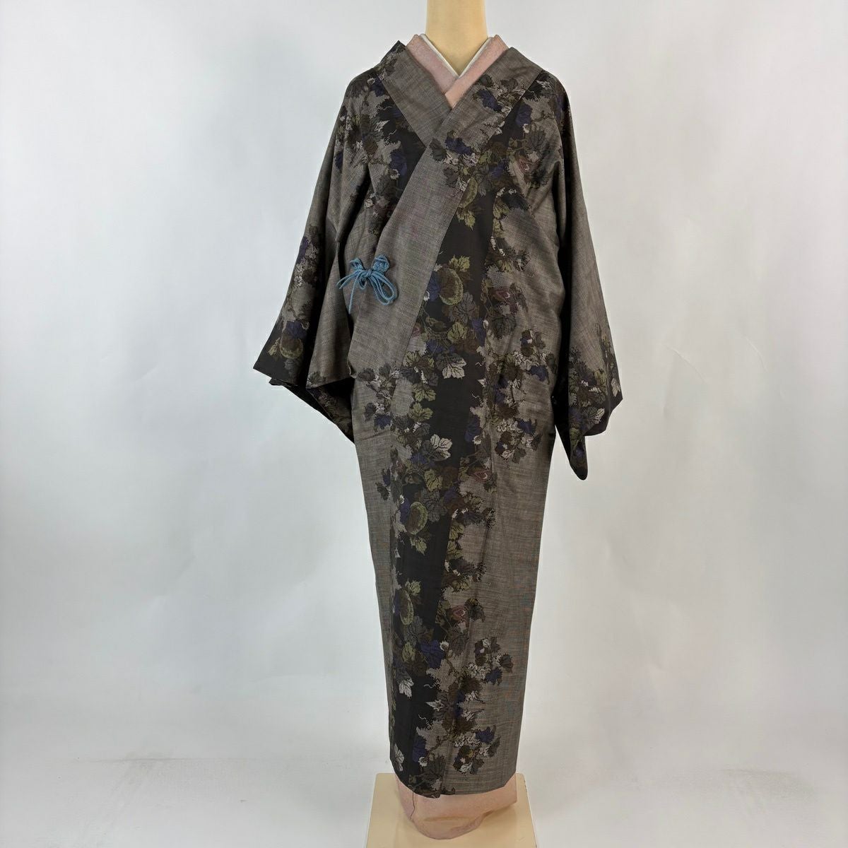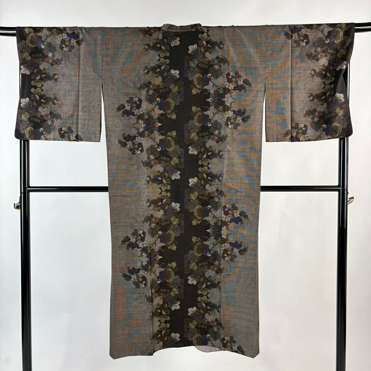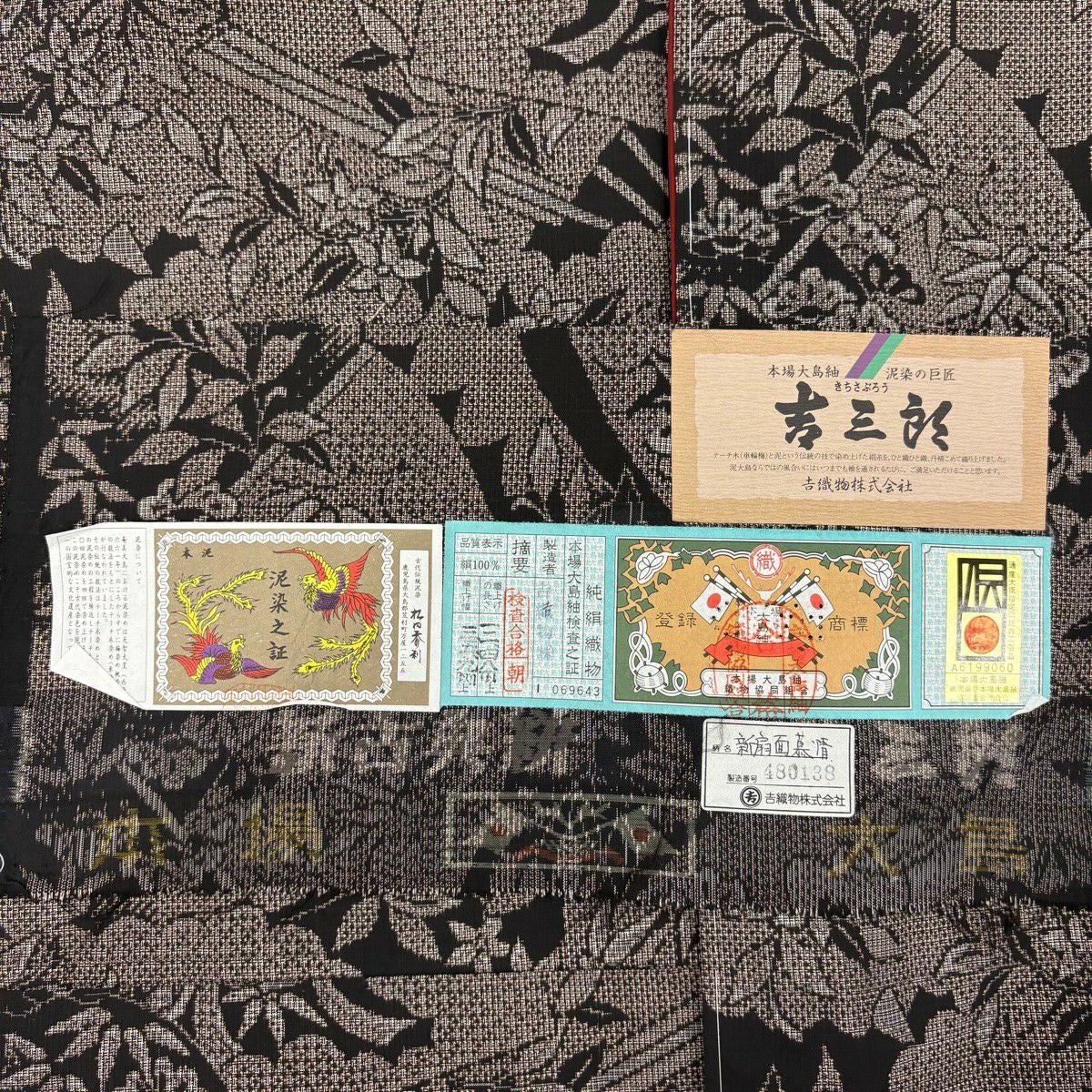 大島紬 身丈164cm 裄丈65.5cm M 袷 都喜ヱ門 証紙あり 短冊 花唐草 純泥染 焦茶色 正絹 逸品