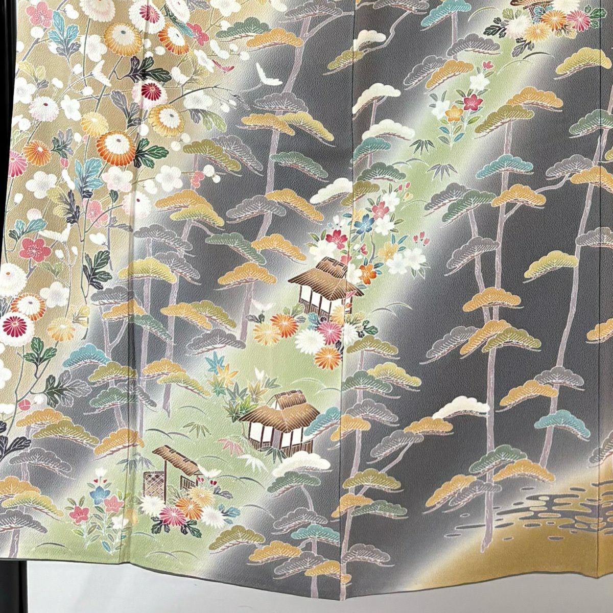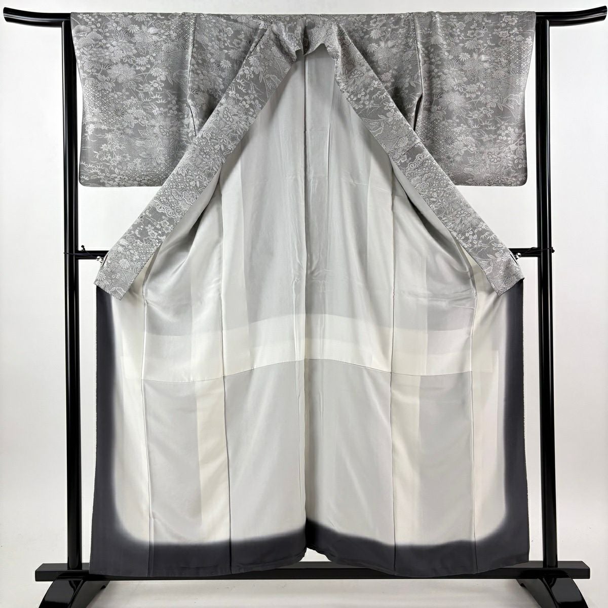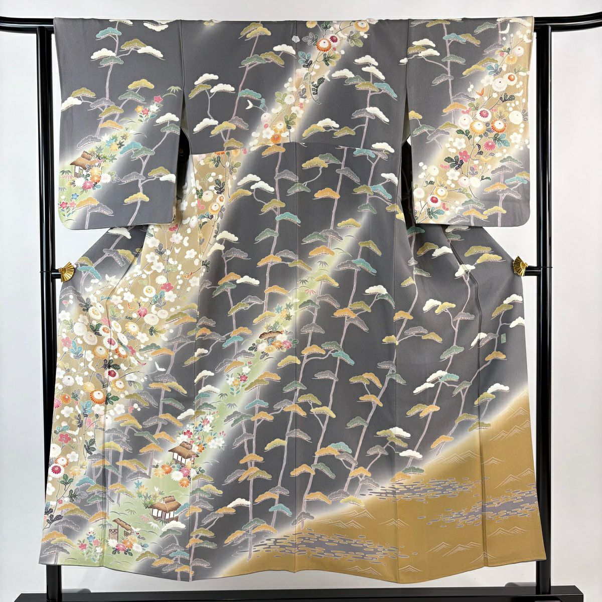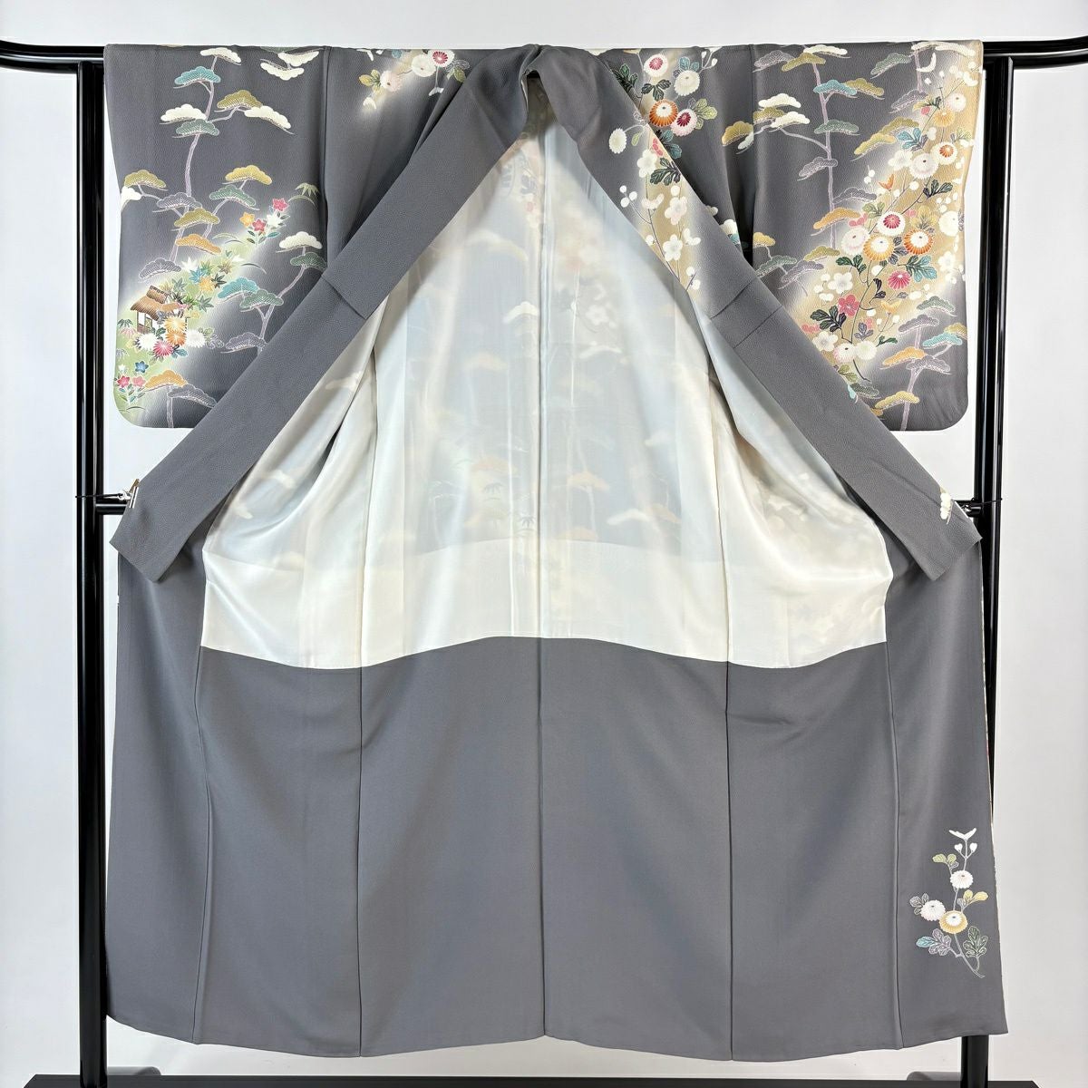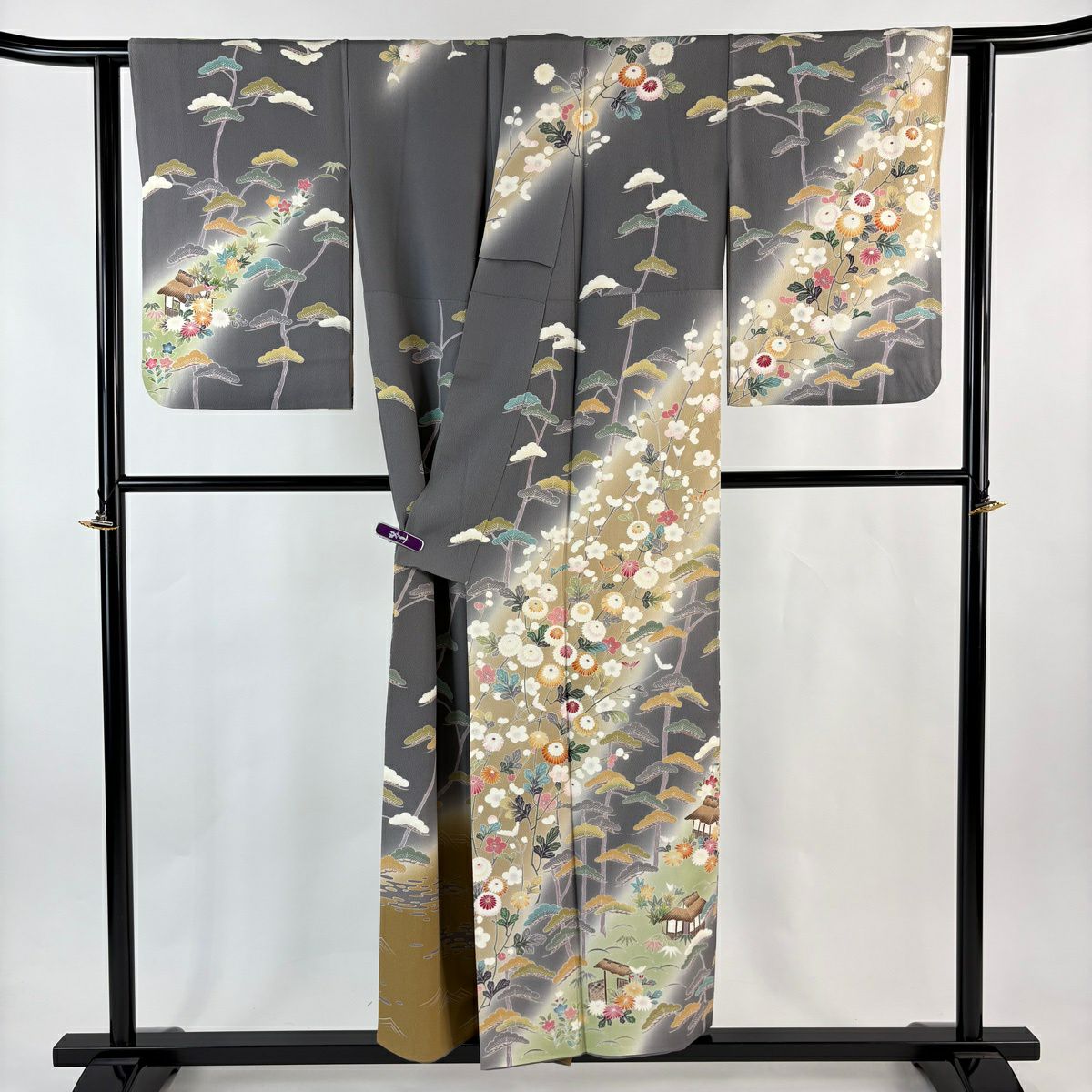 訪問着 身丈151.5cm 裄丈63cm S 袷 落款あり 菊 松梅 金糸 染め分け 灰色 正絹 逸品 一つ紋