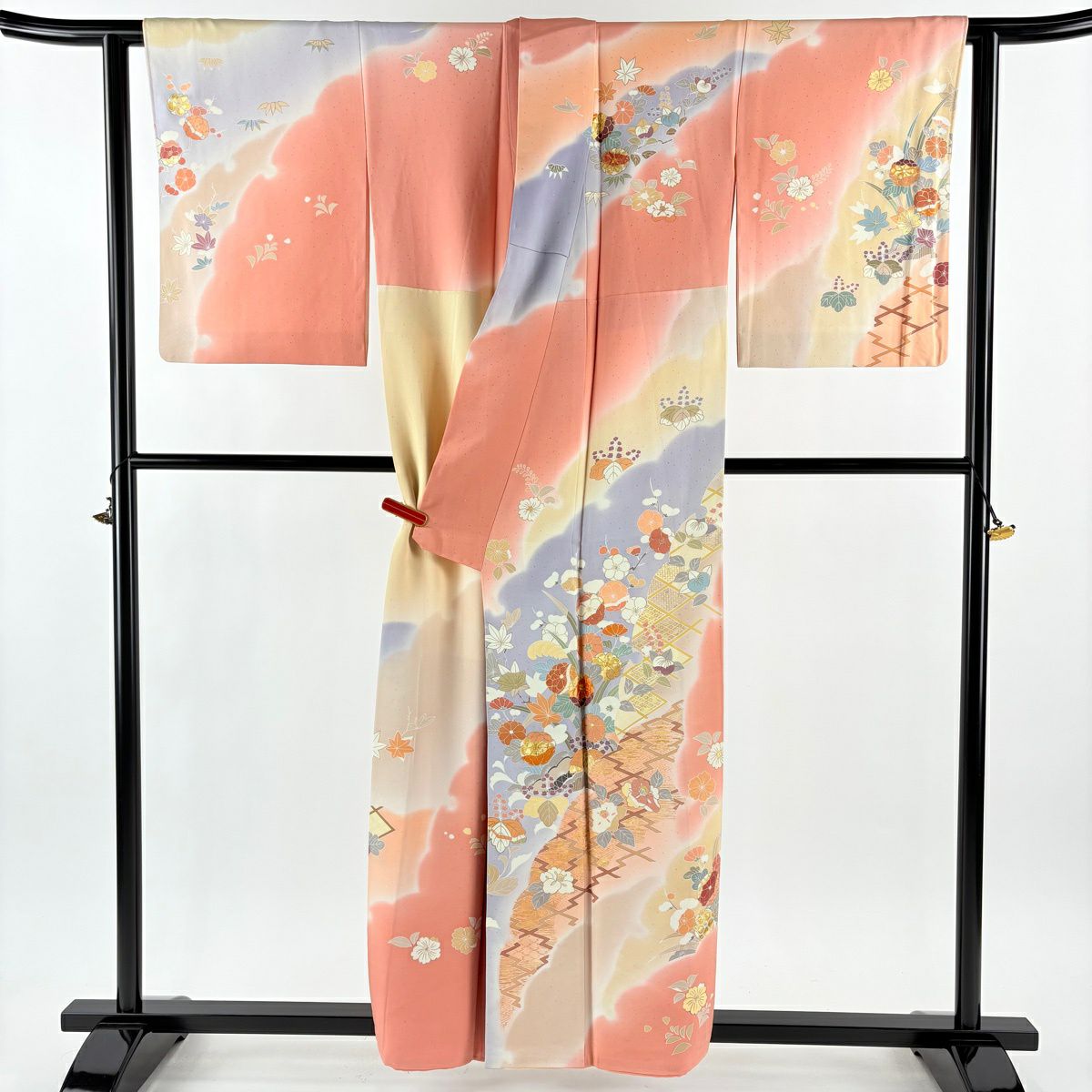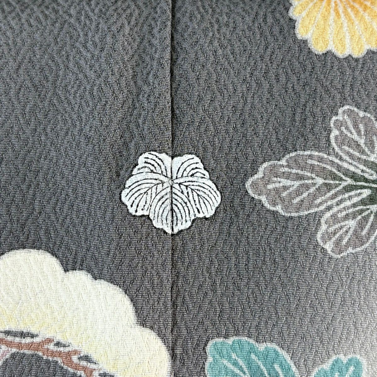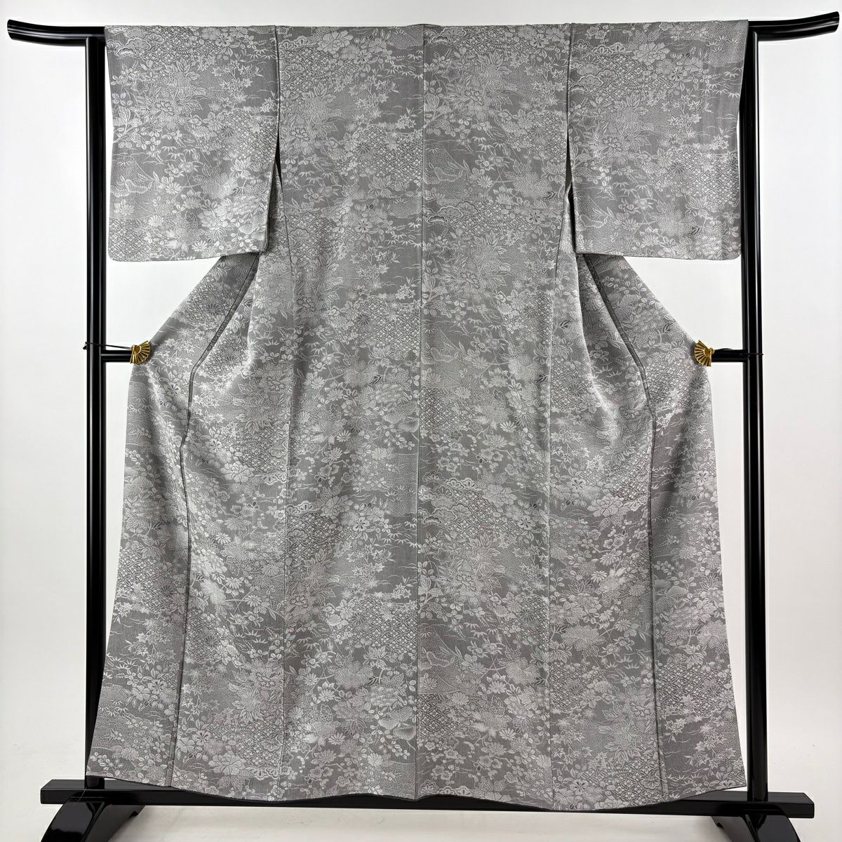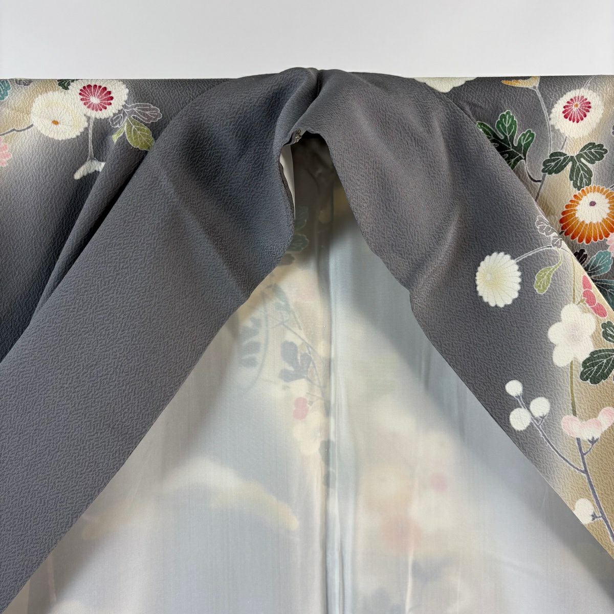 訪問着 身丈151.5cm 裄丈63cm S 袷 落款あり 菊 松梅 金糸 染め分け 灰色 正絹 逸品 一つ紋