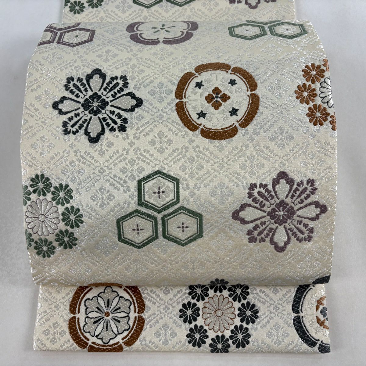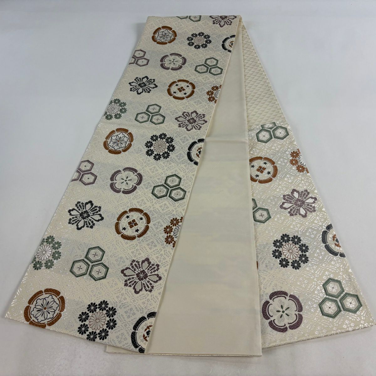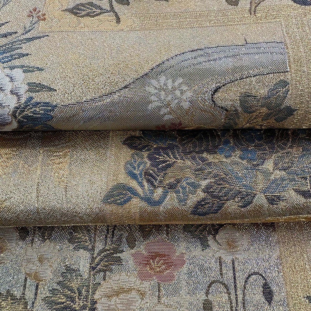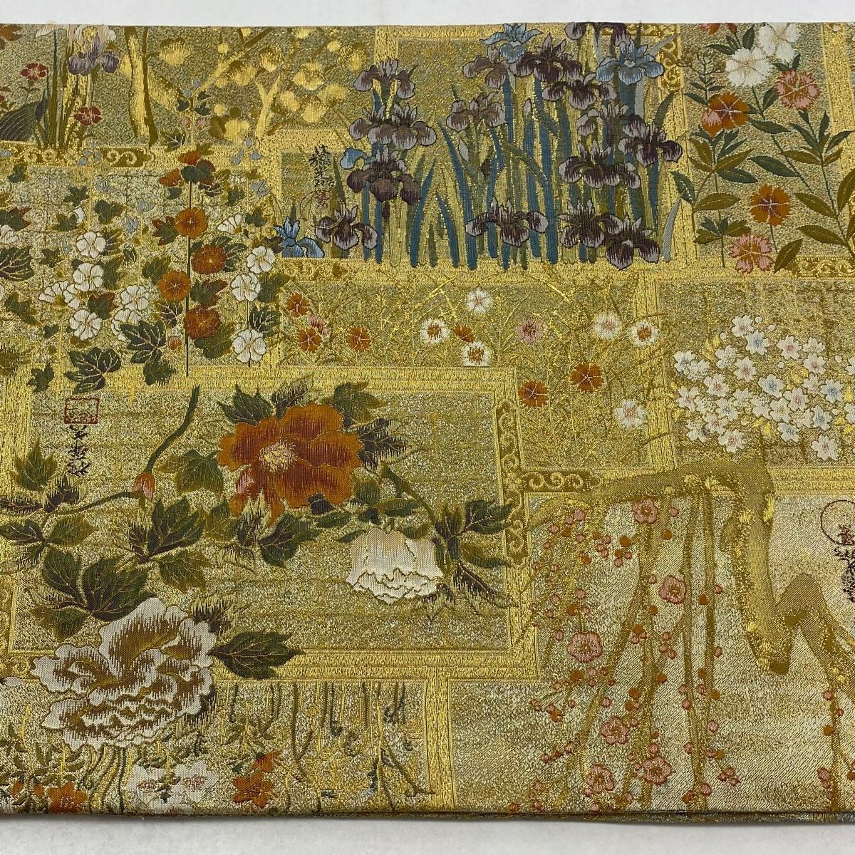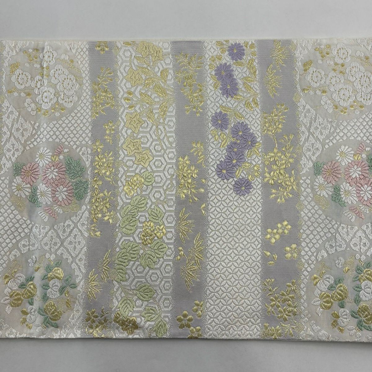 袋帯 逸品 草花 段縞 金糸 唐織 クリーム 六通 正絹
